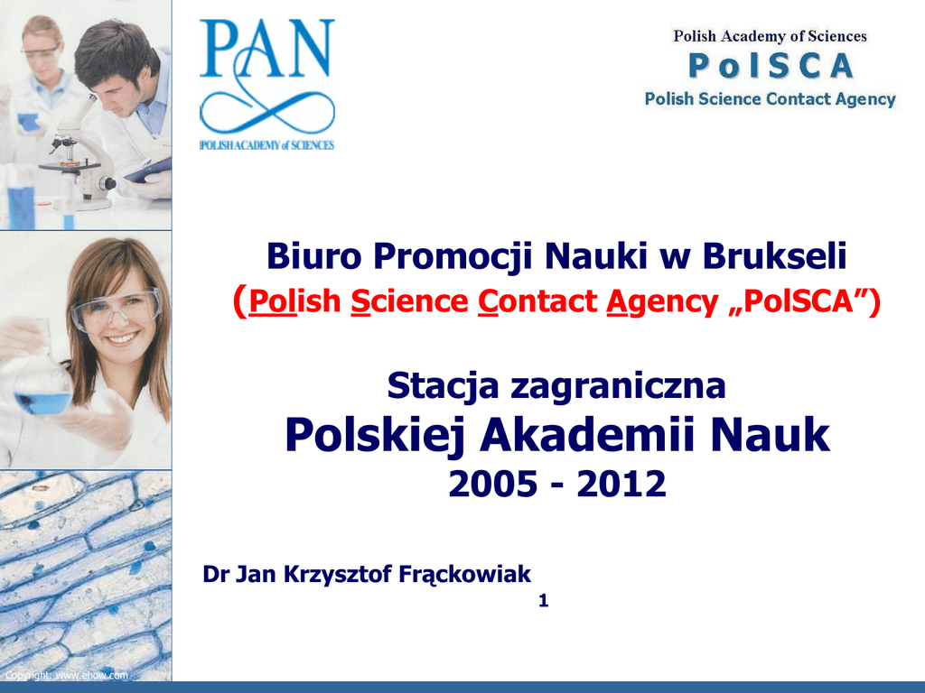 Biuro Promocji Nauki w Brukseli (Polish Science Contact Agency „PolSCA”) Stacja zagraniczna Polskiej Akademii Nauk 2005 - 2012 Dr Jan Krzysztof Frąckowiak 1 Copyright: www.ehow.com Misja Biura Misją Biura PolSCA jest promowanie, ułatwianie i rozwijanie uczestnictwa całego polskiego środowiska naukowego w europejskich projektach i inicjatywach badawczych, a w szczególności - wzrost udziału Polski w programach ramowych badań naukowych i prac rozwojowych Unii Europejskiej. Copyright: www.istockphoto.com Stan prawny Biura Biuro PolSCA jest zarejestrowane sądownie w Belgii jako AISBL (niedochodowe stowarzyszenie międzynarodowe). Biuro składa coroczną deklarację podatkową, ale jest od podatku zwolnione. 2 Copyright: www.thelanguageofleading.com PolSCA – lokalizacja w Brukseli W pobliżu: • Komisja Europejska – Dyrekcja Generalna Badań i Innowacji (DG RTD); • Parlament Europejski European Commission European Parliament Komunikacja: • 5 min. do stacji metra Trône • 3 min. do Place de Luxembourg (ostatni przystanek linii 12 lotniskocentrum) • 2 min. do przystanków kilku linii autobusowych Masa krytyczna: • Kilkanaście biur łącznikowych R&D w budynku, w tym 7 z sieci IGLO (www.iglortd.org) 3 Lokal Biura i jego wykorzystanie Powierzchnia użytkowa 272 m2, 6 pokoi, przestrzeń recepcyjna, salka konferencyjna, kuchenka, toalety Biuro zajmuje 2 pokoje i recepcję; pozostałe pokoje były/są użyczane: IPR Helpdesk (projekt FP7), KPK, DANRO (Dania, dwa pokoje), RCN (Norwegia), FUB (Niemcy, jeden pokój) Biuro jest prawną siedzibą KMM VIN AISBL: wirtualny instytut zaawansowanej inżynierii materiałowej, skupiający 63 instytucje naukowe z 15 krajów UE (uczelnie, instytuty, przemysł) zarządzany przez IPPT PAN (Dyrektor Generalny, „zdalne biuro”) Salka konferencyjna jest udostępniana bezpłatnie partnerom zewnętrznym, głównie biurom z sieci IGLO na zasadzie wzajemności i projektom z polskim udziałem Biuro zatrudnia 3 osoby i oferuje miejsce dla stażystów (dotychczas 6 osób) i dla swoich gości (1 – 2 osoby, po uzgodnieniu) Lokal Biura jest wynajęty na 9 lat – kontrakt z COFINIMMO wygasa „28 lutego 2014 roku o północy” 4 Biuro działa na rzecz: Wszystkich polskich środowisk, instytucji, organizacji, jednostek i zespołów naukowych, publicznych i niepublicznych, w tym zwłaszcza uczestniczących lub zamierzających uczestniczyć w europejskich programach, projektach i inicjatywach, które dotyczą badań naukowych Biuro współpracuje w szczególności z: Polską Akademią Nauk Ministerstwem Nauki i Szkolnictwa Wyższego Narodowym Centrum Badań i Rozwoju Stałym Przedstawicielstwem RP przy UE w Brukseli Ambasadą RP w Brukseli Krajowym Punktem Kontaktowym Programów Badawczych UE Podmiotami zagranicznymi (KE, PE, IGLO, inne, głównie w Brukseli) Biurami Regionalnymi Województw, mających przedstawicielstwo w Brukseli Polską Platformą Technologii Środowiskowych 5 Najważniejsze zadania Biura Promocja i wsparcie eksperckie uczestnictwa polskich partnerów w Programach Ramowych UE, w tym współpracujących z nimi osób i instytucji z europejskich środowisk naukowych. Dotyczy to zwłaszcza znaczących projektów, których strona polska jest koordynatorem lub istotnym uczestnikiem Pomoc w poszukiwaniu partnerów dla indywidualnych wnioskodawców, wsparcie eksperckie na etapie inicjowania i formułowania wniosków, a także negocjowania kontraktów Zadania eksperckie, w tym doradztwo na rzecz zainteresowanych instytucji, zespołów i osób, zarówno krajowych, jak i zagranicznych Udział w eksperckich gremiach doradczych Komisji Europejskiej, proponowanie odpowiednich kandydatur z Polski Wspieranie (lub sprzeciw wobec) projektów postanowień organów UE, na podstawie konsultacji z polskimi środowiskami naukowymi Organizowanie spotkań, seminariów i narad z udziałem ekspertów z kraju, z organów UE, z zagranicy; ostatnio także wystaw promujących polski wkład do nauki światowej ZASADA: podejmowanie działań, których nie można taniej i skuteczniej wykonać w kraju 6 Spotkania z cyklu „PolSCA Meetings” Nieformalny, kameralny charakter – duży udział pytań i odpowiedzi Tematy zgodne z programami roboczymi FP6-FP7 i/albo z tematami przygotowywanych do złożenia projektów Kilku do kilkunastu uczestników, z których większość przygotowuje krótkie prezentacje (standard: 15 minut) Uczestnicy: naukowcy oraz eksperci z Polski i z zagranicy; zawsze 1 – 2 ekspertów z Komisji Europejskiej odpowiedzialnych za dany konkurs Czasem PM jest współorganizowane z zainteresowanym podmiotem zagranicznym, zwłaszcza z sieci IGLO Główne cele: wymiana informacji, promocja polskich kierunków badań i konkretnych projektów, poprawa szans składanych wniosków, znalezienie potencjalnych partnerów W latach 2006 – 2012 zorganizowano 105 PolSCA Meetings 7 Konferencje z cyklu „PolSCA Seminars” Szeroka tematyka i elastyczna formuła organizacyjna Tematy: wybrane, ważne dla polskiej nauki obszary badań, także problemy założeń, instrumentów i realizacji krajowej i zagranicznej polityki naukowej Kilkunastu do kilkudziesięciu (nawet kilkuset) uczestników: zainteresowanych ekspertów z europejskich środowisk naukowych, instytucji Unii Europejskiej, zagranicznych organizacji naukowych lub ich sieci w Brukseli PS są często współorganizowane z partnerami – polskimi i zagranicznymi Najczęściej od 1. – do 3. prezentacji krajowych; przeważnie też kilka zagranicznych, w tym z Komisji Europejskiej i Parlamentu Europejskiego Główne cele: promocja polskiej nauki i jej osiągnięć, nawiązywanie i rozwijanie współpracy polskich jednostek naukowych z europejskimi ośrodkami i zespołami naukowymi W latach 2006 – 2012 zorganizowano 36 PolSCA Seminars 8 PolSCA Meetings, PolSCA Seminars 2006-2012 Nr Priorytet Liczba 1 Zdrowie (Health) 14 9,9% 2 Żywność, rolnictwo, rybołówstwo i biotechnologia (KBBE) 14 9,9% 3 Te