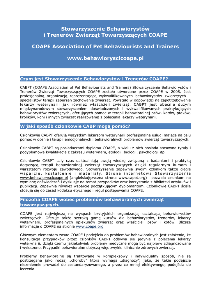 Stowarzyszenie Behawiorystów i Trenerów Zwierząt Towarzyszących COAPE COAPE Association of Pet Behaviourists and Trainers www.behawioryscicoape.pl Czym jest Stowarzyszenie Behawiorystów i Trenerów COAPE? CABPT (COAPE Association of Pet Behaviourists and Trainers) Stowarzyszenie Behawiorystów i Trenerów Zwierząt Towarzyszących COAPE zostało utworzone przez COAPE w 2005. Jest profesjonalną organizacją reprezentującą wykwalifikowanych behawiorystów zwierzęcych – specjalistów terapii zaburzeń zachowania zwierząt. Powstało w odpowiedzi na zapotrzebowanie lekarzy weterynarii jak również właścicieli zwierząt. CABPT jest obecnie dużym międzynarodowym stowarzyszeniem doświadczonych i wykwalifikowanych praktykujących behawiorystów zwierzęcych, oferujących pomoc w terapii behawioralnej psów, kotów, ptaków, królików, koni i innych zwierząt realizowanej z polecenia lekarzy weterynarii. W jaki sposób członkowie CABP mogą pomóc? Członkowie CABPT oferują wszystkim lekarzom weterynarii profesjonalne usługi mające na celu pomoc w ocenie i terapii emocjonalnych i behawioralnych problemów zwierząt towarzyszących. Członkowie CABPT są posiadaczami dyplomu COAPE, a wielu z nich posiada stosowne tytuły i podyplomowe kwalifikacje z zakresu weterynarii, etologii, biologii, psychologii itp. Członkowie CABPT cały czas uaktualniają swoją wiedzę związaną z badaniami i praktyką dotyczącą terapii behawioralnej zwierząt towarzyszących dzięki regularnym kursom i warsztatom rozwoju zawodowego. Stowarzyszenie zapewnia swoim członkom także ciągłe w s p a r c i e , k s z t a ł c e n i e i m a t e r i a ł y. S t r o n a i n t e r n e t o w a S t o w a r z y s z e n i a www.behawioryscicoape.pl (angielskojęzyczna strona www.capbt.org) pozwala członkom na wymianę doświadczeń i dyskusje na temat przypadków oraz korzystanie z biblioteki artykułów i publikacji. Zapewnia również wsparcie początkującym dyplomantom. Członkowie CABPT ściśle stosują się do zasad kodeksu etycznego i reguł postępowania COAPE. Filozofia COAPE wobec problemów behawioralnych zwierząt towarzyszących. COAPE jest największą na wyspach brytyjskich organizacją kształcącą behawiorystów zwierzęcych. Oferuje także szeroką gamę kursów dla behawiorystów, trenerów, lekarzy weterynarii, profesjonalnych opiekunów zwierząt oraz właścicieli psów i kotów. Bliższe informacje o COAPE na stronie www.coape.org Głównym elementem zasad COAPE i podejścia do problemów behawioralnych jest założenie, że konsultacja przypadków przez członków CABPT odbywa się jedynie z polecenia lekarzy weterynarii, dzięki czemu jakiekolwiek problemy medyczne mogą być najpierw zdiagnozowane i wyleczone. Przypadki behawioralne dotyczą więc zwykle klinicznie zdrowych zwierząt. Problemy behawioralne są traktowane w kompleksowy i indywidualny sposób, nie są postrzegane jako rodzaj „choroby” która wymaga „diagnozy”, jako, że takie podejście niezmiennie prowadzi do zestandaryzowanego, a przez co mniej efektywnego, podejścia do leczenia. Stosując opracowany przez COAPE model oceny zachowania i monitorowania terapii zachowania EMRA najpierw ocenia się stan emocjonalny zwierzęcia w czasie prezentowania problemowego zachowania, jego samopoczucie emocjonalne (nastrój) na co dzień oraz identyfikuje się wszelkie czynniki zewnętrzne i wewnętrzne, wzmacniające i utrwalające zachowanie. Na podstawie takiej oceny zachowania wdrażany jest praktyczny plan terapii, który pomaga zwierzęciu nauczyć się nowych i pożądanych zachowań, a właściciele uczą się wzmacniać i utrzymywać je w przyszłości. Eliminuje się także czynniki wzmacniające dotychczasowe, problemowe zachowanie, jeśli to konieczne we współpracy z lekarzem weterynarii. Dyrektorzy COAPE Peter Neville DHc BSc(Hons), Val Strong MSc, Robert Falconer-Taylor BVetMed DipCABT MRCVS Dyplom Behawiorysty COAPE Dyplom COAPE, którym legitymują się członkowie Stowarzyszenia, jest oceniany i certyfikowany przez National Open College Network (www.nocn.org,uk) największą brytyjską sieć wydającą akredytacje w nauczaniu dorosłych. Wszystkie kursy COAPE akredytowane przez NOCN są na poziomie Award, Certificate lub Diploma i COAPE Diploma jest oceniony na 13+. Jest to najwyższy poziom oferowany przez NOCN i zapewnia właściwe akademickie i praktyczne wprowadzenie do przedmiotu terapii behawioralnej zwierząt domowych. Twoim lokalnym Behawiorystą Zwierząt Towarzyszących COAPE jest: Patrycja Pisula ul. Fredry 19/4 39-200 Dębica telefon: 724 602 922 e-mail: [email protected] www: www.patrycjabehawiorysta.pl Opis działalności: Absolwentka Kursu Dyplomowego COAPE: “ADVANCED DIPLOMA IN THE PRACTICAL ASPECTS OF COMPANION ANIMAL BEHAVIOUR AND TRAINING”. Behawiorysta zwierzęcy COAPE od 2015 r. Swoją praktykę realizuje w województwie podkarpackim, jak również w Tarnowie i okolicach. Zajmuje się terapią zaburzeń zachowania zwierząt towarzyszących, wychowaniem szczeniąt, pomaga w wyborze pupila ze schroniska jak również z hodowli oraz prowadzi szkolenia indywidualne psów. Współpracuje z hodowlami FCI. Absolwentka wielu seminariów oraz szkoleń związanych z zachowaniem psów i kotów oraz dobrostanem zwierząt towarzyszących. Nieustannie poszerza swoją wiedzę. Członek Stowarzyszenia Behawiorystów i Trenerów COAPE www.behawioryscicoape.pl. Tutor kursu korespondencyjnego „Szkoła dla psów – podstawy wiedzy o zachowaniu i szkoleniu psów” w COAPE Polska.