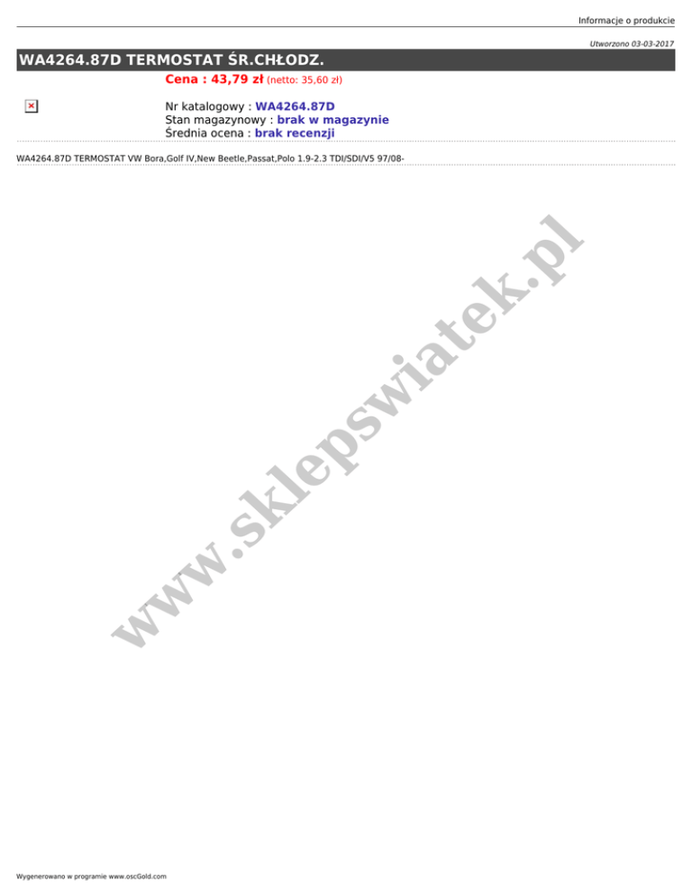 Informacje o produkcie Utworzono 03-03-2017 WA4264.87D TERMOSTAT ŚR.CHŁODZ. Cena : 43,79 zł (netto: 35,60 zł) Nr katalogowy : WA4264.87D Stan magazynowy : brak w magazynie Średnia ocena : brak recenzji w w w .s kl ep sw ia te k. pl WA4264.87D TERMOSTAT VW Bora,Golf IV,New Beetle,Passat,Polo 1.9-2.3 TDI/SDI/V5 97/08- Wygenerowano w programie www.oscGold.com