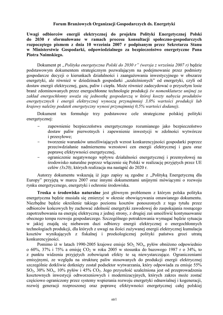 Forum BranŜowych Organizacji Gospodarczych ds. Energetyki Uwagi odbiorców energii elektrycznej do projektu Polityki Energetycznej Polski do 2030 r sformułowane w ramach procesu konsultacji społeczno-gospodarczych rozpoczętego pismem z dnia 10 września 2007 r podpisanym przez Sekretarza Stanu w Ministerstwie Gospodarki, odpowiedzialnego za bezpieczeństwo energetyczne Pana Piotra Naimskiego. Dokument pt „Polityka energetyczna Polski do 2030 r” (wersja z września 2007 r) będzie podstawowym dokumentem strategicznym pozwalającym na podejmowanie przez podmioty gospodarcze decyzji o kierunkach działalności i zaangaŜowania inwestycyjnego w obszarze energetyki, ale równieŜ w dziedzinach gospodarki „uzaleŜnionych” od energetyki, czyli od dostaw energii elektrycznej, gazu, paliw i ciepła. MoŜe równieŜ zadecydować o przyszłym losie branŜ zdominowanych przez energochłonne technologie produkcji (w nomenklaturze unijnej za zakład energochłonny uwaŜa się jednostkę gospodarczą w której koszty nabycia produktów energetycznych i energii elektrycznej wynoszą przynajmniej 3,0% wartości produkcji lub krajowy naleŜny podatek energetyczny wynosi przynajmniej 0,5% wartości dodanej). Dokument energetycznej: - - - ten formułuje trzy podstawowe cele strategiczne polskiej polityki zapewnienie bezpieczeństwa energetycznego rozumianego jako bezpieczeństwo dostaw paliw pierwotnych i zapewnienie inwestycji w zdolności wytwórcze i przesyłowe; tworzenie warunków umoŜliwiających wzrost konkurencyjności gospodarki poprzez przeciwdziałanie nadmiernemu wzrostowi cen energii elektrycznej i gazu oraz poprawę efektywności energetycznej, ograniczenie negatywnego wpływu działalności energetycznej i przemysłowej na środowisko naturalne poprzez włączenie się Polski w realizację przyjętych przez UE celów (3x20), których realizacja ma nastąpić do 2020 r. Autorzy dokumentu wskazują iŜ jego zapisy są zgodne z „Polityką Energetyczną dla Europy” przyjętą w marcu 2007 oraz innymi dokumentami unijnymi mówiącymi o rozwoju rynku energetycznego, energetyki i ochronie środowiska. Troska o środowisko naturalne jest głównym problemem z którym polska polityka energetyczna będzie musiała się zmierzyć w okresie obowiązywania omawianego dokumentu. Niezbędne będzie określenie takiego poziomu kosztów ponoszonych z tego tytułu przez odbiorców końcowych by zachować zdolność energetyki zawodowej do zaspokajania rosnącego zapotrzebowania na energię elektryczną z jednej strony, z drugiej zaś umoŜliwić kontynuowanie obecnego tempa rozwoju gospodarczego. Szczególnego potraktowania wymagać będzie sytuacja w jakiej znajdą się niebawem duzi odbiorcy energii elektrycznej o energochłonnych technologiach produkcji, dla których z uwagi na ilości zuŜywanej energii elektrycznej kumulacja kosztów wynikających z fiskalnej i proekologicznej polityki państwa grozi utratą konkurencyjności. Pomimo iŜ w latach 1990-2005 krajowe emisje SO2, NOx, pyłów obniŜono odpowiednio o 60%, 37% i 75% a emisję CO2 w roku 2005 w stosunku do bazowego 1987 r o 34%, to z punktu widzenia przyjętych zobowiązań efekty te są niewystarczające. Ograniczeniami emisyjnymi, ze względu na strukturę paliw stosowanych do produkcji energii elektrycznej szczególnie dotkliwie dotknięty został podsektor wytwarzania, który odpowiada za emisje 55% SO2, 30% NOx, 10% pyłów i 45% CO2. Jego przyszłość uzaleŜniona jest od przeprowadzenia kosztownych inwestycji odtworzeniowych i modernizacyjnych, których zakres moŜe zostać częściowo ograniczony przez systemy wspierania rozwoju energetyki odnawialnej i kogeneracji, rozwój generacji rozproszonej oraz poprawę efektywności energetycznej całej polskiej str1 gospodarki. Środki te pozwalają na zmniejszenie szkodliwego wpływu działalności gospodarczej na środowisko naturalne. Dla polskiego przemysłu są jednak przede wszystkim źródłem dodatkowych obciąŜeń które znajdują swoje odzwierciedlenie w cenie kupowanej energii elektrycznej. W zakresie efektywności energetycznej szczególne znaczenie będą miały ostateczne zapisy tworzonej właśnie Ustawy o efektywności energetycznej. Ma ona wdroŜyć postanowienia dyrektywy 2006/32/WE Parlamentu Europejskiego i Rady Europy z dnia 5 kwietnia 2006 r. w sprawie efektywności końcowego wykorzystania energii i usług energetycznych. W polskim wydaniu moŜe się ona stać kolejnym narzędziem wprowadzenia do elektroenergetyki nowoczesnych technologii (podczas gdy w innych krajach Unii Europejskiej wspiera ona jedynie poprawę efektywności końcowego zuŜywania energii, a jej głównymi beneficjentami są odbiorcy końcowi). Z treści Polityki energetycznej Polski do 2030 r” wynika iŜ w ciągu ostatnich 10 lat (lata 1994-2005) krajowe zuŜycie energii finalnej zmniejszyło się o 6,1%, średnioroczne zmniejszenie energochłonności PKB wyniosło 4,7%, a spadek energochłonności w przemyśle 5,5%. NaleŜy podkreślić iŜ jest to efekt długotrwałego procesu restrukturyzacji polskich zakładów przemysłowych zapoczątkowanego po 1990 r. Wprowadzenie reguł rynkowych, międzynarodowa konkurencja i rynek konsumenta stały się przyczyną redukcji kosztów, optymalizacji zakładowych gospodarek energetycznych oraz wprowadzania energooszczędnych technologii i urządzeń bez konieczności odwoływania się do metod administracyjnych. Proces ten nie był jednak powszechny i nie objął sektora energetycznego. W omawianym okresie wybudowano tylko jedno znaczące dla krajowego systemu energetycznego źródło energii elektrycznej (blok o mocy 464 MW w elektrowni Pątnów), nie inwestowano w sposób wystarczający w rozbudowę sieci przesyłowych, dystrybucyjnych ani teŜ w połączenia transgraniczne. W efekcie istniejąca struktura sieciowa stała się barierą dla swobodnego, równomiernego na obszarze całego kraju rozwoju gospodarczego. Pojawiły się więc koncep