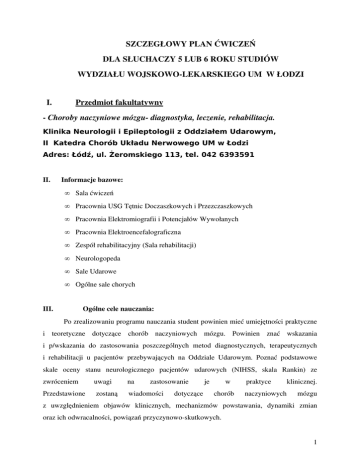 SZCZEGŁOWY PLAN ĆWICZEŃ DLA SŁUCHACZY 5 LUB 6 ROKU STUDIÓW WYDZIAŁU WOJSKOWOLEKARSKIEGO UM W ŁODZI I. Przedmiot fakultatywny Choroby naczyniowe mózgu diagnostyka, leczenie, rehabilitacja. Klinika Neurologii i Epileptologii z Oddziałem Udarowym, II Katedra Chorób Układu Nerwowego UM w Łodzi Adres: Łódź, ul. Żeromskiego 113, tel. 042 6393591 II. Informacje bazowe: III. • Sala ćwiczeń • Pracownia USG Tętnic Doczaszkowych i Przezczaszkowych • Pracownia Elektromiografii i Potencjałów Wywołanych • Pracownia Elektroencefalograficzna • Zespół rehabilitacyjny (Sala rehabilitacji) • Neurologopeda • Sale Udarowe • Ogólne sale chorych Ogólne cele nauczania: Po zrealizowaniu programu nauczania student powinien mieć umiejętności praktyczne i teoretyczne dotyczące chorób naczyniowych mózgu. Powinien znać wskazania i p/wskazania do zastosowania poszczególnych metod diagnostycznych, terapeutycznych i rehabilitacji u pacjentów przebywających na Oddziale Udarowym. Poznać podstawowe skale oceny stanu neurologicznego pacjentów udarowych (NIHSS, skala Rankin) ze zwróceniem uwagi na zastosowanie je w praktyce klinicznej. Przedstawione zostaną wiadomości dotyczące chorób naczyniowych mózgu z uwzględnieniem objawów klinicznych, mechanizmów powstawania, dynamiki zmian oraz ich odwracalności, powiązań przyczynowoskutkowych. 1 Studenci zapoznają się ze standardami leczenia chorób naczyniowych, metodami rehabilitacji oraz ze znaczeniem edukacji chorego, prewencji pierwotnej i wtórnej. Student poprowadzi dokumentację kliniczną i proces rehabilitacyjny możliwy do zrealizowany w Klinice Neurologii. IV. Główne formy nauczania z podaniem siatki godzin w semestrach i latach studiów. Ćwiczenia: Ćwiczenia z chorób naczyniowych mózgu obejmują blok składający się z 5 ćwiczeń, po 4 godziny dydaktyczne łącznie 20 godzin. Rozliczanie godzin (dla jednej grupy studenckiej) Lp. Semestr jesienny Razem V. Seminaria 5 5 Ćwiczenia 15 15 Razem 20 20 Forma zaliczenia Egzamin Metody nauczania: Nauczanie w zakresie chorób naczyniowych mózgu składa się z dwóch zasadniczych części seminariów i ćwiczeń. Seminaria i ćwiczenia obejmują tematykę pomocną w podejmowaniu decyzji diagnostycznych i terapeutycznych, mających na celu zmniejszenie skutków chorób naczyniowych mózgu, ze szczególnym uwzględnieniem udarów mózgu. Badanie chorego z chorobą mózgowonaczyniową. Ćwiczenia obejmują treści, których studenci nie znajdą w obowiązujących podręcznikach. 2 W czasie odrabiania ćwiczeń studenci uczestniczą w obchodach klinicznych, referują historię choroby przydzielonego chorego do badania proponują program diagnostyki, leczenia oraz rehabilitacji. Ćwiczenia odbywają się w Klinice Neurologii i Epileptologii z Oddziałem Udarowym UM w Łodzi zgodnie z harmonogramem opracowanym przez Dziekanat Wydziału WojskowoLekarskiego. Czas trwania ćwiczeń : 8.1511.25 ( 4 godziny dydaktyczne). Każda grupa studencka dzielona jest po pierwszej godzinie seminarium na dwie podgrupy, które ćwiczą praktycznie pod kierunkiem nauczyciela akademickiego. VI. Rygory dydaktyczne. Zajęcia z chorób naczyniowych mózgu kończą się egzaminem. Warunkiem dopuszczenia do egzaminu jest zaliczenie bloku ćwiczeniowego oraz udział w wykładach. Treści programowe: Ćwiczenie I. Temat: Patogeneza i epidemiologia chorób naczyniowych mózgu. Udar mózgu zasady postępowania. Część 1. Patogeneza, klasyfikacja i epidemiologia chorób naczyniowych mózgu. Czynniki ryzyka. Deklaracja Helsingborska. Biochemia mózgu chorego w warunkach ostrego niedokrwienia. Implikacje kliniczne. Część 2. 3 Badanie pacjenta z podejrzeniem udaru mózgu znaczenie wywiadu i badania przedmiotowego w zrozumieniu patogenezy i topografii uszkodzenia mózgu. Omówienie objawów klinicznych w zależności od umiejscowienia ogniska zawałowego niedrożność poszczególnych tętnic: środkowa mózgu, przednia, tylna, naczyniówkowa, szyjna wewnętrzna, układ kręgowopodstawny. Zespoły objawów – zespół boczny opuszki, zawał w obrębie przyśrodkowej części rdzenia przedłużonego, zawał bocznej części mostu, zawał środkowej części mostu, zawał środmózgowia, górnej części pnia mózgu, zespół rzekomoopuszkowy, otępienie naczyniowe. Część 3. Postępowanie z chorym w ostrej fazie udaru na Oddziale Udarowym: zintegrowane postępowanie diagnostycznoterapeutyczno lecznicze: znaczenie wąskiego okna czasowe 3h,. wskazana i p/wskazania do podania rTPa, (Kryteria kwalifikacji do leczenia trombolitycznego wg protokołu EUSI (Europen Stroke Initiative)), korzyści wynikające z leczenia na Oddziale Udarowym, leczenie ogólnomedyczne, leczenie swoiste – leczenie trombolityczne, inne metody leczenia trombolitycznego, leczenie neuroprotekcyjne. Część 4. Część praktyczna : • Badanie pacjenta z chorobą naczyniową mózgu: badanie ogólne, neurologiczne, zwrócenie uwagi na objawy ogniskowego uszkodzenia OUN. Zdobywanie wiedzy praktycznej w badaniu neurologicznym przy łóżku pacjenta oraz rozpoznawanie w/w zespołów neurologicznych. • Analiza badań laboratoryjnych zalecanych pacjentowi przy podejrzeniu chorób naczyniowych mózgu: badania krwi koagulogram, przeciwciała antykardiolipinowe, przeciwciała przeciwjądrowe, badania w kierunku niedokrwistości sierpowatokrwinkowej, badanie moczu, badanie płynu mózgowordzeniowego. 4 • Przydzielenie studentom pacjentów do opieki. Ćwiczenie II. Temat: Genetyka udarów mózgu. Diagnostyka różnicowa i klinimetria udarów. Część 1. Genetyka udarów mózgu omówienie poszczególnych jednostek chorobowych: choroby dziedziczne prowadzące do wystąpienia udaru niedokrwiennego; zaburzenia krzepnięcia – niedobór białka C, niedobór białka S, oporność na aktywowane białko C typu Leiden, niedobór antytrombiny III, anemia sierpowatokrwinkowa, choroby tkanki łącznej –neurofibromatoza typ 1, Zespó