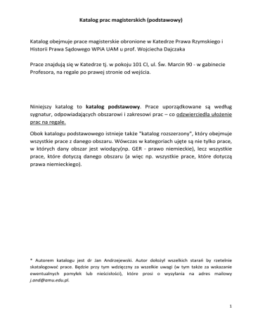 Katalog prac magisterskich (podstawowy) Katalog obejmuje prace magisterskie obronione w Katedrze Prawa Rzymskiego i Historii Prawa Sądowego WPiA UAM u prof. Wojciecha Dajczaka Prace znajdują się w Katedrze tj. w pokoju 101 CI, ul. Św. Marcin 90 - w gabinecie Profesora, na regale po prawej stronie od wejścia. Niniejszy katalog to katalog podstawowy. Prace uporządkowane są według sygnatur, odpowiadających obszarowi i zakresowi prac – co odzwierciedla ułożenie prac na regale. Obok katalogu podstawowego istnieje także "katalog rozszerzony", który obejmuje wszystkie prace z danego obszaru. Wówczas w kategoriach ujęte są nie tylko prace, w których dany obszar jest wiodący(np. GER - prawo niemieckie), lecz wszystkie prace, które dotyczą danego obszaru (a więc np. wszystkie prace, które dotyczą prawa niemieckiego). * Autorem katalogu jest dr Jan Andrzejewski. Autor dołożył wszelkich starań by rzetelnie skatalogować prace. Będzie przy tym wdzięczny za wszelkie uwagi (w tym także za wskazanie ewentualnych pomyłek lub nieścisłości), które prosi o wysyłania na adres mailowy [email protected]. 1 WYJAŚNIENIE SPOSOBU KATALOGOWANIA Prace uporządkowane są według sygnatur, odpowiadających obszarowi i zakresowi prac. Przykład SYGN NR GER-OG-01 19 AUTOR TYTUŁ ROK KRAJ lub OBSZAR ZAKRES Rehlis Tomasz Allgemeine Regelung der relativen Unwirksamkeit in Polen im Vergleich zum deutschen Recht. Ist der Art. 59 des Kodeks Cywilny nützlich? 2016 GER / POL CZĘŚĆ OGÓLNA (Ogólna regulacja bezskuteczności względnej w Polsce w porównaniu do prawa niemieckiego. Czy artykuł 59 Kodeksu Cywilnego jest użyteczny?) SYGN - w przykładzie"GER-OG-01" "GER" - oznacza, że praca znajduje się na półce z pracami z zakresu prawa niemieckiego "OG" - oznacza, że jest to praca dotycząca części ogólnej prawa prywatnego "01" - numer porządkowy NR - numer (wewnętrzny) w katalogu TYTUŁ PRACY - (w przypadku prac w języku obcym w nawiasie podany jest też tytuł po polsku) ROK - rok obrony pracy (*przyjmuje się, że prace bronione były w Poznaniu, chyba że wskazano co innego) KRAJ lub OBSZAR - "FRA / ITA / POL" Obszar pogrubiony oznacza obszar, który przez autora katalogu uznany w pracy za wiodący Kolejne obszary (już niepogrubione) oznaczą inne obszary ujęte w pracy (w katalogu rozszerzonym niniejsza praca będzie więc ujęta także wśród prac z zakresu prawa włoskiego - ITA oraz prawa polskiego - POL). Wyróżnione w katalogu OBSZARY to: GER - prawo niemieckie / FRA- prawo francuskie / ITA - prawo włoskie / ESP - prawo hiszpańskie / POL- prawo polskie / ROM - prawo rzymskie / IUS - iuscommune (w tym prawo kanoniczne) / COM - system common law / EUR-Law- prawo europejskie (domyślnie: prawo Unii Europejskiej) / RUS - prawo rosyjskie / AUT- prawo austriackie / SUI - prawo szwajcarskiej / NOR- prawo norweskie / TRA tradycja prawna (są to najczęściej prace o charakterze przekrojowym lub takie, których nie dało się przyporządkować do innych obszarów) * Kategoria "ROM" (prawo rzymskie) obejmuje prace, które albo koncentrują się wyłącznie na tym obszarze, tudzież zawierają analizy tekstów źródłowych. ZAKRES- jest to wskazanie zakresu pracy (według oceny autora katalogu) Zakresy figurujące w katalogu (w tej kolejności): CZĘŚĆ OGÓLNA (OG) / TEORIA I FILOZOFIA (prawa) (FIL)/ ZOBOWIĄZANIA (ZOB) / (prawo) RZECZOWE(RZE)/ (prawo) SPADKOWE (SPA) / (prawo) RODZINNE (ROD) / (prawo) MEDYCZNE (MED)/ (prawo) AUTORSKIE (AUT) / PROCES CYWILNY (PRO) /VARIA (VAR) *W rubryce "ZAKRES" wskazana jest także osoba promotora, jeżeli promotorem pracy była inna osoba niż prof. Wojciech Dajczak. 2 KATALOG PRAC MAGISTERSKICH (PODSTAWOWY) Kolejność: − PRAWO NIEMIECKIE (GER)– strona 4 − PRAWO FRANCUSKIE (FRA) – strona 6 − PRAWO HISZPAŃSKIE (ESP) – strona 7 − PRAWO WŁOSKIE (ITA) – strona 8 − PRAWO POLSKIE (POL)– strona 9 − PRAWO CHIŃSKIE (CHI)– strona 10 − COMMON LAW (COM) – strona 11 − PRAWO RZYMSKIE (ROM) – strona 12 − IUS COMMUNE, w tym PRAWO KANONICZE (IUS) – strona 12 − EUROPEJSKIE PRAWO PRYWATNE (głównie prawo Unii Europejskiej) (EUR-Law) - strona 13 − TRADYCJA PRAWNA (LegalTradition) (TRA) – strona 13 INNE (pośrednio dotyczące danego systemu prawnego) − PRAWO AUSTRIACKIE (AUT) - strona 14 − PRAWO SZWAJCARSKIE (SUI)– strona 14 − PRAWO ROSYJSKIE (RUS) – strona 14 3 PRAWO NIEMIECKIE (GER) SYGN NR GER-OG-01 19 AUTOR TYTUŁ ROK KRAJ lub OBSZAR ZAKRES Rehlis Tomasz Allgemeine Regelung der relativen Unwirksamkeit in Polen im Vergleich zum deutschen Recht. Ist der Art. 59 des Kodeks Cywilny nützlich? 2016 GER / POL CZĘŚĆ OGÓLNA (Ogólna regulacja bezskuteczności względnej w Polsce w porównaniu do prawa niemieckiego. Czy artykuł 59 Kodeksu Cywilnego jest użyteczny?) GER-FIL-01 43 Pawlus Ewa Świadomość prawna. Ujęcie teoretyczne przykłady niemieckich badań empirycznych 2007 GER TEORIA I FILOZOFIA GER-ZOB-01 24 Janina Rochon 2015 GER / POL ZOBOWIĄZANIA GER-ZOB-02 7 Sługiewicz Piotr 2011 GER / POL ZOBOWIĄZANIA GER-ZOB-03 46 Andrzejewski Jan 2010 GER, POL, CommonLaw ZOBOWIĄZANIA GER-ZOB-04 47 Justyńska Małgorzata 2011 GER, FRA, POL ZOBOWIĄZANIA GER-ZOB-05 77 WrzosDomoradzka Marta 2015 GER, POL ZOBOWIĄZANIA GER-ZOB-06 21 Sułkowska Anna 2015 GER / POL ZOBOWIĄZANIA GER-ZOB-07 82 Rusin Agata Odszkodowanie karne (punitivedamages). Stanowisko i tendencje ewolucji niemieckiego i polskiego prawa prywatnego wobec funkcji represyjnej odszkodowania Świadczenie niegodziwe. Porównawcza analiza prawa niemieckiego i polskiego z perspektywy tradycji prawnej kontynentalnej Europy Odpowiedzialność przedkontraktowa (tzw. culpa in contrahendo) w różnych systemach prawnych Odpowiedzialność z tytułu czynu niedozwolonego. Analiza porównawcza modeli występujących w civil law tradition Umowa franchisingu. Porównawcza analiza swobody stron umowy franchisingu w Niemczech i w Polsce Odpowiedzialnoś