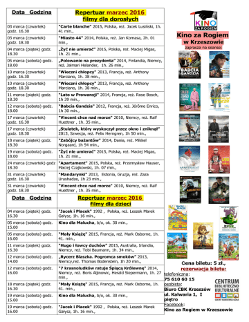 Data Godzina Repertuar marzec 2016 filmy dla dorosłych 03 marca (czwartek) godz. 16.30 "Carte blanche" 2015, Polska, reż. Jacek Lusiński, 1h. 41 min., 03 marca (czwartek) godz. 18.30 "Miasto 44" 2014, Polska, reż. Jan Komasa, 2h. 01 min., 04 marca (piątek) godz. 18.30 „Żyć nie umierać” 2015, Polska, reż. Maciej Migas, 1h. 21 min., 05 marca (sobota) godz. 18.00 „Polowanie na prezydenta” 2014, Finlandia, Niemcy, reż. Jalmari Helander, 1h. 26 min., 10 marca (czwartek) godz. 16.30 "Wieczni chłopcy" 2013, Francja, reż. Anthony Marciano, 1h. 38 min., 10 marca (czwartek) godz. 18.30 "Wieczni chłopcy" 2013, Francja, reż. Anthony Marciano, 1h. 38 min., 11 marca (piątek) godz. 18.30 "Lato w Prowansji" 2014, Francja, reż. Rose Bosch, 1h 39 min., 12 marca (sobota) godz. 18.00 "Babcia Gandzia" 2012, Francja, reż. Jérôme Enrico, 1h 30 min., 17 marca (czwartek) godz. 16.30 "Vincent chce nad morze" 2010, Niemcy, reż. Ralf Huettner , 1h. 35 min., 17 marca (czwartek) godz. 18.30 „Stulatek, który wyskoczył przez okno i zniknął” 2013, Szwecja, reż. Felix Herngren, 1h 50 min., 18 marca (piątek) godz. 18.30 "Zabójcy bażantów" 2014, Dania, reż. Mikkel Norgaard, 1h 54 min., 19 marca (sobota) godz. 18.00 "Żyć nie umierać" 2015, Polska, reż. Maciej Migas, 1h. 21 min., Kino za Rogiem w Krzeszowie zaprasza na seanse: 24 marca (czwartek) godz "Apartament" 2015, Polska, reż. Przemysław Hauser, 18.30 Maciej Czajkowski, 1h. 07 min., 31 marca (czwartek) godz. 16.30 "Mandarynki" 2013, Estonia, Gruzja, reż. Zaza Urushadze, 1h 23 min., 31 marca (czwartek) godz. 18.30 "Vincent chce nad morze" 2010, Niemcy, reż. Ralf Huettner , 1h. 35 min., Data Godzina Repertuar marzec 2016 filmy dla dzieci 04 marca (piątek) godz. 16.30 "Jacek i Placek" 1992 , Polska, reż. Leszek Marek Gałysz, 1h. 16 min., 05 marca (sobota) godz. 15.00 Kino dla Malucha, b/o, ok. 30 min., 05 marca (sobota) godz. 16.00 "Mały Książę" 2015, Francja, reż. Mark Osborne, 1h. 41. min., 11 marca (piątek) godz. 16.30 "Hugo i łowcy duchów" 2015, Australia, Irlandia, Niemcy, reż. Tobi Baumann, 1h. 34 min., 12 marca (sobota) godz. 14.00 „Rycerz Blaszka. Pogromca smoków” 2013, Niemcy,reż. Thomas Bodenstein, 1h 20 min., 12 marca (sobota) godz. 16.00 "7 krasnoludków ratuje Śpiącą Królewnę" 2014, rezerwacja Niemcy, reż. Boris Aljinowic, Herald Siepermann, 1h. 27 telefoniczna: min., 75 610 60 15 18 marca (piątek) godz. 16.30 "Mały Książę" 2015, Francja, reż. Mark Osborne, 1h. 41. min., 19 marca (sobota) godz. 15.00 Kino dla Malucha, b/o, ok. 30 min., 19 marca (sobota) godz. 16.00 "Jacek i Placek" 1992 , Polska, reż. Leszek Marek Gałysz, 1h. 16 min., Cena biletu: 5 zł., biletu: osobista: Biuro CBK Krzeszów ul. Kalwaria 1, I piętro Facebook: Kino za Rogiem w Krzeszowie