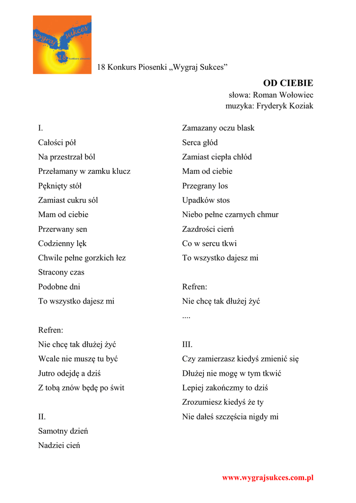 18 Konkurs Piosenki „Wygraj Sukces” OD CIEBIE słowa: Roman Wołowiec muzyka: Fryderyk Koziak I. Zamazany oczu blask Całości pół Serca głód Na przestrzał ból Zamiast ciepła chłód Przełamany w zamku klucz Mam od ciebie Pęknięty stół Przegrany los Zamiast cukru sól Upadków stos Mam od ciebie Niebo pełne czarnych chmur Przerwany sen Zazdrości cierń Codzienny lęk Co w sercu tkwi Chwile pełne gorzkich łez To wszystko dajesz mi Stracony czas Podobne dni Refren: To wszystko dajesz mi Nie chcę tak dłużej żyć .... Refren: Nie chcę tak dłużej żyć III. Wcale nie muszę tu być Czy zamierzasz kiedyś zmienić się Jutro odejdę a dziś Dłużej nie mogę w tym tkwić Z tobą znów będę po świt Lepiej zakończmy to dziś Zrozumiesz kiedyś że ty II. Nie dałeś szczęścia nigdy mi Samotny dzień Nadziei cień www.wygrajsukces.com.pl