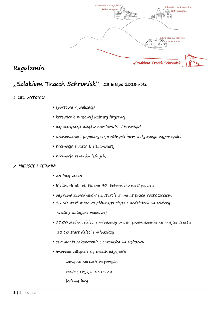 Regulamin „Szlakiem Trzech Schronisk” 23 lutego 2013 roku 1 CEL WYŚCIGU: • sportowa rywalizacja • krzewienie masowej kultury fizycznej • popularyzacja biegów narciarskich i turystyki • promowanie i popularyzacja różnych form aktywnego wypoczynku • promocja miasta Bielska-Białej • promocja terenów leśnych, 2. MIEJSCE I TERMIN: • 23 luty 2013 • Bielsko-Biała ul. Skalna 90, Schronisko na Dębowcu • odprawa zawodników na starcie 5 minut przed rozpoczęciem • 10:30 start masowy głównego biegu z podziałem na sektory według kategorii wiekowej • 10:00 zbiórka dzieci i młodzieży w celu przewiezienia na miejsce startu 11:00 start dzieci i młodzieży • ceremonia zakończenia Schronisko na Dębowcu • impreza odbędzie się trzech edycjach: zimą na nartach biegowych wiosną edycja rowerowa jesienią bieg 1|Strona 3. ORGANIZATORZY: • Urząd Miasta Bielsko-Biała • Bielsko-Bialski Ośrodek Sportu i Rekreacji (BBOSiR) • Jan Kliś • ARGO Marcin Świerżewski 4. WARUNKI UCZESTNICTWA: Bieg narciarski „Szlakiem Trzech Schronisk” to ogólnodostępne zawody rozgrywane w dniu 23 lutego 2013 od Schroniska na Dębowcu poprzez Schronisko na Szyndzielni kończąc przy Schronisku Klimczok. Osoby uczestniczące w zawodach muszą spełniać następujące warunki: • zarejestrować się przez stronę internetową www.datasport.pl • lub dopełnić rejestracji w biurze zawodów czynnym w dniu zawodów 23 lutego 2013 koniec zapisów na 15 minut przed startem (10:15) • odebrać w biurze zawodów numer startowy i czip • w przypadku osób dorosłych posiadać dowód tożsamości • prawo do startu mają osoby, które ukończyły 18 lat, - w przedziale wieku 16-18 lat prawo do startu za pisemną zgodą rodziców lub opiekunów prawnych, - poniżej 16 lat prawo do startu pod stałą opieką rodziców lub opiekunów prawnych. Każdy uczestnik startuje na własną odpowiedzialność (w przypadku zawodników niepełnoletnich na odpowiedzialność rodziców lub prawnych opiekunów). 2|Strona Przystępując do zawodów uczestnik akceptuje poniższą klauzulę: Zgadzam się z warunkami i zgłaszam uczestnictwo w zawodach. Organizator, wszystkie osoby z nim współpracujące, a także osoby związane z organizacją zawodów nie ponoszą odpowiedzialności względem uczestników za szkody osobowe, rzeczowe, majątkowe, które wystąpią przed w trakcie i po zawodach. Uczestnicy startują na własną odpowiedzialność. Uczestnicy ponoszą odpowiedzialność cywilną i prawną za wszelkie szkody wyrządzone przez siebie. Przez akceptację niniejszej deklaracji uczestnicy zrzekają się prawa dochodzenia prawnego lub zwrotnego od organizatora lub jego zleceniobiorców w razie wypadku lub szkody związanej z zawodami. Przyjmuję do wiadomości, że w razie wypadku nie mogę wnosić żadnych roszczeń w stosunku do organizatora. Przyjmuję do wiadomości, że należy przestrzegać zarządzeń służb porządkowych oraz warunku regulaminu. Zdjęcia, nagrania filmowe oraz wywiady z moją osobą, a także wyniki z moimi danymi osobowymi mogą być wykorzystane przez media, prasę i organizatora. Wyrażam zgodę na przetwarzanie moich danych osobowych w tym także dla potrzeb działań marketingowych podejmowanych przez Organizatorów zgodnie z ustawą z dnia 29 sierpnia 1997r. o ochronie danych osobowych (Dz.U.Nr. 133, poz. 883). 5. KATEGORIE I ZASADY PRZEPROWADZENIA WYŚCIGU: • Bieg dzieci i młodzieży: start/meta przy Schronisku na Szyndzielni o godz. 11 o godz. 10 dzieci i młodzież zostaną przewiezieni autokarem pod kolej linową na Szyndzielnię i przetransportowani tą koleją na miejsce startu i z powrotem około godz. 12:30 0 – 6 lat dziewczęta i chłopcy 7 – 9 lat dziewczęta 7 – 9 lat 10 – 12 lat 10 – 12 chłopcy dziewczęta lat chłopcy 13 – 15 lat dziewczęta 13 – 15 lat 3|Strona chłopcy 2 • Bieg główny: Uczestnicy będą mieli do pokonania trasę około 7 km poprowadzoną od start przy Schronisku na Dębowcu 686 m n.p.m, poprzez Schronisko na Szyndzielni 1001 m n.p.m. kończąc metą przy Schronisku na Klimczoku 1034 m n.p.m., gdzie będzie pomiar czasu. 16 – 19 lat 1997 – 1994 20 – 29 lat 1993 – 1984 30 – 39 lat 1983 – 1974 40 – 49 lat 1973 – 1964 50 – 60 lat 1963 – 1954 powyżej 60 lat 1953 – 1943 1942 i starsi Osobna kategoria dla Kobiet i Mężczyzn: Trasa oznakowana i przygotowana ratrakiem, całkowicie na utwardzonym podłożu. Trasa średnio-trudna. Styl dowolny. Przewyższenie około 450 m. Zwycięzcą indywidualnym w każdej kategorii wiekowej zostaje zawodnik, który na mecie wyścigu uzyska najkrótszy czas przejazdu oraz pokona pełen dystans przewidziany dla danej kategorii. Organizator zastrzega sobie prawo do innego sposobu przeprowadzenia startu, połączenia lub rozdzielenia kategorii w przypadkach uzasadnionych, o czym poinformuje uczestników na odprawie technicznej w dniu rozgrywania wyścigu. Skracanie trasy, bądź niesportowe zachowanie w trakcie trwania zawodów skutkuje dyskwalifikacją zawodnika. Organizator pobiera opłatę startową w wysokości 20zł Dzieci i młodzież do 18 bezpłatnie 4|Strona 6. ŚWIADCZENIA DLA ZAWODNIKÓW: • oznakowana trasa wraz z osobami funkcyjnymi w newralgicznych punktach • wypożyczalnia sprzętu • pomiar czasu, międzyczas • zabezpieczenie medyczne • nagrody dla zwycięzców • puchary, medale • dostęp do punktów gastronomicznych 7. POSTANOWIENIA KOŃCOWE: • Uczestnicy muszą szanować środowisko naturalne i bezwzględnie nie mogą zanieczyszczać trasy. Nie wolno używać szklanych pojemników w pobliżu i na trasie zawodów. Na trasie przejazdu występują strome podjazdy. • Uczestnicy biegu ubezpieczają się od następstw nieszczęśliwych wypadków we własnym zakresie. • Brak znajomości regulaminu nie będzie uznawany jako wytłumaczenie. • Organizatorzy nie odpowiadają za wypadki spowodowane przez uczestników bądź osoby, 
