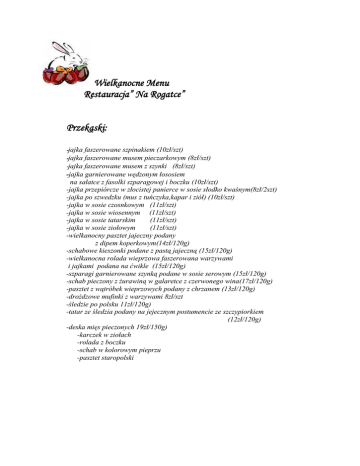 Wielkanocne Menu Restauracja” Na Rogatce” Przekąski: -jajka faszerowane szpinakiem (10zł/szt) -jajka faszerowane musem pieczarkowym (8zł/szt) -jajka faszerowane musem z szynki (8zł/szt) -jajka garnierowane wędzonym łososiem na sałatce z fasolki szparagowej i boczku (10zł/szt) -jajka przepiórcze w złocistej panierce w sosie słodko kwaśnym(8zł/2szt) -jajka po szwedzku (mus z tuńczyka,kapar i ziół) (10zł/szt) -jajka w sosie czosnkowym (11zł/szt) -jajka w sosie wiosennym (11zł/szt) -jajka w sosie tatarskim (11zł/szt) -jajka w sosie ziołowym (11zł/szt) -wielkanocny pasztet jajeczny podany z dipem koperkowym(14zł/120g) -schabowe kieszonki podane z pastą jajeczną (15zł/120g) -wielkanocna rolada wieprzowa faszerowana warzywami i jajkami podana na ćwikle (15zł/120g) -szparagi garnierowane szynką podane w sosie serowym (15zł/120g) -schab pieczony z żurawiną w galaretce z czerwonego wina(17zł/120g) -pasztet z wątróbek wieprzowych podany z chrzanem (13zł/120g) -drożdzowe mufinki z warzywami 8zł/szt -śledzie po polsku 11zł/120g) -tatar ze śledzia podany na jejecznym postumencie ze szczypiorkiem (12zł/120g) -deska mięs pieczonych 19zł/150g) -karczek w ziołach -rolada z boczku -schab w kolorowym pieprzu -pasztet staropolski Sałatki: - wiosenna sałatka z wędzonym łososiem i cytrynowym dipem (14zł/120g) - sałatka z pieczarek (12zł/120g) - sałatka selerowa (12zł/120g) - sałatka jajeczna z posmakiem pora (12zł/120g) Zupy: - żurek staropolski (11zł/200g) - zupa krem ze szczawiu podany z jajkami przepiórczymi (11zł/200g) - wielkanocny barszcz biały (10zł/200g) Dania główne: -staropolskie zrazy wołowe duszone w grzybach ( 32zł/200g) -pieczeń z jajkami pieczona w bekonie podana na sosie kaparowym (28zł/200g) -eskalopki schabowe w sosie dijon (28zł/200g) -pieczony rostbef na sosie z czerwonej cebuli i kolorowego pieprzu (38zł/200g) -bigos staropolski (18zł/120g) -roladki drobiowe w szczypiorkowej panierce podane na duszonych warzywach (28zł/200g) -sandacz z pieca podany na warzywnym spaghetti 35zł/200g) Deser: -mazurek wielkanocny -makowiec -ciasto duet makowca z sernikiem -pascha wielkanocna - 15zł/120g 16zł/120g 16zł/120g 16zł/120g