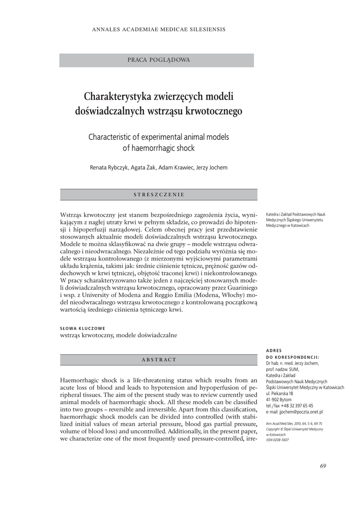 ANNALES ACADEMIAE MEDICAE SILESIENSIS PRACA POGLĄDOWA Charakterystyka zwierzęcych modeli doświadczalnych wstrząsu krwotocznego Characteristic of experimental animal models of haemorrhagic shock Renata Rybczyk, Agata Żak, Adam Krawiec, Jerzy Jochem STRESZCZENIE Wstrząs krwotoczny jest stanem bezpośredniego zagrożenia życia, wynikającym z nagłej utraty krwi w pełnym składzie, co prowadzi do hipotensji i hipoperfuzji narządowej. Celem obecnej pracy jest przedstawienie stosowanych aktualnie modeli doświadczalnych wstrząsu krwotocznego. Modele te można sklasyfikować na dwie grupy – modele wstrząsu odwracalnego i nieodwracalnego. Niezależnie od tego podziału wyróżnia się modele wstrząsu kontrolowanego (z mierzonymi wyjściowymi parametrami układu krążenia, takimi jak: średnie ciśnienie tętnicze, prężność gazów oddechowych w krwi tętniczej, objętość traconej krwi) i niekontrolowanego. W pracy scharakteryzowano także jeden z najczęściej stosowanych modeli doświadczalnych wstrząsu krwotocznego, opracowany przez Guariniego i wsp. z University of Modena and Reggio Emilia (Modena, Włochy) model nieodwracalnego wstrząsu krwotocznego z kontrolowaną początkową wartością średniego ciśnienia tętniczego krwi. Katedra i Zakład Podstawowych Nauk Medycznych Śląskiego Uniwersytetu Medycznego w Katowicach S Ł O WA K L U C Z O W E wstrząs krwotoczny, modele doświadczalne ADRES A B S T R AC T Haemorrhagic shock is a life-threatening status which results from an acute loss of blood and leads to hypotension and hypoperfusion of peripheral tissues. The aim of the present study was to review currently used animal models of haemorrhagic shock. All these models can be classified into two groups – reversible and irreversible. Apart from this classification, haemorrhagic shock models can be divided into controlled (with stabilized initial values of mean arterial pressure, blood gas partial pressure, volume of blood loss) and uncontrolled. Additionally, in the present paper, we characterize one of the most frequently used pressure-controlled, irre- D O KO R E S P O N D E N C J I : Dr hab. n. med. Jerzy Jochem, prof. nadzw. SUM, Katedra i Zakład Podstawowych Nauk Medycznych Śląski Uniwersytet Medyczny w Katowicach ul. Piekarska 18 41-902 Bytom tel./fax +48 32 397 65 45 e-mail: [email protected] Ann.Acad.Med.Siles. 2010, 64, 5-6, 69-75 Copyright © Śląski Uniwersytet Medyczny w Katowicach ISSN 0208-5607 69 ANNALES ACADEMIAE MEDICAE SILESIENSIS versible models of haemorrhagic shock developed by Guarini and al. from University of Modena and Reggio Emilia (Modena, Italy). KEY WORDS: haemorrhagic shock, experimental models WSTĘP Wstrząs jest to zespół objawów klinicznych o zróżnicowanej etiologii, w którym dochodzi do zaburzenia przepływu tkankowego, co prowadzi do hipoksji i hipoperfuzji tkanek oraz niewystarczającego dowozu substancji odżywczych i usuwania produktów przemiany materii. Najistotniejsze znaczenie ma upośledzenie przepływu w ośrodkowym układzie nerwowym, mięśniu sercowym, płucach, nerkach i wątrobie – a więc w tkankach i narządach niezbędnych do podtrzymywania czynności życiowych. Różne rodzaje wstrząsu są spowodowane zaburzeniem jednego lub kilku podstawowych czynników warunkujących ciśnienie tętnicze krwi, a mianowicie pracy mechanicznej serca, obwodowego oporu naczyniowego i objętości krążącej krwi. Wstrząs hipowolemiczny (oligowolemiczny) jest następstwem zmniejszenia objętości krwi krążącej. Klasyfikacja etiologiczna tego typu wstrząsu obejmuje: 1. wstrząs krwotoczny – spowodowany utratą krwi w pełnym składzie, np. w wyniku krwawienia zewnętrznego lub wewnętrznego, 2. wstrząs spowodowany utratą osocza (w następstwie oparzeń, przenikania osocza do zmiażdżonych tkanek), 3. wstrząs wywołany utratą wody i elektrolitów (przy nadmiernej diurezie osmotycznej w stanie kwasicy cukrzycowej ketonowej i nieketonowej hiperglikemii hiperosmolarnej, podczas biegunki, uporczywych wymiotów, w moczówce prostej, przetokach zewnętrznych przewodu pokarmowego, hipertermii, w następstwie przenikania płynów do przestrzeni transcelularnej). Wstrząs krwotoczny jest szczególną postacią wstrząsu hipowolemicznego, w której dochodzi do utraty w krótkim czasie znacznej objętości krwi krążącej, tak iż mechanizmy kompensacyjne układu krążenia nie są w stanie doprowadzić do normalizacji homeostazy ciśnieniowej. Oprócz czynników endogennych, 70 tj. chorób, w przebiegu których dochodzi do znacznej utraty krwi w krótkim czasie, na częstość występowania wstrząsu krwotocznego wpływ mają czynniki zewnętrzne, wywołujące uszkodzenie dużych naczyń. Pod względem częstości hospitalizacji chorych we wstrząsie, hipowolemia jest drugą, po wstrząsie kardiogennym, wyjściową przyczyną wstrząsu [1]. O randze zagadnienia może także świadczyć fakt, że na podstawie danych zachodnioeuropejskich – wstrząs krwotoczny występuje aż u ponad 44% osób, które ponoszą śmierć w wyniku urazów odniesionych w wypadkach komunikacyjnych [2]. Jeszcze większa częstość występowania wstrząsu krwotocznego dotyczy urazów związanych z prowadzonymi działaniami wojennymi, a dane takie pochodzą nie tylko z okresu I i II wojny światowej, ale także z drugiej połowy XX wieku i początku XXI wieku [3–5]. Analiza przyczyn zgonów żołnierzy amerykańskich podczas wojny w Wietnamie (1964–73) wskazuje, że u ponad 50% ofiar przyczyną śmierci był wstrząs krwotoczny [6]. Podobne wyniki uzyskano, oceniając przyczyny zgonów mieszkańców Bośni i Hercegowiny rannych w wojnie bałkańskiej (1993–96) [7]. Równie dużą częstość występowania wstrząsu krwotocznego stwierdzono na podstawie analizy przyczyn hospitalizacji ofiar wojennych podczas walk w Kosowie [8]. W toczonych już w XXI wieku walkach w Afganistanie i Iraku, pomimo stałego udoskonalania sprzętu mająceg