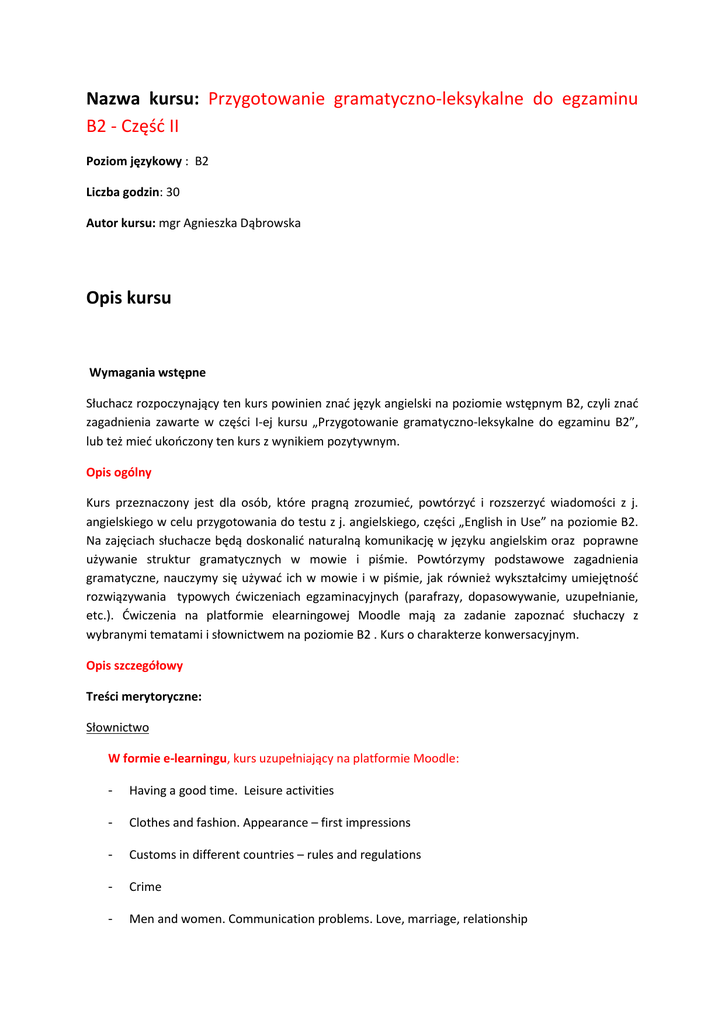 Nazwa kursu: Przygotowanie gramatyczno-leksykalne do egzaminu B2 - Część II Poziom językowy : B2 Liczba godzin: 30 Autor kursu: mgr Agnieszka Dąbrowska Opis kursu Wymagania wstępne Słuchacz rozpoczynający ten kurs powinien znać język angielski na poziomie wstępnym B2, czyli znać zagadnienia zawarte w części I-ej kursu „Przygotowanie gramatyczno-leksykalne do egzaminu B2”, lub też mieć ukończony ten kurs z wynikiem pozytywnym. Opis ogólny Kurs przeznaczony jest dla osób, które pragną zrozumieć, powtórzyć i rozszerzyć wiadomości z j. angielskiego w celu przygotowania do testu z j. angielskiego, części „English in Use” na poziomie B2. Na zajęciach słuchacze będą doskonalić naturalną komunikację w języku angielskim oraz poprawne używanie struktur gramatycznych w mowie i piśmie. Powtórzymy podstawowe zagadnienia gramatyczne, nauczymy się używać ich w mowie i w piśmie, jak również wykształcimy umiejętność rozwiązywania typowych ćwiczeniach egzaminacyjnych (parafrazy, dopasowywanie, uzupełnianie, etc.). Ćwiczenia na platformie elearningowej Moodle mają za zadanie zapoznać słuchaczy z wybranymi tematami i słownictwem na poziomie B2 . Kurs o charakterze konwersacyjnym. Opis szczegółowy Treści merytoryczne: Słownictwo W formie e-learningu, kurs uzupełniający na platformie Moodle: - Having a good time. Leisure activities - Clothes and fashion. Appearance – first impressions - Customs in different countries – rules and regulations - Crime - Men and women. Communication problems. Love, marriage, relationship - Feelings and emotions – anger, arguments, fights - Success and fame, achievements. Celebrities. - Success at work, Business English – basic vocabulary - Final Test Gramatyka - Pytania pośrednie (indirect questions), question tags, konstrukcje typu: So do I/ neither do I - Użycie czasów – powtórzenie i utrwalenie czasów w j. angielskim - Zdania przydawkowe (which, what, where, etc.), zdania podrzędnie złożone, łączniki (in order to, because, despite, although, so that, etc.) - Konstrukcje z bezokolicznikiem (to do) i formą gerund (- ing), e.g. admit doing something, refuse to do something, etc. - Strona bierna - wszystkie czasy (It is done, It is being done, It has been done, etc.); konstrukcje typu: It is said …, She is said to be … - Okres warunkowy typu III ( 3rd Conditional); porównanie okresów warunkowych – typowe zastosowania; mixed conditionals - Czasowniki modalne w aspekcie perfekt (must have done, can’t have done, should have done, etc..) - Mowa zależna (He said that.., He told me …, etc.) - Powtórzenie i utrwalenie materiału. - Final Test Wymagania oceny Słuchacz zakończy kurs z wynikiem pozytywnym jeśli będzie regularnie uczestniczył w zajęciach(przynajmniej 50 % obecności) , będzie aktywny na zajęciach, przygotowany do zajęć (zadania domowe) oraz zaliczy końcowy test pisemny. Literatura Kurs oparty na materiałach z różnych podręczników znanych wydawnictw (Macmillan, Oxford University Press, Express Publishing, Heinle, Cambridge University Press), dodatkowych materiałach autorskich, autentycznych tekstach z prasy i z Internetu, materiałach audio i wideo. Cel ogólny kursu Kurs ma na celu pogłębienie i ugruntowanie wiedzy słuchacza, przygotowanie do części „English in Use” egzaminu końcowego na poziomie B2 w obrębie zagadnień gramatycznych i leksykalnych zaprezentowanych w sylabusie. Oczekiwane efekty kształcenia Po zakończeniu kursu z wynikiem pozytywnym, słuchacz: - będzie potrafił poprawnie formułować zdania, swobodnie prowadzić rozmowę na tematy omawiane na kursie - powtórzy i pogłębi wiadomości z gramatyki j. angielskiego, powtórzy i wzbogaci słownictwo - powtórzy zagadnienia gramatyczne wymagane na egzaminie końcowym B2 - zapozna się z technikami ćwiczeń egzaminacyjnych