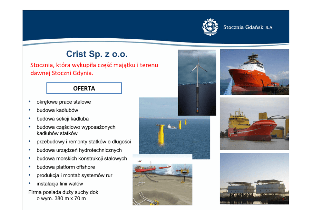 Crist Sp. z o.o. Stocznia, która wykupiła część majątku i terenu dawnej Stoczni Gdynia. OFERTA • • • • • • • • • • okrętowe prace stalowe budowa kadłubów budowa sekcji kadłuba budowa częściowo wyposaŜonych kadłubów statków przebudowy i remonty statków o długości budowa urządzeń hydrotechnicznych budowa morskich konstrukcji stalowych budowa platform offshore produkcja i montaŜ systemów rur instalacja linii wałów Firma posiada duŜy suchy dok o wym. 380 m x 70 m Spółka Crist obecnie realizuje zamówienie na budowę barek typu jack-up do ustawiania farm wiatrowych na morzu. Samopodnośna budowlano – remontowa platforma Thor Stocznia Wisła OFERTA W chwili obecnej Stocznia Wisła specjalizuje się w produkcji: •szerokiej gamy kutrów rybackich •małych jednostek różnego rodzaju (np. katamaran patrolowy, motorówki patrolowe i pilotowe) •stalowych konstrukcji okrętowych (głównie wyposażonych nadbudówek, sekcji okrętowych oraz gotowych kadłubów) Stocznia Wisła MOŻLIWOŚCI • slip boczny umożliwia budowę jednostek o długości do 40 metrów. • Stanowiska montażowe na nabrzeżach pozwalają na budowę stalowych konstrukcji okrętowych o wysokości do 28 metrów i masie jednostkowej do 600 ton. Stocznia Marynarki Wojennej w Gdyni OFERTA • • • • remonty okrętów Marynarki Wojennej remonty statków handlowych budowa niewielkich jednostek handlowych korweta Gawron (w trakcie budowy) Sąd Rejonowy w Gdańsku ogłosił w dniu 7.04.2011r. upadłość likwidacyjną Stoczni Marynarki Wojennej w Gdyni. Przez prawie półtora roku spółka była w tzw. upadłości układowej. Kadłub okrętu ORP Gawron dla Marynarki Wojennej. Maritim Sp. z o.o. • produkcja stalowych kadłubów, bloków i sekcji dla statków handlowych • doświadczenie w dostawach dla czołowych klientów niemieckich, francuskich, norweskich, amerykańskich, kanadyjskich i holenderskich. • zdolność budowy konstrukcji stalowych to ok. 25.000 - 30.000 ton rocznie • przygotowanie prac dokumentacyjnych, rysunków warsztatowych. • budowa kompletnych kadłubów statków • posiada 2 pontony do transportu bloków. Aluship Technology Sp. z o.o. (Gdańsk) • Wiodący producent aluminiowych i stalowych konstrukcji na mega-jachty (zakres wagowy konstrukcji wynosił od 30 do 171 ton aluminium oraz do 1.200ton stali) • wiodący producent aluminiowych i stalowych konstrukcji okrętowych na statki pasażerskie, promy, ro-ro oraz jednostki wojenne • • szeroki zakres usług produkcji konstrukcji offshore • dostarcza indywidualnie zaprojektowane dla każdej lokalizacji konstrukcje kanałów wentylacyjnych. dostarcza kompletnie wyposażone statki o wielkości 24-35m (np. jednostki robocze i patrolowe, szybkie promy) Damen Shipyards (Gdynia i Kędzierzyn – Koźle) Damen Marine Components (Gdańsk) OFERTA • • • • • • • • • • • • • Pchacze i holowniki Pogłębiarki Statki pasażerskie Barki pchane i pontony Piaskowce Kontenerowce Frachtowce Zbiornikowce Stacje paliw Pokrywy lukowe Nadbudówki i sterówki Instalacje Zbiorniki OFERTA • • • • dysze śruby napędowej instalacje sterowe wały śrubowe tunele dziobowych sterów strumieniowych Sunreef Yachts • światowy lider w projektowaniu i konstrukcji katamaranów żaglowych, motorowych oraz super jachtów typu “custom made” o długości od 60 do ponad 200 stóp. • Stocznia posiada własne biuro czarterowe – Sunreef Yachts Charter oraz oddział zarządzania jachtem – Yacht Management. Dziękuję za uwagę