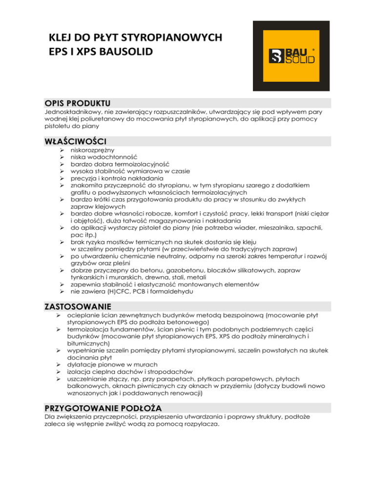 KLEJ DO PŁYT STYROPIANOWYCH EPS I XPS BAUSOLID OPIS PRODUKTU Jednoskładnikowy, nie zawierający rozpuszczalników, utwardzający się pod wpływem pary wodnej klej poliuretanowy do mocowania płyt styropianowych, do aplikacji przy pomocy pistoletu do piany WŁAŚCIWOŚCI niskorozprężny niska wodochłonność bardzo dobra termoizolacyjność wysoka stabilność wymiarowa w czasie precyzja i kontrola nakładania znakomita przyczepność do styropianu, w tym styropianu szarego z dodatkiem grafitu o podwyższonych własnościach termoizolacyjnych bardzo krótki czas przygotowania produktu do pracy w stosunku do zwykłych zapraw klejowych bardzo dobre własności robocze, komfort i czystość pracy, lekki transport (niski ciężar i objętość), duża łatwość magazynowania i nakładania do aplikacji wystarczy pistolet do piany (nie potrzeba wiader, mieszalnika, szpachli, pac itp.) brak ryzyka mostków termicznych na skutek dostania się kleju w szczeliny pomiędzy płytami (w przeciwieństwie do tradycyjnych zapraw) po utwardzeniu chemicznie neutralny, odporny na szeroki zakres temperatur i rozwój grzybów oraz pleśni dobrze przyczepny do betonu, gazobetonu, bloczków silikatowych, zapraw tynkarskich i murarskich, drewna, stali, metali zapewnia stabilność i elastyczność montowanych elementów nie zawiera (H)CFC, PCB i formaldehydu ZASTOSOWANIE ocieplanie ścian zewnętrznych budynków metodą bezspoinową (mocowanie płyt styropianowych EPS do podłoża betonowego) termoizolacja fundamentów, ścian piwnic i tym podobnych podziemnych części budynków (mocowanie płyt styropianowych EPS, XPS do podłoży mineralnych i bitumicznych) wypełnianie szczelin pomiędzy płytami styropianowymi, szczelin powstałych na skutek docinania płyt dylatacje pionowe w murach izolacja cieplna dachów i stropodachów uszczelnianie złączy, np. przy parapetach, płytkach parapetowych, płytach balkonowych, oknach piwnicznych czy oknach w przyziemiu (dotyczy budowli nowo wznoszonych jak i poddawanych renowacji) PRZYGOTOWANIE PODŁOŻA Dla zwiększenia przyczepności, przyspieszenia utwardzania i poprawy struktury, podłoże zaleca się wstępnie zwilżyć wodą za pomocą rozpylacza. KLEJ DO PŁYT STYROPIANOWYCH EPS I XPS BAUSOLID Rodzaje powierzchni: Większość spotykanych w budownictwie materiałów, w tym: beton, porobeton, ceramika budowlana, silikaty, powłoki bitumiczne, papa, membrany bitumiczne, styropian, drewno, ceramika budowlana, stal, aluminium i inne metale, wybrane tworzywa sztuczne (twarde PCW, poliester, PU itp.). Brak przyczepności do polietylenu, silikonu i teflonu. W wypadku podłoży bitumicznych i tworzyw sztucznych zaleca się przeprowadzić test Stan podłoża: Powierzchnia musi być czysta, wolna od kurzu, tłuszczu, smaru i innych zanieczyszczeń. SPOSÓB UŻYCIA Temperatura otoczenia i powierzchni - od +10°C do +25°C Temperatura puszki - od +5°C do +25°C (optymalnie +20°C) Zalecenia W razie potrzeby powierzchnię tylną płyt przeszlifować. Powierzchnie bardzo gładkie, równe, nieprzepuszczalne zaleca się zszorstkować, celem poprawy przyczepności. Bezpośrednio przed użyciem puszkę z klejem bardzo dobrze wymieszać. Nakręcić na pistolet. Początkową partię kleju (ok. 30 cm), aż do wyrównania się ciśnienia w pistolecie, skierować na bok (nie do użycia). Zaczynać przyklejanie płyt zawsze od dołu, opierając dolny rząd na listwie startowej lub stopie fundamentowej. Ewentualne zabrudzenia usuwać przy pomocy specjalnych ściereczek czyszczących do rąk, narzędzi i powierzchni lub za pomocą czyścika do piany poliuretanowej. Uwaga, czyścik może wejść w reakcję z płytą styropianową i doprowadzić do jej uszkodzenia. Utwardzony klej można usunąć tylko mechanicznie. Miejsca, w których klej jest wyeksponowany na działanie UV należy zabezpieczyć w ciągu 10 dni od nałożenia kleju. Do ochrony przed UV stosować zaprawy tynkarskie, gips szpachlowy lub elastyczne kity uszczelniające (silikon, akryl). Ocieplanie ścian zewnętrznych budynków metodą bezspoinową Klej nakładać na płyty po obwodzie z zachowaniem dystansu 2 cm od krawędzi płyty oraz pasmem w kształcie litery M lub W. W ciągu maksymalnie 10 minut od nałożenia kleju płyty należy przyłożyć do ocieplanej ściany i lekko docisnąć używając łaty. Korektę równości ułożenia płyt można przeprowadzić maksymalnie (w zależności od warunków) do 25 minut od nałożenia kleju. Spoina klejowa uzyskuje pełną wytrzymałość po 24 h od przyklejenia płyt. Termoizolacja fundamentów, ścian piwnic i tym podobnych podziemnych części budynków Nakładać jednostronnie na podłoże pionowymi paskami z zachowaniem 20-30 cm odstępów. W wypadku płyt o szerokości 150-160 cm, należy nałożyć przynajmniej 5 pasków. Płyty przyłożyć do podłoża po ok. 10 minutach od nałożenia kleju, a następnie równomiernie i mocno docisnąć. Pozostałe szczeliny i złącza między płytami podobnie wypełnić klejem. KLEJ DO PŁYT STYROPIANOWYCH EPS I XPS BAUSOLID Nie stosować w miejscach pozbawionych dostępu powietrza, narażonych na ciągłe oddziaływanie wody i bezpośredni wpływ promieni słonecznych (osłonić powierzchnię pianki). Podczas pracy z pianką zaleca się nosić odzież ochronną, rękawice i okulary. Nie stosować w pobliżu ognia. Ograniczenia - Do mocowania płyt w ociepleniach ścian zewnętrznych budynków należy stosować dodatkowo kołki tworzywowe. Stosowania kleju powinno być zgodne z projektami technicznymi opracowanymi dla określonych obiektów. - W termoizolacji podziemnych części budynków klej można stosować wyłącznie w systemach hydroizolacji lekkiej przeciwwilgociowej. - Nie stosować w przypadku ciągłej ekspozycji na wodę, np. zanurzenie spowodowane wysokim poziomem zwierciadła wód gruntowych (np. hydroizolacja ciężka przeciwwodna). - Nie stosować do PE, PP, teflonu, powierzchni silikonowych, pokrytych środk