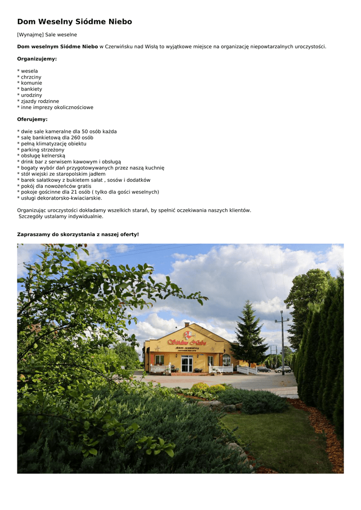 Dom Weselny Siódme Niebo [Wynajmę] Sale weselne Dom weselnym Siódme Niebo w Czerwińsku nad Wisłą to wyjątkowe miejsce na organizację niepowtarzalnych uroczystości. Organizujemy: * * * * * * * wesela chrzciny komunie bankiety urodziny zjazdy rodzinne inne imprezy okolicznościowe Oferujemy: * * * * * * * * * * * * dwie sale kameralne dla 50 osób każda salę bankietową dla 260 osób pełną klimatyzację obiektu parking strzeżony obsługę kelnerską drink bar z serwisem kawowym i obsługą bogaty wybór dań przygotowywanych przez naszą kuchnię stół wiejski ze staropolskim jadłem barek sałatkowy z bukietem sałat , sosów i dodatków pokój dla nowożeńców gratis pokoje gościnne dla 21 osób ( tylko dla gości weselnych) usługi dekoratorsko-kwiaciarskie. Organizując uroczystości dokładamy wszelkich starań, by spełnić oczekiwania naszych klientów. Szczegóły ustalamy indywidualnie. Zapraszamy do skorzystania z naszej oferty! Informacje dodatkowe Brak Adres ogłoszenia http://naslubiwesele.net/dom-weselny-siodme-niebo,o1010 Kontakt Mail: [email protected] Telefon: 602 383 279 Lokalizacja ul. Władysława Jagiełły 1 A, 09-150 Czerwińsk, Czerwińsk Mazowieckie (pl) Ogłoszenie dodano: 2016-10-06 13:15:56 Ogłoszenie wygasa: 2019-10-06 13:15:56 Powered by TCPDF (www.tcpdf.org)
