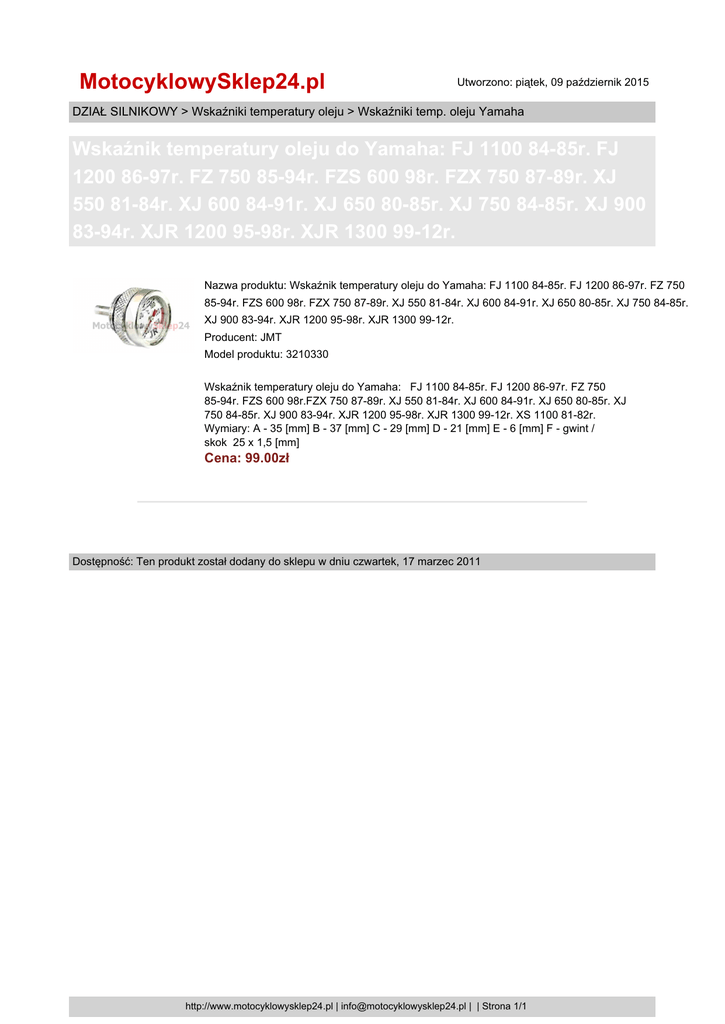 MotocyklowySklep24.pl Utworzono: piątek, 09 październik 2015 DZIAŁ SILNIKOWY > Wskaźniki temperatury oleju > Wskaźniki temp. oleju Yamaha Wskaźnik temperatury oleju do Yamaha: FJ 1100 84-85r. FJ 1200 86-97r. FZ 750 85-94r. FZS 600 98r. FZX 750 87-89r. XJ 550 81-84r. XJ 600 84-91r. XJ 650 80-85r. XJ 750 84-85r. XJ 900 83-94r. XJR 1200 95-98r. XJR 1300 99-12r. Nazwa produktu: Wskaźnik temperatury oleju do Yamaha: FJ 1100 84-85r. FJ 1200 86-97r. FZ 750 85-94r. FZS 600 98r. FZX 750 87-89r. XJ 550 81-84r. XJ 600 84-91r. XJ 650 80-85r. XJ 750 84-85r. XJ 900 83-94r. XJR 1200 95-98r. XJR 1300 99-12r. Producent: JMT Model produktu: 3210330 Wskaźnik temperatury oleju do Yamaha: FJ 1100 84-85r. FJ 1200 86-97r. FZ 750 85-94r. FZS 600 98r.FZX 750 87-89r. XJ 550 81-84r. XJ 600 84-91r. XJ 650 80-85r. XJ 750 84-85r. XJ 900 83-94r. XJR 1200 95-98r. XJR 1300 99-12r. XS 1100 81-82r. Wymiary: A - 35 [mm] B - 37 [mm] C - 29 [mm] D - 21 [mm] E - 6 [mm] F - gwint / skok 25 x 1,5 [mm] Cena: 99.00zł Dostępność: Ten produkt został dodany do sklepu w dniu czwartek, 17 marzec 2011 http://www.motocyklowysklep24.pl | [email protected] | | Strona 1/1