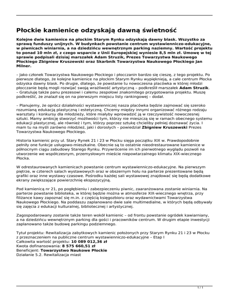 Płockie kamienice odzyskają dawną świetność Kolejne dwie kamienice na płockim Starym Rynku odzyskają dawny blask. Wszystko za sprawą funduszy unijnych. W budynkach powstanie centrum wystawienniczo-edukacyjne, w piwnicach winiarnia, a na dziedzińcu wewnętrznym parking naziemny. Wartość projektu to ponad 10 mln zł, z czego wsparcie z Unii Europejskiej wyniesie 8,5 mln zł. Umowę w tej sprawie podpisali dzisiaj marszałek Adam Struzik, Prezes Towarzystwa Naukowego Płockiego Zbigniew Kruszewski oraz Skarbnik Towarzystwa Naukowego Płockiego Jan Milner. – Jako członek Towarzystwa Naukowego Płockiego i płocczanin bardzo się cieszę, z tego projektu. Po pierwsze dlatego, że kolejne kamienice na płockim Starym Rynku wypięknieją, a całe centrum Płocka odzyska dawny blask. Po drugie, dlatego, że powstanie tu nowoczesna placówka w której młodzi płocczanie będą mogli rozwijać swoją wrażliwość artystyczną – podkreślił marszałek Adam Struzik. – Gratuluję także panu prezesowi i całemu zespołowi znakomitego przygotowania projektu. Muszę podkreślić, że znalazł się on na pierwszym miejscu listy rankingowej – dodał. – Planujemy, że oprócz działalności wystawienniczej nasza placówka będzie zajmować się szeroko rozumianą edukacją plastyczną i estetyczną. Chcemy między innymi organizować różnego rodzaju warsztaty i konkursy dla młodzieży, które miałyby wprowadzić ją w rzeczywistość nowoczesnej sztuki. Mamy ambicję stworzyć możliwości tym, którzy nie mieszczą się w ramach obecnego systemu edukacji plastycznej, ale również i tym, którzy poprzez sztukę chcieliby pełniej doznawać życia. I mam tu na myśli zarówno młodzież, jaki i dorosłych – powiedział Zbigniew Kruszewski Prezes Towarzystwa Naukowego Płockiego. Historia kamienic przy ul. Stary Rynek 21 i 23 w Płocku sięga początku XIX w. Prawdopodobnie pełniły one funkcje usługowo-mieszkalne. Obecnie są to ostatnie nieodrestaurowane kamienice w północnym ciągu zabudowy Starego Rynku. Przywrócenie im ich pierwotnego wyglądu pozwoli na utworzenie we współczesnym, przemysłowym mieście niepowtarzalnego klimatu XIX-wiecznego Płocka. W odrestaurowanych kamienicach powstanie centrum wystawienniczo-edukacyjne. Na pierwszym piętrze, w czterech salach wystawowych oraz w obszernym holu na parterze prezentowane będą grafiki oraz inne wystawy czasowe. Pośrodku każdej sali wystawowej znajdować się będą dodatkowe ekrany zwiększające powierzchnię ekspozycyjną. Pod kamienicą nr 21, po pogłębieniu i zabezpieczeniu piwnic, zaaranżowana zostanie winiarnia. Na parterze powstanie biblioteka, w której będzie można w atmosferze XIX-wiecznego wnętrza, przy filiżance kawy zapoznać się m.in. z częścią księgozbioru oraz wydawnictwami Towarzystwa Naukowego Płockiego. Na poddaszu zaplanowano dwie sale multimedialne, w których będą odbywały się zajęcia z edukacji kulturalnej, bibliotecznej i artystycznej. Zagospodarowany zostanie także teren wokół kamienic – od frontu powstanie ogródek kawiarniany, a na dziedzińcu wewnętrznym parking dla gości i pracowników centrum. W drugim etapie inwestycji zaplanowano także budowę parkingu podziemnego. Tytuł projektu: Rewitalizacja zabytkowych kamienic położonych przy Starym Rynku 21 i 23 w Płocku z przeznaczeniem na publiczne centrum wystawienniczo-edukacyjne – Etap I Całkowita wartość projektu: 10 089 012,36 zł Kwota dofinansowania: 8 575 660,51 zł Beneficjent: Towarzystwo Naukowe Płockie Działanie 5.2. Rewitalizacja miast 1/1
