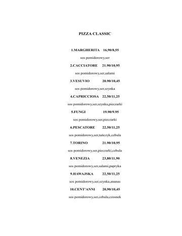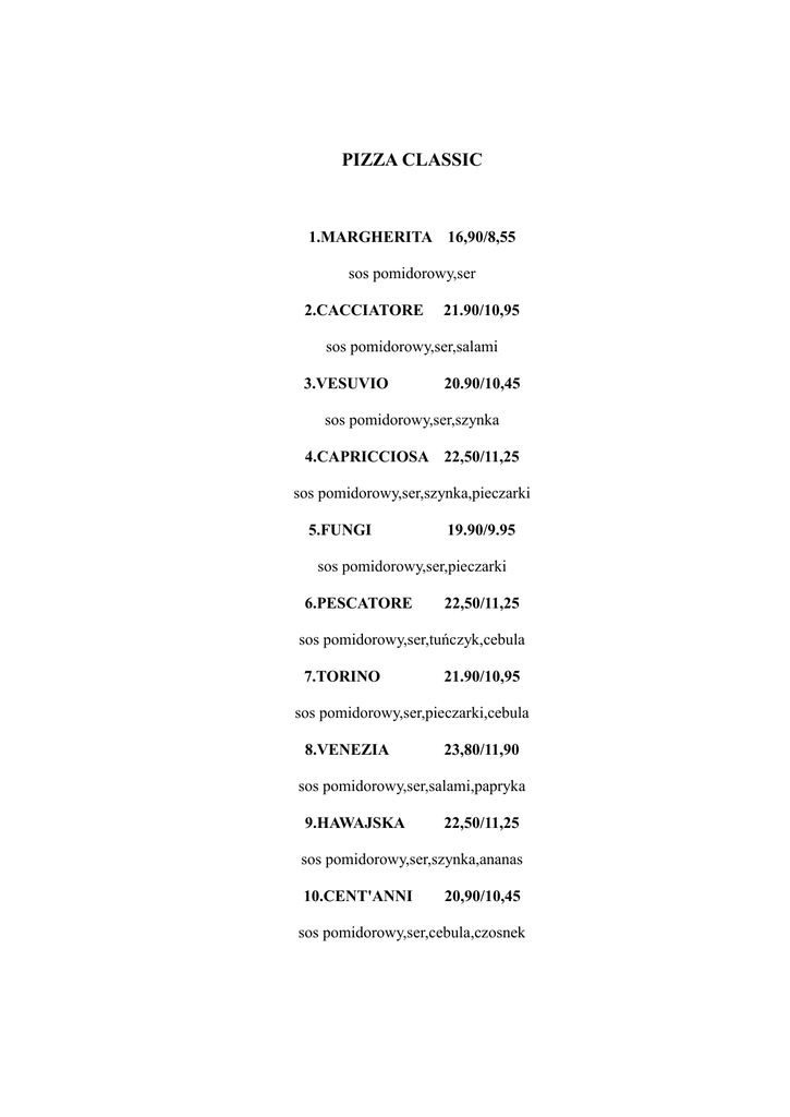 PIZZA CLASSIC 1.MARGHERITA 16,90/8,55 sos pomidorowy,ser 2.CACCIATORE 21.90/10,95 sos pomidorowy,ser,salami 3.VESUVIO 20.90/10,45 sos pomidorowy,ser,szynka 4.CAPRICCIOSA 22,50/11,25 sos pomidorowy,ser,szynka,pieczarki 5.FUNGI 19.90/9.95 sos pomidorowy,ser,pieczarki 6.PESCATORE 22,50/11,25 sos pomidorowy,ser,tuńczyk,cebula 7.TORINO 21.90/10,95 sos pomidorowy,ser,pieczarki,cebula 8.VENEZIA 23,80/11,90 sos pomidorowy,ser,salami,papryka 9.HAWAJSKA 22,50/11,25 sos pomidorowy,ser,szynka,ananas 10.CENT'ANNI 20,90/10,45 sos pomidorowy,ser,cebula,czosnek