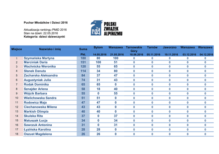 Puchar Młodzików i Dzieci 2016 Aktualizacja rankingu PMiD 2016 Stan na dzień: 22.05.2016 Kategoria: dzieci dziewczynki Miejsce Nazwisko i imię Suma Pkt. 1 2 3 4 5 6 7 8 9 10 11 12 13 14 15 16 17 18 Szymańska Martyna Marciniak Daria Wachnicka Weronika Słanek Danuta Zacharska Aleksandra Augustyniak Julia Rodak Dominika Sznajder Arlena Wójcik Barbara Wielichowska Sandra Rodowicz Maja Ciechanowska Milena Markish Olimpia Skulska Rita Matuszak Łucja Sawczuk Antonina Łyzińska Karolina Oszust Magdalena 180 151 120 114 84 74 65 58 55 51 47 43 40 37 34 31 28 26 Bytom 14.05.2016 80 100 55 34 37 31 65 18 0 51 47 43 40 0 0 0 28 26 Warszawa 21.05.2016 100 51 65 80 47 43 0 40 55 0 0 0 0 37 34 31 0 0 Tarnowskie Góry 18.06.2016 Tarnów 05.11.2016 Jaworzno 19.11.2016 Warszawa 03.12.2016 Warszawa 04.12.2016 0 0 0 0 0 0 0 0 0 0 0 0 0 0 0 0 0 0 0 0 0 0 0 0 0 0 0 0 0 0 0 0 0 0 0 0 0 0 0 0 0 0 0 0 0 0 0 0 0 0 0 0 0 0 0 0 0 0 0 0 0 0 0 0 0 0 0 0 0 0 0 0 0 0 0 0 0 0 0 0 0 0 0 0 0 0 0 0 0 0 19 20 21 22 23 24 25 26 27 Garbacka Alicja Kierzkowska Maja Zub Amelia Kaszyńska Kinga Złotowska Joanna Szymczyk Klara Wawełczyk Wiktoria Skrzynska Antonina Kowalska Anna 24 22 20 16 14 12 10 9 8 24 22 20 16 14 12 10 9 8 0 0 0 0 0 0 0 0 0 0 0 0 0 0 0 0 0 0 0 0 0 0 0 0 0 0 0 0 0 0 0 0 0 0 0 0 0 0 0 0 0 0 0 0 0 0 0 0 0 0 0 0 0 0 Punkty rankingowe za poszczególne miejsca Miejsce Liczba Miejsce punktów Liczba punktów Miejsce Liczba punktów 100 80 65 55 51 47 43 40 37 34 31 28 26 24 22 20 18 16 14 12 21 22 23 24 25 26 27 28 29 30 10 9 8 7 6 5 4 3 2 1 Do klasyfikacji 2016 liczone są wszystkie edycje PMiD 1 2 3 4 5 6 7 8 9 10 11 12 13 14 15 16 17 18 19 20