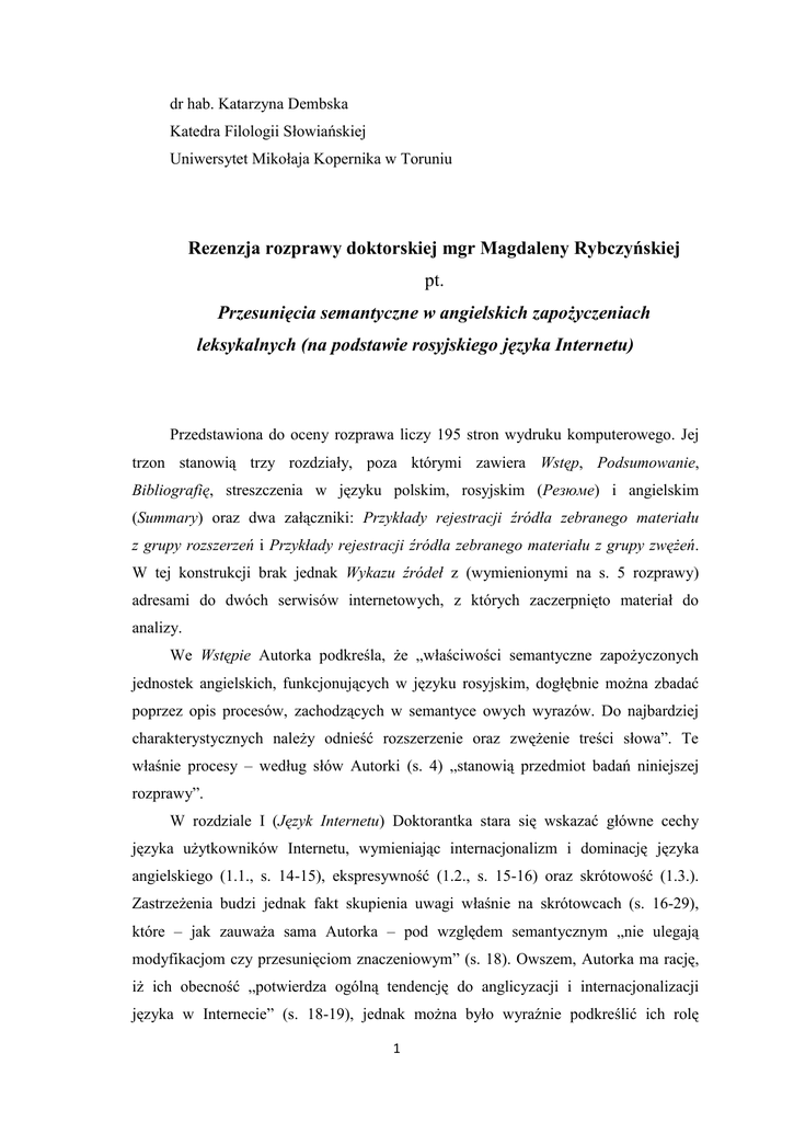 dr hab. Katarzyna Dembska Katedra Filologii Słowiańskiej Uniwersytet Mikołaja Kopernika w Toruniu Rezenzja rozprawy doktorskiej mgr Magdaleny Rybczyńskiej pt. Przesunięcia semantyczne w angielskich zapożyczeniach leksykalnych (na podstawie rosyjskiego języka Internetu) Przedstawiona do oceny rozprawa liczy 195 stron wydruku komputerowego. Jej trzon stanowią trzy rozdziały, poza którymi zawiera Wstęp, Podsumowanie, Bibliografię, streszczenia w języku polskim, rosyjskim (Резюме) i angielskim (Summary) oraz dwa załączniki: Przykłady rejestracji źródła zebranego materiału z grupy rozszerzeń i Przykłady rejestracji źródła zebranego materiału z grupy zwężeń. W tej konstrukcji brak jednak Wykazu źródeł z (wymienionymi na s. 5 rozprawy) adresami do dwóch serwisów internetowych, z których zaczerpnięto materiał do analizy. We Wstępie Autorka podkreśla, że „właściwości semantyczne zapożyczonych jednostek angielskich, funkcjonujących w języku rosyjskim, dogłębnie można zbadać poprzez opis procesów, zachodzących w semantyce owych wyrazów. Do najbardziej charakterystycznych należy odnieść rozszerzenie oraz zwężenie treści słowa”. Te właśnie procesy – według słów Autorki (s. 4) „stanowią przedmiot badań niniejszej rozprawy”. W rozdziale I (Język Internetu) Doktorantka stara się wskazać główne cechy języka użytkowników Internetu, wymieniając internacjonalizm i dominację języka angielskiego (1.1., s. 14-15), ekspresywność (1.2., s. 15-16) oraz skrótowość (1.3.). Zastrzeżenia budzi jednak fakt skupienia uwagi właśnie na skrótowcach (s. 16-29), które – jak zauważa sama Autorka – pod względem semantycznym „nie ulegają modyfikacjom czy przesunięciom znaczeniowym” (s. 18). Owszem, Autorka ma rację, iż ich obecność „potwierdza ogólną tendencję do anglicyzacji i internacjonalizacji języka w Internecie” (s. 18-19), jednak można było wyraźnie podkreślić ich rolę 1 w części 1.1. (Internacjonalizm i dominacja języka angielskiego), co stanowiłoby jej dopełnienie. W obecnym kształcie rozprawy Autorka poświęciła dominacji języka angielskiego jedynie stronę tekstu (pół na s. 14. i pół na 15.), a analizie wybranych skrótowców (która nie wnosi żadnej wartości merytorycznej do pracy traktującej w zamierzeniu (i zgodnie z tytułem) o przesunięciach semantycznych w zapożyczeniach z języka angielskiego stron ponad 10, co wydaje się zabiegiem kontrowersyjnym. Rozdział II (Teoretyczne podstawy semantycznego opisu wyrażeń językowych) stanowi swoistą metodologiczną bazę pojęciową zaczerpniętą z publikacji takich semantyków światowego formatu, jak: Anna Wierzbicka, Jurij Apresjan, Aleksy Awdiejew, Maciej Grochowski. Doktorantka wyjaśnia zatem pojęcie znaczenia w semantyce (2.1., s. 36-37), zwraca uwagę na rolę kontekstu i konotacji w opisie semantycznym (2.2., s. 37-40), charakteryzuje przeobrażenia semantyczne (2.3., s. 4044) oraz podejmuje problematykę odzwierciedlenia w znaczeniach słów aspektów kulturowych (2.4. s. 44-50). Do tej części, ze względu na jej odtwórczy i stricte teoretyczny charakter, trudno mieć zastrzeżenia. Najwięcej kontrowersji wzbudza obszerna analityczna część rozprawy – rozdział III (Analiza semantyczna), na której skoncentruję swoją uwagę. Autorka wyraźnie podkreśla, że przedstawiona w tej części rozprawy analiza „ma charakter porównawczy, przedstawia różne możliwości odbioru sensu słów podawanych w dwujęzycznych słownikach jako ekwiwalenty obcojęzyczne” (s. 53) oraz: „Analizując znaczenia wybranych anglicyzmów, używanych w rosyjskim środowisku internetowym, przywołujemy różne scenariusze i standardy słowa w obu językach z uwzględnieniem stopnia pokrycia ich granic znaczeniowych. Nawiązujemy więc do jednego z podstawowych poziomów gramatyki komunikacyjnej, tj. poziomu ideacyjnego” (s. 54-55). Słusznie przyjęta metoda opisu, pogłębiająca analizę i czyniąca ją wieloaspektową, nie ma jednak odniesienia do tytułu rozprawy, w którym wyraźnie mowa o przesunięciach semantycznych w angielskich zapożyczeniach, nie zaś o relacjach między zapożyczeniami a rosyjskojęzycznymi ekwiwalentami. Cały rozdział podzielony jest na dwie części: Rozszerzenia semantyczne oraz Zwężenia semantyczne, jednak po lekturze obydwu okazuje się, że to wcale nie owe procesy stanowią istotę opisu, a na plan pierwszy wysuwają się właśnie relacje semantyczne między jednostkami zapożyczonymi oraz ich rosyjskimi ekwiwalentami, o czym świadczą losowo wybrane przykłady: 2 - s. 67: „Wyraz drive i jego rosyjskie odpowiedniki – напористость, сила – różnią się znacząco”, po czym następuje analiza owych różnic, - s. 74 (analiza pożyczki истеблишмент): „Standardy, jakie kryją się w pożyczce, różnią się więc od rosyjskiego słowa учреждение”, po czym podane są stosowne ilustracje tekstowe, a następnie pojawia się informacja (s. 75): „Słowo angielskie niesie konotacje ujemne, podczas gdy rosyjskie odpowiedniki podawane w dwujęzycznych słownikach mają charakter neutralny. Pożyczka znajduje więc zastosowanie w kontekstach krytyki władzy, która często jest oceniana negatywnie z powodu swojej niechęci do zmian” (po czym następują stosowne ilustracje tekstowe), - s. 78 (analiza zapożyczenia ивент): „Zakres zastosowania angielskiego słowa jest szerszy, ponieważ implikuje różnego rodzaju wydarzenia, imprezy, kwesty, konkursy, rozgrywki sportowe lub gry” i dalej, na s. 79: „Brak w rosyjskich odpowiednikach dodatkowego odcienia podniosłości, społecznego akcentu oraz zabawy i rozrywki sprawia, że angielski ekwiwalent jest niezbędny dla uzyskania specjalnej konotacji słowa”, - s. 79 (analiza zapożyczenia фидбэк): „Rosyjski odpowiednik ma odcień neutralny, podczas gdy zapożyczenie