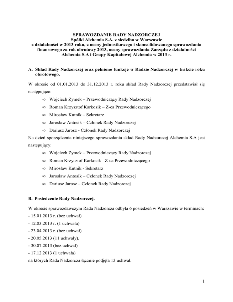 SPRAWOZDANIE RADY NADZORCZEJ Spółki Alchemia S.A. z siedziba w Warszawie z działalności w 2013 roku, z oceny jednostkowego i skonsolidowanego sprawozdania finansowego za rok obrotowy 2013, oceny sprawozdania Zarządu z działalności Alchemia S.A i Grupy Kapitałowej Alchemia w 2013 r. A. Skład Rady Nadzorczej oraz pełnione funkcje w Radzie Nadzorczej w trakcie roku obrotowego. W okresie od 01.01.2013 do 31.12.2013 r. roku skład Rady Nadzorczej przedstawiał się następująco: • Wojciech Zymek – Przewodniczący Rady Nadzorczej • Roman Krzysztof Karkosik – Z-ca Przewodniczącego • Mirosław Kutnik – Sekretarz • Jarosław Antosik – Członek Rady Nadzorczej • Dariusz Jarosz - Członek Rady Nadzorczej Na dzień sporządzenia niniejszego sprawozdania skład Rady Nadzorczej Alchemia S.A jest następujący: • Wojciech Zymek – Przewodniczący Rady Nadzorczej • Roman Krzysztof Karkosik - Z-ca Przewodniczącego • Mirosław Kutnik - Sekretarz • Jarosław Antosik – Członek Rady Nadzorczej • Dariusz Jarosz – Członek Rady Nadzorczej B. Posiedzenie Rady Nadzorczej. W okresie sprawozdawczym Rada Nadzorcza odbyła 6 posiedzeń w Warszawie w terminach: - 15.01.2013 r. (bez uchwał) - 12.03.2013 r. (1 uchwała) - 23.04.2013 r. (bez uchwał) - 20.05.2013 (11 uchwały), - 30.07.2013 (bez uchwał) - 17.12.2013 (1 uchwała) na których Rada Nadzorcza łącznie podjęła 13 uchwał. 1 Rada Nadzorcza w okresie sprawozdawczym wykonywała działania wynikające z przepisów Kodeksu spółek handlowych, Statutu Spółki, Regulaminu Rady Nadzorczej, a także innych obowiązujących przepisów prawa. W swoich działaniach Rada Nadzorcza koncentrowała się głównie na analizie bieżących wyników ekonomiczno – finansowych Spółki, analizie okresowych sprawozdań finansowych, ocenie realizacji planowanych zadań dla Zarządu i na analizie bieżącej działalności Spółki. Rada Nadzorcza zlecała Zarządowi opracowanie stosownych dokumentów, analiz i opracowań niezbędnych do oceny zagrożeń i podejmowanych działań, celem omówienia i podjęcia stosownych uchwał. Udzielała konsultacji Zarządowi spółki w podejmowaniu strategicznych dla przedsiębiorstwa decyzji. Na każdym posiedzeniu w roku obrotowym 2013 Rada Nadzorcza była informowana przez Zarząd o wynikach ekonomicznofinansowych i bieżącej i planowanej działalności Spółki Alchemia S.A. oraz Grupy Kapitałowej Alchemia. Poniżej przedstawiono podstawowe zagadnienia omawiane podczas posiedzeń Rady Nadzorczej w 2013 r. − działania zmierzające do zamknięcia roku obrotowego 2012 – ocena sprawozdań finansowych, sprawozdań Zarządu z działalności Spółki Alchemia S.A. oraz Grupy Kapitałowej Alchemia, − opiniowanie wniosku Zarządu Spółki w zakresie sposobu podziału zysku za rok 2012, − analiza bieżącej sytuacji ekonomiczno-finansowej Spółki Alchemia S.A. oraz spółek zależnych z Grupy Kapitałowej Alchemia dokonywana na każdym posiedzeniu Rady Nadzorczej, − okresowa kontrola wyników ekonomiczno-finansowych w Spółce Alchemia S.A. oraz w spółkach GK Alchemia, − zmiany w Zarządzie Spółki oraz zatwierdzenie schematu organizacyjnego spółki Alchemia S.A. C. Uchwały Rady Nadzorczej Data Numer Przedmiot podjęcia W sprawie przyznania dodatkowego wynagrodzenia (odprawy pieniężnej) Markowi Sefarinowi - Wiceprezesowi Zarządu 31.01.2013 r. 1/01/2013 Spółki Alchemia S.A. w Warszawie. (uchwała podjęta, za pomocą środków bezpośredniego porozumiewania się na odległość) 2 12.03.2013 r. 1/03/2013 20.05.2013 r. 1/05/2013 20.05.2013 2/05/2013 20.05.2013 3/05/2013 20.05.2013 4/05/2012 20.05.2013 5/05/2012 20.05.2013 6/05/2012 20.05.2013 7/05/2012 20.05.2013 8/05/2012 20.05.2013 9/05/2012 20.05.2013 10/05/2013 20.05.2013 11/05/2013 W sprawie wyboru biegłego rewidenta do przeprowadzenia przeglądu i badania obowiązkowych sprawozdań finansowych na lata 2013-2014 W sprawie przyjęcia sprawozdania Rady Nadzorczej z oceny sprawozdania finansowego Spółki Alchemia S.A w Warszawie za okres od 1 stycznia 2012 r. do 31 grudnia 2012r. W sprawie przyjęcia sprawozdania Rady Nadzorczej z oceny skonsolidowanego sprawozdania finansowego Grupy Kapitałowej Alchemia S.A w Warszawie za okres od 01 stycznia 2012 r. do 31 grudnia 2012 r. W sprawie pozytywnego sprawozdania Zarządu z działalności Spółki Alchemia S.A w Warszawie oraz Grupy Kapitałowej Alchemia za okres od 01 stycznia 2012 r. do 31 grudnia 2012r. W sprawie pozytywnego zaopiniowania wniosku Zarządu w przedmiocie przeznaczenia zysku netto za rok 2012. W sprawie pozytywnego zaopiniowania wniosku Zarządu w przedmiocie udzielenia Pani Karinie Wściubiak Hankó – Prezesowi Zarządu-Dyrektorowi Generalnemu Spółki Alchemia S.A w Warszawie, absolutorium z wykonania przez nią obowiązków Prezesa Zarządu-Dyrektora Generalnego w/w Spółki za okres od 1 stycznia 2012 r. do 31 grudnia 2012r. W sprawie pozytywnego zaopiniowania wniosku Zarządu w przedmiocie udzielenia Panu Rafałowi Regulskiemu – Wiceprezesowi Zarządu Spółki Alchemia S.A., absolutorium z wykonania przez niego obowiązków Wiceprezesa Zarządu Spółki za okres od 1 stycznia 2012 r. do 31 grudnia 2012 r. W sprawie pozytywnego zaopiniowania wniosku Zarządu w przedmiocie udzielenia Panu Markowi Misiakieiwczowi Wiceprezesowi Zarządu Spółki Alchemia S.A w Warszawie, absolutorium w wykonania przez niego obowiązków Wiceprezesa Zarządu w/w Spółki za okres od 1 stycznia 2012 r. do 31 grudnia 2012 r. W sprawie pozytywnego zaopiniowania wniosku Zarządu w przedmiocie udzielenia Panu Markowi Serafinowi Wiceprezesowi Zarządu Spółki Alchemia S.A w Warszawie, absolutorium w wykonania przez niego obowiązków Wiceprezesa Zarządu w/w Spółki za okres od 9 października 2012 r. do 31 grudnia 2012 r. W sprawie przyjęcia sprawozdania Rady Nadzorczej z działalności Spółki Alchemia S.A. w Warszawie za okres od 1 stycznia 2012 r. do 31 grudnia 2012 r.