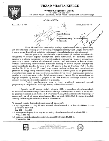 URZĄD MIASTA KIELCE Wydział Księgowości Urzędu Tel. 041 3676220 ul. Rynek 1, 25-303 Kielce - sekretariat, 041 3676000 - centrala UM; .~\\ . j 'Q..; ;/\. ~'. ,,;~(1. 111 lr~Y Urząd Miastjjelce \ • \" ~Pan vF ~,r \ \" I 'Ii ~:::::::bY w Kielcacb zwraca się z prośbą o zajęcie sta Obracbu wej \ .) \ \"- ~ wiska czy prawidłowy jest przedstawiony poniżej sposób ewidencji w księgach rachunk ch Urzędu przychodów i kosztów oraz dochodów i wydatków związanych z transakcj amiany nieruchomości. Obecnie przychody oraz dochody z tytułu transakcji zamiany nieruchomości księgujemy w kwocie dopłaty dokonywanej przez kontrahenta. Po dokładnej analizie przepisów z zakresu rachunkowości oraz interpretacji Ministerstwa Finansów uważamy, że przychody z tytułu zamiany nieruchomości powinny być księgowane w kwocie równej wartości zamienianej nieruchomości, natomiast dochody w kwocie dopłaty dokonywanej przez kontrahenta. Zgodnie bowiem z art. 603 ustawy z dnia 23 kwietnia 1964 r. Kodeks cywilny (Dz. U. Nr 16, poz. 93 ze zm.) przez umowę zamiany każda ze stron zobowiązuje się przenieść na drugą stronę własność rzeczy w zamian za zobowiązanie się do przeniesienia własności innej rzeczy co stanowi również odpłatne zbycie rzeczy. Zamiana jest umową o podobnym charakterze co sprzedaż. Świadczy o tym między innymi fakt, że ustawodawca nie reguluje odrębnie tej umowy, a jedynie wart. 604 Kodeksu cywilnego stanowi, że do zamiany stosuje się odpowiednio przepisy o sprzedaży. Poniżej przedstawiamy dwa przykłady ewidencji księgowej operacji gospodarczych związanych z realizacją umowy zmiany nieruchomości: 1. Zgodnie z art. 15 ustawy z dnia 21 sierpnia 1997r. o gospodarce nieruchomościami, na podstawie aktu notarialnego Gmina Kielce dokonuje zamiany nieruchomości w ten sposób, że przenosi własność nieruchomości A o wartości 40.000,00 zł.na rzecz osoby fizycznej a w zamian nabywa od tej osoby nieruchomość B o wartości 50.000,00zł. i z tytułu transakcji zamiany Gmina wypłaca różnicę w kwocie 10.000,00 zł. W księgach Urzędu dokonuje się następujących księgowań: 1.1 wyksięgowanie z ksiąg Urzędu wartości nieruchomości A w kwocie 40.000 zł.- na podstawie dowodu PT Wn 800 - Ma 011 1.2. zaksięgowanie przychodu z tytułu sprzedaży nieruchomości A w kwocie 40.000 zł. Wn221 Ma 760 1.3 zaksięgowanie kosztu zakupu nieruchomości B w kwocie 50.000 zł. Wn 080 Ma 201 ~i<P 1.4 dokonanie wydatku w kwocie 10.000 zł. stanowiącej różnicę wartości zamienianych nieruchomości Wn 201 - Ma 130 Wn 810 - Ma 800 1.5 zaksięgowanie kompensaty rozrachunków z tytułu zamiany ( kupno-sprzedaż) w kwocie 40.000 zł. Wn 201 -Ma 221 1.6 przyjęcie na stan Gminy nieruchomości B o wartości 50.000 zł - na podst. dowodu OT Wn 011 - Ma 080 2. Zgodnie z art.15 ustawy z dnia 21 sierpnia 1997r. o gospodarce nieruchomościami, na podstawie aktu notarialnego Gmina Kielce dokonuje zamiany nieruchomości w ten sposób, że przenosi własność nieruchomości A o wartości 30.000,00 zł. na rzecz osoby fizycznej a w zamian nabywa od tej osoby nieruchomość B o wartości 10.000,00zł. i z tytułu transakcji osoba fizyczna jest zobowiązana do dopłaty różnicy w kwocie 20.000,00 zł. W księgach Urzędu dokonuje się następujących księgowań: 2.1. wyksięgowanie z ksiąg Urzędu wartości nieruchomości A w kwocie 30.000 zł.- na podstawie dowodu PT Wn 800 - Ma 011 2.2 zaksięgowanie przychodu z tytułu sprzedaży nieruchomości A w kwocie 30.000 zł. Wn 221 - Ma 760 2.3 zaksięgowanie kosztu zakupu nieruchomości B w kwocie 10.000 zł. Wn 080 - Ma 201 2.4 wpływ na rachunek dochodów Urzędu kwoty 20.000 zł. stanowiącej różnicę wartości zamienianych nieruchomości Wn 130 - Ma 221 2.5 zaksięgowanie kompensaty rozrachunków z tytułu zamiany ( kupno-sprzedaż) w kwocie 10.000 zł. Wn 201 -Ma 221 2.6 przyjęcie na stan Gminy nieruchomości B o wartości 10.000 zł - na podst. dowodu OT- ewidencja w księgach Urzędu Wn 011 - Ma 080. Dodatkowo WYJasmamy, że konta księgowe wykorzystywane w Urzędzie zgodne są z wytycznymi wynikającymi z Rozporządzenia Ministra Finansów z dnia 28 lipca 2006r. w sprawie szczegółowych zasad rachunkowości oraz planów kont dla budżetu państwa, budżetów jednostek samorządu terytorialnego oraz niektórych jednostek sektora finansów publicznych (Dz.U. nr 142, poz. 1020 ze zm.). Prosimy o zajęcie stanowiska w zakresie przedstawionego problemu. ! :\~