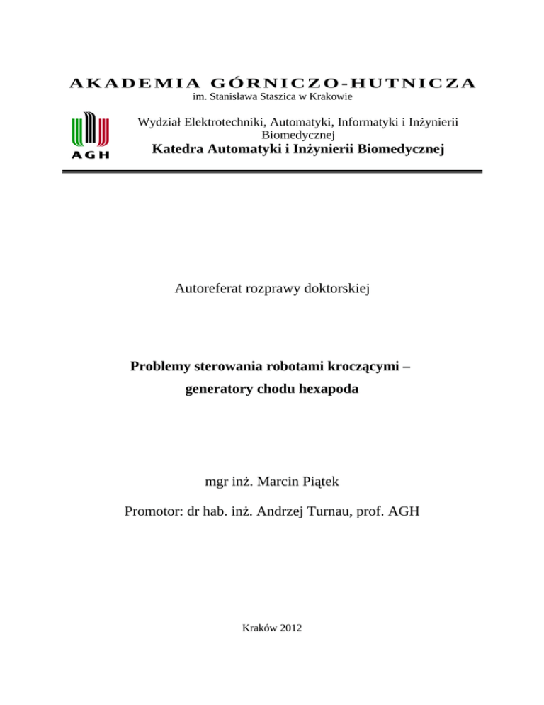 AKADEMIA GÓRNICZO-HUTNICZA im. Stanisława Staszica w Krakowie Wydział Elektrotechniki, Automatyki, Informatyki i Inżynierii Biomedycznej Katedra Automatyki i Inżynierii Biomedycznej Autoreferat rozprawy doktorskiej Problemy sterowania robotami kroczącymi – generatory chodu hexapoda mgr inż. Marcin Piątek Promotor: dr hab. inż. Andrzej Turnau, prof. AGH Kraków 2012 1. Wprowadzenie i zakres pracy Roboty kroczące wśród mobilnych stanowią szczególną grupę. Naśladują sposób poruszania się człowieka i zwierząt. Większa ilość nóg u zwierzęcia czy robota to lepsza równowaga czyli stabilność statyczna i dynamiczna. Nieprzypadkowo w pracy wybór pada na sześcionoga. Taki robot pokonuje przeszkody, kroczy stabilnie po schodach, nie przewraca się po zatrzymaniu, korzysta z kilku rodzajów chodu. W tym celu robot wymaga wyposażenia go w Główny Generator Wzorców (ang. Central Pattern Generator) i w rozbudowany układ sterowania tym generatorem. Za ruch każdej z nóg robota odpowiadają trzy serwomechanizmy. Panowanie nad ruchem całego robotem jest złożonym zadaniem równoczesnego sterowania osiemnastoma serwomechanizmami w czasie rzeczywistym. Celem głównym rozprawy doktorskiej jest zbudowanie i przebadanie generatora chodu hexapoda. Po pierwsze, chodzi o wszelkie możliwe praktycznie realizowalne rodzaje chodu, zarówno te, które obserwujemy w przyrodzie wśród sześcionogów jak i takie, dla których nie ma wzorców biologicznych. Po drugie przedmiotem zainteresowania jest nie tylko pojedynczy rodzaj chodu, ale przede wszystkim płynna zmiana poruszania się przy przejściu z jednego rodzaju chodu w drugi. W pracy, tym zagadnieniom poświęca się największy wysiłek eksperymentalno-badawczy. Poczynając od oscylatorów liniowych przez nieliniowe skupiono się ostatecznie na oscylatorach Toda-Rayleigha. Celem pobocznym pracy jest konstrukcja hexapoda i innych niezbędnych narzędzi w postaci stanowiska uruchomieniowego programowo-sprzętowego. Realizacja celu pobocznego pozwala na weryfikację poprawności projektowanych algorytmów i analizę jakościową uzyskanych rozwiązań. Rysunek 1 przedstawia stanowisko robota wykorzystane podczas eksperymentów. Rysunek 1: Robot kroczący 2 2. Tezy pracy Sformułowano następujące tezy rozprawy doktorskiej. 1. Obserwacja działania wzorców biologicznych jest najbardziej naturalnym sposobem budowy nieznanych algorytmów ruchu gwarantującym zadowalający efekt kroczenia, a nawet w wielu przypadkach najlepszym z możliwych. 2. Zastosowanie zbiorów oscylatorów nieliniowych w modelu CPG – Central Pattern Generator pozwala na osiągnięcie płynnych przejść pomiędzy trybami chodu. 3. Zastosowanie oscylatorów nieliniowych umożliwia efektywną realizację CPG w układzie mikroprocesorowym. W celu weryfikacji powyższych tez skonstruowano stanowisko sześcionożnego robota kroczącego i przygotowano trzy algorytmy sterujące kroczeniem. Pierwszy algorytm – oparty na oscylatorach liniowych nie przyniósł spodziewanych efektów. Drugi algorytm oparto na równaniach oscylatorów nieliniowych Rayleigha i Van der Pola. Trzeci algorytm oparto na układzie oscylatorów nazywanych kratą Toda-Rayleigha. Wyniki przeprowadzonych badań dla algorytmu drugiego i trzeciego potwierdziły słuszność postawionych tez. Potwierdziła się także teza, że oscylatory nieliniowe mogą być z powodzeniem zaimplementowane mikroprocesorowo jako program generatora chodu CPG. 3. Przedmiot pracy W rozdziale drugim rozprawy doktorskiej zdefiniowano podstawowe pojęcia związane z chodem zwierząt i owadów. Przedstawiono wzorce biologiczne chodów owadów sześcionożnych. Chody biologiczne inspirowały autora do zaprojektowania chodu robota kroczącego. Trzeci rozdział pracy przedstawia budowę stanowiska badawczego przygotowanego w celu weryfikacji tez pracy i przyszłych badań. Stanowisko składa się z mechanicznej konstrukcji robota sześcionożnego i mikroprocesorowego systemu sterującego w czasie rzeczywistym z odpowiednim oprogramowaniem. Rozdział ten przedstawia także stosowaną w pracy metodykę badań naukowych z wykorzystaniem modeli symulacyjnych. W rozdziale czwartym opisano proces powstawania i budowę modelu matematycznego stanowiska robota opracowanego w pakiecie MATLAB & Simulink. Model pozwolił na zastosowanie techniki szybkiego prototypowania podczas syntezy algorytmów sterujących, a także ułatwił ocenę jakości uzyskanych wyników eksperymentalnych. Przygotowany model matematyczny składa się z następujących elementów: 3 • zidentyfikowanego modelu serwomechanizmu, • obserwatora stanu układu serwomechanizmu, • zadania prostego kinematyki położenia, • zadania prostego kinematyki prędkości, • odwrotnego zadania kinematyki. W kolejnych rozdziałach pracy przedstawiono algorytmy sterujące chodem robota sześcionożnego opracowane przez autora. Stanowisko robota kroczącego domyślnie ustawione jest w pozycji bazowej (patrz rysunek 1). Podczas chodu końcówki nóg robota nigdy nie osiągają położeń, w których znajdują się w pozycji bazowej, stąd wynika potrzeba wprowadzenia fazy rozruchu. Proces sterowania chodem robota podzielono na trzy fazy: • fazę rozruchu – czyli etap pośredni pomiędzy bazową pozycją robota, a chodem właściwym, • chód właściwy – czyli realizację trajektorii końcówki nogi charakterystycznej dla danego rodzaju chodu, • fazę zatrzymania – czyli etap pośredni pomiędzy chodem właściwym, a pozycją bazową robota. Podczas prac nad algorytmami autor zwracał szczególną uwagę na to, by każde z prezentowanych rozwiązań generowało poprawne sygnały sterujące dla wszystkich sześciu nóg z uwzględnieniem wszystkich wymienionych faz chodu. Ruch końcówki nogi podczas chodu właściwego przemierza trajektorię przypominającą elipsę. Różne rodzaje chodu uzyskuje się dzięki odpowiedniej synchronizacji ruchu nóg w czasi