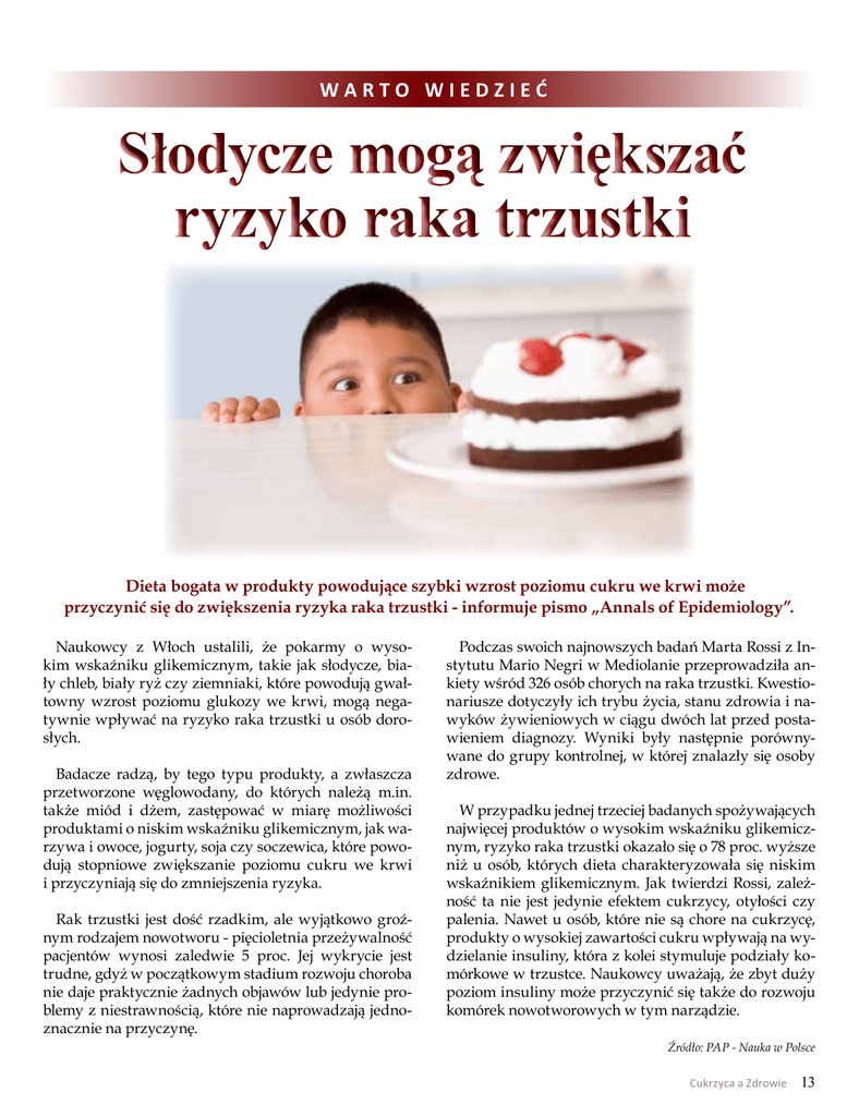 WARTO WIEDZIEĆ Słodycze mogą zwiększać ryzyko raka trzustki Dieta bogata w produkty powodujące szybki wzrost poziomu cukru we krwi może przyczynić się do zwiększenia ryzyka raka trzustki - informuje pismo „Annals of Epidemiology”. Naukowcy z Włoch ustalili, że pokarmy o wysokim wskaźniku glikemicznym, takie jak słodycze, biały chleb, biały ryż czy ziemniaki, które powodują gwałtowny wzrost poziomu glukozy we krwi, mogą negatywnie wpływać na ryzyko raka trzustki u osób dorosłych. Badacze radzą, by tego typu produkty, a zwłaszcza przetworzone węglowodany, do których należą m.in. także miód i dżem, zastępować w miarę możliwości produktami o niskim wskaźniku glikemicznym, jak warzywa i owoce, jogurty, soja czy soczewica, które powodują stopniowe zwiększanie poziomu cukru we krwi i przyczyniają się do zmniejszenia ryzyka. Rak trzustki jest dość rzadkim, ale wyjątkowo groźnym rodzajem nowotworu - pięcioletnia przeżywalność pacjentów wynosi zaledwie 5 proc. Jej wykrycie jest trudne, gdyż w początkowym stadium rozwoju choroba nie daje praktycznie żadnych objawów lub jedynie problemy z niestrawnością, które nie naprowadzają jednoznacznie na przyczynę. Podczas swoich najnowszych badań Marta Rossi z Instytutu Mario Negri w Mediolanie przeprowadziła ankiety wśród 326 osób chorych na raka trzustki. Kwestionariusze dotyczyły ich trybu życia, stanu zdrowia i nawyków żywieniowych w ciągu dwóch lat przed postawieniem diagnozy. Wyniki były następnie porównywane do grupy kontrolnej, w której znalazły się osoby zdrowe. W przypadku jednej trzeciej badanych spożywających najwięcej produktów o wysokim wskaźniku glikemicznym, ryzyko raka trzustki okazało się o 78 proc. wyższe niż u osób, których dieta charakteryzowała się niskim wskaźnikiem glikemicznym. Jak twierdzi Rossi, zależność ta nie jest jedynie efektem cukrzycy, otyłości czy palenia. Nawet u osób, które nie są chore na cukrzycę, produkty o wysokiej zawartości cukru wpływają na wydzielanie insuliny, która z kolei stymuluje podziały komórkowe w trzustce. Naukowcy uważają, że zbyt duży poziom insuliny może przyczynić się także do rozwoju komórek nowotworowych w tym narządzie. Źródło: PAP - Nauka w Polsce Cukrzyca a Zdrowie 13