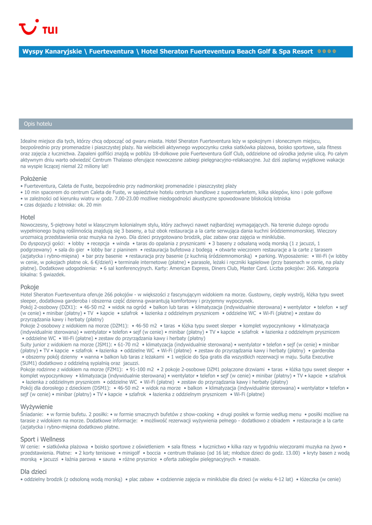 Wyspy Kanaryjskie \ Fuerteventura \ Hotel Sheraton Fuerteventura Beach Golf & Spa Resort Opis hotelu Idealne miejsce dla tych, którzy chcą odpocząć od gwaru miasta. Hotel Sheraton Fuerteventura leży w spokojnym i słonecznym miejscu, bezpośrednio przy promenadzie i piaszczystej plaży. Na wielbicieli aktywnego wypoczynku czeka siatkówka plażowa, boisko sportowe, sala fitness oraz zajęcia z łucznictwa. Zapaleni golfiści znajdą w pobliżu 18-dołkowe pole Fuerteventura Golf Club, oddzielone od ośrodka jedynie ulicą. Po całym aktywnym dniu warto odwiedzić Centrum Thalasso oferujące nowoczesne zabiegi pielęgnacyjno-relaksacyjne. Już dziś zaplanuj wyjątkowe wakacje na wyspie liczącej niemal 22 miliony lat! Położenie • • • • Fuerteventura, Caleta de Fuste, bezpośrednio przy nadmorskiej promenadzie i piaszczystej plaży 10 min spacerem do centrum Caleta de Fuste, w sąsiedztwie hotelu centrum handlowe z supermarketem, kilka sklepów, kino i pole golfowe w zależności od kierunku wiatru w godz. 7.00-23.00 możliwe niedogodności akustyczne spowodowane bliskością lotniska czas dojazdu z lotniska: ok. 20 min Hotel Nowoczesny, 5-piętrowy hotel w klasycznym kolonialnym stylu, który zachwyci nawet najbardziej wymagających. Na terenie dużego ogrodu wypełnionego bujną roślinnością znajdują się 3 baseny, a tuż obok restauracja a la carte serwująca dania kuchni śródziemnomorskiej. Wieczory urozmaicą przedstawienia oraz muzyka na żywo. Dla dzieci przygotowano brodzik, plac zabaw oraz zajęcia w miniklubie. Do dyspozycji gości: • lobby • recepcja • winda • taras do opalania z prysznicami • 3 baseny z odsalaną wodą morską (1 z jacuzzi, 1 podgrzewany) • sala do gier • lobby bar z pianinem • restauracja bufetowa z bodegą • otwarte wieczorem restauracje a la carte z tarasem (azjatycka i rybno-mięsna) • bar przy basenie • restauracja przy basenie (z kuchnią śródziemnomorską) • parking. Wyposażenie: • Wi-Fi (w lobby w cenie, w pokojach płatne ok. 6 €/dzień) • terminale internetowe (płatne) • parasole, leżaki i ręczniki kąpielowe (przy basenach w cenie, na plaży płatne). Dodatkowe udogodnienia: • 6 sal konferencyjnych. Karty: American Express, Diners Club, Master Card. Liczba pokojów: 266. Kategoria lokalna: 5 gwiazdek. Pokoje Hotel Sheraton Fuerteventura oferuje 266 pokojów - w większości z fascynującym widokiem na morze. Gustowny, ciepły wystrój, łóżka typu sweet sleeper, dodatkowa garderoba i obszerna część dzienna gwarantują komfortowy i przyjemny wypoczynek. Pokój 2-osobowy (DZX1): • 46-50 m2 • widok na ogród • balkon lub taras • klimatyzacja (indywidualnie sterowana) • wentylator • telefon • sejf (w cenie) • minibar (płatny) • TV • kapcie • szlafrok • łazienka z oddzielnym prysznicem • oddzielne WC • Wi-Fi (płatne) • zestaw do przyrządzania kawy i herbaty (płatny) Pokoje 2-osobowy z widokiem na morze (DZM1): • 46-50 m2 • taras • łóżka typu sweet sleeper • komplet wypoczynkowy • klimatyzacja (indywidualnie sterowana) • wentylator • telefon • sejf (w cenie) • minibar (płatny) • TV • kapcie • szlafrok • łazienka z oddzielnym prysznicem • oddzielne WC • Wi-Fi (płatne) • zestaw do przyrządzania kawy i herbaty (płatny) Suity junior z widokiem na morze (JSM1): • 61-70 m2 • klimatyzacja (indywidualnie sterowana) • wentylator • telefon • sejf (w cenie) • minibar (płatny) • TV • kapcie • szlafrok • łazienka • oddzielne WC • Wi-Fi (płatne) • zestaw do przyrządzania kawy i herbaty (płatny) • garderoba • obszerny pokój dzienny • wanna • balkon lub taras z leżakami • 1 wejście do Spa gratis dla wszystkich rezerwacji w maju. Suita Executive (SUM1) dodatkowo z oddzielną sypialnią oraz jacuzzi. Pokoje rodzinne z widokiem na morze (FZM1): • 91-100 m2 • 2 pokoje 2-osobowe DZM1 połączone drzwiami • taras • łóżka typu sweet sleeper • komplet wypoczynkowy • klimatyzacja (indywidualnie sterowana) • wentylator • telefon • sejf (w cenie) • minibar (płatny) • TV • kapcie • szlafrok • łazienka z oddzielnym prysznicem • oddzielne WC • Wi-Fi (płatne) • zestaw do przyrządzania kawy i herbaty (płatny) Pokój dla dorosłego z dzieckiem (DSM1): • 46-50 m2 • widok na morze • balkon • klimatyzacja (indywidualnie sterowana) • wentylator • telefon • sejf (w cenie) • minibar (płatny) • TV • kapcie • szlafrok • łazienka z oddzielnym prysznicem • Wi-Fi (płatne) Wyżywienie Śniadanie: • w formie bufetu. 2 posiłki: • w formie smacznych bufetów z show-cooking • drugi posiłek w formie według menu • posiłki możliwe na tarasie z widokiem na morze. Dodatkowe informacje: • możliwość rezerwacji wyżywienia pełnego - dodatkowo z obiadem • restauracje a la carte (azjatycka i rybno-mięsna dodatkowo płatne. Sport i Wellness W cenie: • siatkówka plażowa • boisko sportowe z oświetleniem • sala fitness • łucznictwo • kilka razy w tygodniu wieczorami muzyka na żywo • przedstawienia. Płatne: • 2 korty tenisowe • minigolf • boccia • centrum thalasso (od 16 lat; młodsze dzieci do godz. 13.00) • kryty basen z wodą morską • jacuzzi • łaźnia parowa • sauna • różne prysznice • oferta zabiegów pielęgnacyjnych • masaże. Dla dzieci • oddzielny brodzik (z odsoloną wodą morską) • plac zabaw • codziennie zajęcia w miniklubie dla dzieci (w wieku 4-12 lat) • łóżeczka (w cenie)