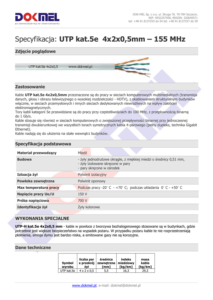 DOK-MEL Sp. z o.o. ul. Struga 76. 70-784 Szczecin, NIP: 9552257500, REGON: 320640571 tel: +48 91 8137253 do 54 tel: +48 91 8137257 do 59 Specyfikacja: UTP kat.5e 4x2x0,5mm – 155 MHz Zdjęcie poglądowe Zastosowanie Kable UTP kat.5e 4x2x0,5mm przeznaczone są do pracy w sieciach komputerowych multimedialnych (transmisja danych, głosu i obrazu telewizyjnego o wysokiej rozdzielczości - HDTV), z okablowaniem strukturalnym budynków włącznie, w sieciach przemysłowych i innych sieciach dedykowanych niewrażliwych na wpływ zakłóceń elektromagnetycznych. Tory kabli kategorii 5e przewidziane są do pracy przy częstotliwościach do 100 MHz, z przepływnością binarną do 1 Gb/s. Kable stosuje się również w sieciach komputerowych o zwiększonej przepływności binarnej przy jednoczesnej transmisji dwukierunkowej we wszystkich torach symetrycznych kabla 4-parowego (pełny dupleks, technika Gigabit Ethernet). Kable nadają się do ułożenia na stałe wewnątrz budynków. Specyfikacja podstawowa Materiał przewodzący Miedź Budowa - żyły jednodrutowe okrągłe, z miękkiej miedzi o średnicy 0,51 mm, - żyły izolowane skręcone w pary - pary skręcone w ośrodek Izloacja żył Polwinit izolacyjny Powłoka zewnętrzna Polwinit oponowy Max temperatura pracy Podczas pracy -20˚ C - +70˚ C; podczas układania 0˚ C - +50˚ C Napięcie pracy Uo/U 150 V Próba napięciowa 700 V Identyfikacja żył Żyły kolorowe WYKONANIA SPECJALNE UTP-H kat.5e 4x2x0,5 mm - kable w powłoce z tworzywa bezhalogenowego stosowane są w budynkach, gdzie potrzebne jest większe bezpieczeństwo na wypadek pożaru. W przypadku pożaru kable te nie rozprzestrzeniają płomienia, emisja dymu jest bardzo niska, a emitowane gazy nie są korozyjne. Dane techniczne Symbol wyrobu UTP kat.5e liczba par średnica indeks x przekrój zewnętrzna miedziowy żył [mm] [kg/km] 4 x 2 x 0,5 5,5 16,3 masa kabla [kg/km] 29,3 www.dokmel.pl, e-mail: [email protected]