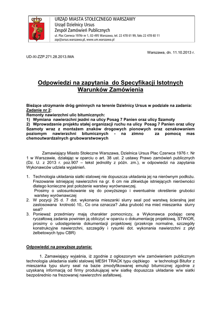 Warszawa, dn. 11.10.2013 r. UD-XI-ZZP.271.28.2013.IMA Odpowiedzi na zapytania do Specyfikacji Istotnych Warunków Zamówienia Bieżące utrzymanie dróg gminnych na terenie Dzielnicy Ursus w podziale na zadania: Zadanie nr 2: Remonty nawierzchni ulic bitumicznych: 1) Wymiana nawierzchni jezdni na ulicy Posag 7 Panien oraz ulicy Szamoty 2) Wprowadzenie projektu stałej organizacji ruchu na ulicy Posag 7 Panien oraz ulicy Szamoty wraz z montażem znaków drogowych pionowych oraz oznakowaniem poziomym nawierzchni bitumicznych - na zimno za pomocą mas chemoutwardzalnych grubowarstwowych Zamawiający Miasto Stołeczne Warszawa, Dzielnica Ursus Plac Czerwca 1976 r. Nr 1 w Warszawie, działając w oparciu o art. 38 ust. 2 ustawy Prawo zamówień publicznych (Dz. U. z 2013 r. poz.907 – tekst jednolity z późn. zm.), w odpowiedzi na zapytania Wykonawców udziela wyjaśnień. 1. Technologia układania siatki stalowej nie dopuszcza układania jej na nierównym podłożu. Frezowanie istniejącej nawierzchni na gr. 6 cm nie zlikwiduje istniejących nierówności dlatego konieczne jest położenie warstwy wyrównawczej. Prosimy o ustosunkowanie się do powyższego i ewentualnie określenie grubości warstwy wyrównawczej 2. W pozycji 25 d. 7 dot. wykonania mieszanki slurry seal pod warstwą ścieralną jest zastosowana krotność 10,. Co ona oznacza? Jaka grubość ma mieć mieszanka slurry seal? 3. Ponieważ przedmiary mają charakter pomocniczy, a Wykonawca podając cenę ryczałtową zadania powinien ją obliczyć w oparciu o dokumentację projektową, STWiOR, prosimy o udostępnienie dokumentacji projektowej (przekroje normalne, szczegóły konstrukcyjne nawierzchni, szczegóły i rysunki dot. wykonania nawierzchni z płyt żelbetowych typu CBR) Odpowiedzi na powyższe pytania: 1. Zamawiający wyjaśnia, iż zgodnie z ogłoszonym w/w zamówieniem publicznym technologia układania siatki stalowej MESH TRACK typu ciężkiego w technologii Bitufor z mieszanka typu slurry seal na bazie zmodyfikowanej emulsji bitumicznej zgodnie z uzyskaną informacją od firmy produkującej w/w siatkę dopuszcza układanie w/w siatki bezpośrednio na frezowanej nawierzchni asfaltowej. 2 Jednakże do frezowania uszkodzonych warstw asfaltowych należy stosować frezarki drogowe umożliwiające frezowanie na określoną głębokość. Frezarka powinna być sterowana elektronicznie i zapewniać zachowanie wymaganej równości oraz pochyleń poprzecznych i podłużnych nawierzchni po frezowaniu. Nawierzchnia po frezowaniu powinna być w swoim profilu podłużnym i poprzecznym równa bez jakichkolwiek zaniżeń. Zamawiający nie przewiduje położenia warstwy wyrównawczej z mieszanki mineralno asfaltowej – betonu asfaltowego celem wyrównania frezowanego podłoża. 2. Zamawiający wyjaśnia, iż zgodnie z ogłoszonym w/w zamówieniem publicznym i przekazanymi w STWiOR zapisami ruch postępowy maszyny umożliwia rozłożenie mieszanki mineralno-asfaltowa typu slurry seal warstwą o założonej grubości 0,7 ÷ 1 cm. Mieszanka slurry seal powinna być wytwarzana na miejscu jej wbudowania w specjalnej maszynie, spełniającej rolę wytwórni i układarki. 3. Zamawiający wyjaśnia, iż wykonanie nawierzchni przejazdu kolejowego z płyt żelbetowych typu CBR polega na wymianie istniejącej zniszczonej nawierzchni na dwóch przejazdach kolejowych zlokalizowanych w ulicy Posag 7 Panien Zamawiający nie posiada dokumentacji projektowej (przekrojów normalnych, szczegółów konstrukcyjnych itp.) Poniżej załączamy warunki STWiOR dotyczące wykonania nawierzchni z płyt żelbetowych typu CBR na przejeździe kolejowym 2.1. NAWIERZCHNIE NA PRZEJAZDACH KOLEJOWYCH 2.1.1. Wymagania ogólne remontu nawierzchni na przejazdach kolejowych na ulicy Posag 7 Panien w Dzielnicy Ursus Przejazdy kolejowe powinny być wykonywane zgodnie z warunkami technicznymi zawartymi w Rozporządzeniu Ministra Transportu i Gospodarki Morskiej z dnia 26 lutego 1996 r. Rodzaje nawierzchni na przejazdach Niniejsza ST dotyczy nawierzchni z prefabrykowanych płyt żelbetowych, wg BN77/8939-02 [6] i BN-77/8939-03 Przejazd kolejowy - skrzyżowanie linii kolejowej z drogą publiczną w jednym poziomie. Materiałami stosowanymi przy wykonywaniu przejazdów kolejowych objętych niniejszą ST są: prefabrykowane płyty żelbetowe typu CBP, kruszywo do podbudowy, klocki drewniane, masa zalewowa, ścieki korytkowe. Prefabrykowane płyty żelbetowe do budowy nawierzchni drogowej na przejazdach kolejowych powinny odpowiadać wymaganiom BN-77/8939-03 Rodzaje i odmiany płyt W zależności od przeznaczenia miejsca ułożenia płyt w nawierzchni przejazdu rozróżnia się: Pws - płyty wewnętrzne skrajne (między szynami), Pw - płyty wewnętrzne środkowe (między szynami), Pz - płyty zewnętrzne. Długości płyt zostały określone w projekcie budowlanym i wynoszą 300 cm. Szerokość płyt zależna jest od miejsca wbudowania na przejeździe (między szynami lub na zewnątrz szyn) i została określona w projekcie budowlanym. 3 Grubość płyt wynosi 14 cm. Ścieralność górnej warstwy płyty - wysokość startej warstwy na tarczy Boehmego nie powinna przekraczać 2,5 mm. Nasiąkliwość wagowa betonu w wykonanych płytach nie może przekraczać 6%. Dopuszczalne odchyłki dla kształtu wymiarów i wyglądu zewnętrznego płyt Kształt i wymiary płyt powinny być zgodne z dokumentacją projektową. Dopuszczalne odchyłki wymiarów nie powinny przekraczać: długości dla wszystkich rodzajów i typów ± 10 mm, szerokości płyt wewnętrznych, skrajnych i środkowych ± 3 mm, grubości ± 3 mm, usytuowania otworów pionowych ± 5 mm, wymiaru i usytuowania otworów poziomych ± 3 mm. Otwory pionowe przeznaczone do podnoszenia płyt należy uzbroić rurami o średnicy umożliwiającej założenie uchwytu dźwigu stosowanego do podnoszenia płyt. Otwory poziome przeznaczone do łączenia płyt układanych na przejazdach powinny być uzbrojone rurami stalowymi o śre