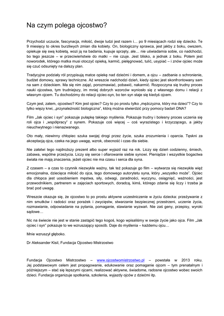 Na czym polega ojcostwo? Przychodzi uczucie, fascynacja, miłość, dwoje ludzi jest razem i… po 9 miesiącach rodzi się dziecko. Te 9 miesięcy to okres burzliwych zmian dla kobiety. On, biologiczny sprawca, jest jakby z boku, owszem, opiekuje się swą kobietą, wozi ją na badania, kupuje sprzęty, ale… nie uświadamia sobie, co nadchodzi, bo tego jeszcze – w przeciwieństwie do matki – nie czuje. Jest blisko, a jednak z boku. Potem jest noworodek, którego matka musi otoczyć opieką, karmić, pielęgnować, tulić, usypiać – i znów ojciec może się czuć odsunięty na dalszy plan. Tradycyjne podziały ról przypisują matce opiekę nad dziećmi i domem, a ojcu – zadbanie o schronienie, budżet domowy, sprawy techniczne. Aż wreszcie nadchodzi dzień, kiedy ojciec jest skonfrontowany sam na sam z dzieckiem. Ma się nim zająć, porozmawiać, pobawić, nakarmić. Rozpoczyna się trudny proces nauki ojcostwa, tym trudniejszy, im mniej dobrych wzorców wyniosło się z własnego domu i relacji z własnym ojcem. Tu dochodzimy do relacji ojciec-syn, bo ten syn staje się kiedyś ojcem. Czym jest, zatem, ojcostwo? Kim jest ojciec? Czy to po prostu tylko „mężczyzna, który ma dzieci”? Czy to tylko więzy krwi, „przynależność biologiczna”, którą można stwierdzić przy pomocy badań DNA? Film „Jak ojciec i syn” pokazuje pułapkę takiego myślenia. Pokazuje trudny i bolesny proces uczenia się roli ojca i „współpracy” z synem. Pokazuje coś więcej – coś wyrazistego i krzyczącego, a jakby nieuchwytnego i nienazwanego. Oto mały, niewinny chłopiec szuka swojej drogi przez życie, szuka zrozumienia i oparcia. Tęskni za akceptacją ojca, czeka na jego uwagę, wzrok, obecność i czas dla siebie. Nie załatwi tego najdroższy prezent albo super wyjazd raz na rok. Liczy się dzień codzienny, śmiech, zabawa, wspólne przeżycia. Liczy się serce i ofiarowanie siebie synowi. Pieniądze i wszystkie bogactwa świata nie mają znaczenia, jeżeli ojciec nie ma czasu i serca dla syna. Z czasem – a czas to czynnik niezwykle ważny, tak też pokazuje go film – wytwarza się niezwykła więź emocjonalna, dziecięca miłość do ojca, tego domowego autorytetu syna, który „wszystko może”. Ojciec dla chłopca jest uosobieniem męstwa, siły, odwagi, zaradności, wyczynu, osiągnięć, ważności, jest przewodnikiem, partnerem w zajęciach sportowych, doradcą, kimś, którego zdanie się liczy i trzeba je brać pod uwagę. Wreszcie okazuje się, że ojcostwo to po prostu aktywne uczestniczenie w życiu dziecka: przeżywanie z nim smutków i radości oraz porażek i zwycięstw, stwarzanie bezpiecznej przestrzeni, uczenie życia, rozmawianie, odpowiadanie na pytania, pomaganie, stawianie wyzwań. Nie zaś geny, przepisy, wyroki sądowe… Nic na świecie nie jest w stanie zastąpić tego kogoś, kogo wpisaliśmy w swoje życie jako ojca. Film „Jak ojciec i syn” pokazuje to we wzruszający sposób. Daje do myślenia – każdemu ojcu… Mnie wzruszył głęboko. Dr Aleksander Kisil, Fundacja Ojcostwo Mistrzostwo Fundacja Ojcostwo Mistrzostwo – www.ojcostwomistrzostwo.pl – powstała w 2013 roku. Jej podstawowym celem jest propagowanie, edukowanie oraz pomaganie ojcom – tym prenatalnym i późniejszym – stać się lepszymi ojcami, realizować aktywne, świadome, radosne ojcostwo wobec swoich dzieci. Fundacja organizuje spotkania, szkolenia, wyjazdy ojców z dziećmi itp.