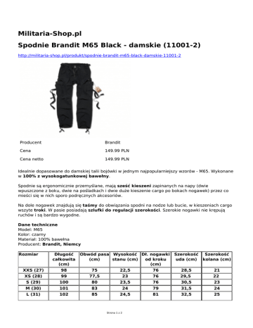 Militaria-Shop.pl Spodnie Brandit M65 Black - damskie (11001-2) http://militaria-shop.pl/produkt/spodnie-brandit-m65-black-damskie-11001-2 Producent Brandit Cena 149.99 PLN Cena netto 149.99 PLN Idealnie dopasowane do damskiej talii bojówki w jednym najpopularniejszy wzorów - M65. Wykonane w 100% z wysokogatunkowej bawełny. Spodnie są ergonomicznie przemyślane, mają sześć kieszeni zapinanych na napy (dwie wpuszczone z boku, dwie na pośladkach i dwie duże kieszenie cargo po bokach nogawek) przez co mieści się w nich sporo podręcznych akcesoriów. Na dole nogawek znajdują się taśmy do obwiązania spodni na nodze lub bucie, w kieszeniach cargo wszyte troki. W pasie posiadają szlufki do regulacji szerokości. Szerokie nogawki nie krępują ruchów i są bardzo wygodne. Dane techniczne Model: M65 Kolor: czarny Materiał: 100% bawełna Producent: Brandit, Niemcy Rozmiar Długość całkowita (cm) Obwód pasa Wysokość Dł. nogawki (cm) stanu (cm) od kroku (cm) Szerokość uda (cm) Szerokość kolana (cm) XXS (27) 98 75 22,5 76 28,5 21 XS (28) 99 77,5 23 76 29,5 22 S (29) 100 80 23,5 76 30,5 23 M (30) 101 83 24 79 31,5 24 L (31) 102 85 24,5 81 32,5 25 Strona 1 z 2 XL (32) 103 87 25 81 33,5 26 Dane techniczne Rodzaj kroju Militarny Kolor / kamuflaż Czarny Nazwa odcienia / kamuflażu Black Materiał Naturalny Skład materiału 100% bawełna Faktura materiału Twill (gładki) Elastyczność Nierozciągliwy Wodoodporność Standardowy Ilość kieszeni 6 Zapięcie kieszeni 6x napy (zatrzaski) Zapięcie rozporka Zamek Szlufki na pasek Tak Uwagi Regulacja obwodu w pasie. Taśmy do obwiązania spodni na nodze lub bucie. Strona 2 z 2