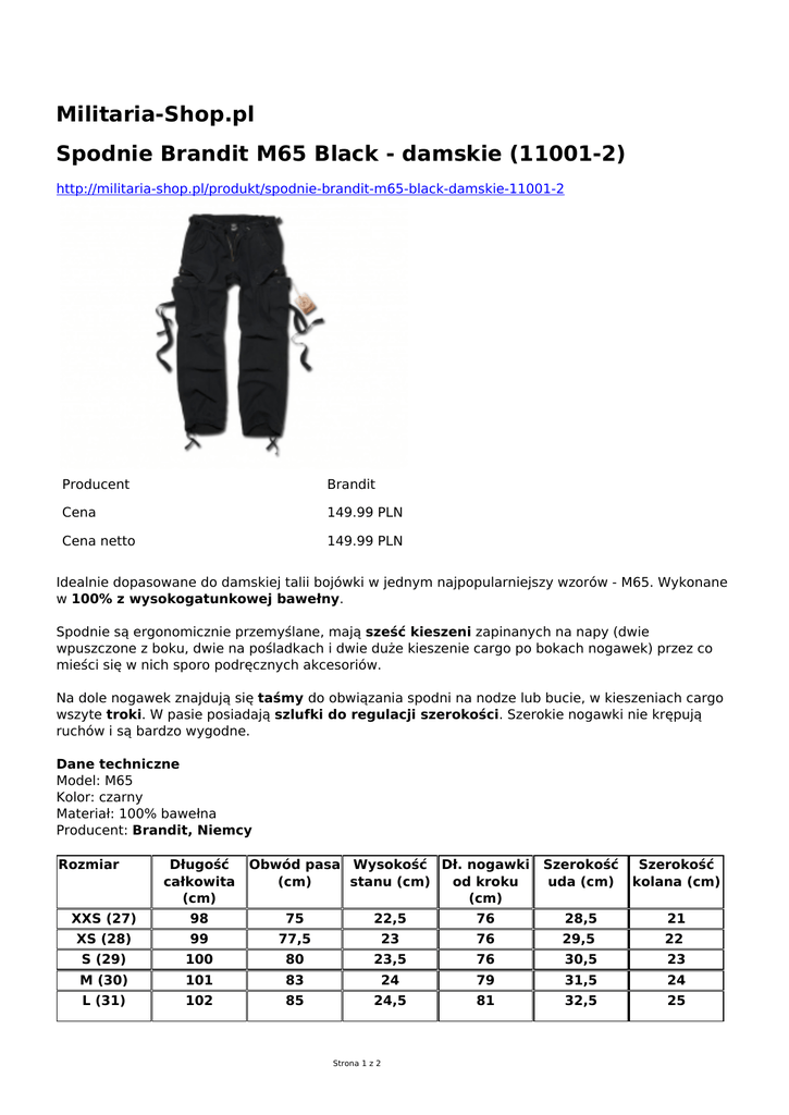 Militaria-Shop.pl Spodnie Brandit M65 Black - damskie (11001-2)