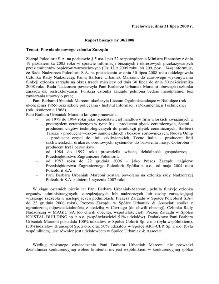 Piechowice, dnia 31 lipca 2008 r. Raport bieŜący nr 30/2008 Temat: Powołanie nowego członka Zarządu Zarząd Polcolorit S.A. na podstawie § 5 ust.1 pkt 22 rozporządzenia Ministra Finansów z dnia 19 października 2005 roku w sprawie informacji bieŜących i okresowych przekazywanych przez emitentów papierów wartościowych (Dz. U. z 2005 roku, Nr 209, poz. 1744) informuje, Ŝe Rada Nadzorcza Polcolorit S.A. na posiedzeniu w dniu 30 lipca 2008 roku oddelegowała Członka Rady Nadzorczej, Panią Barbarę Urbaniak Marconi, do czasowego wykonywania funkcji członka zarządu na okres trzech miesięcy od dnia 30 lipca do dnia 30 października 2008 roku. Rada Nadzorcza powierzyła Pani Barbarze Urbaniak Marconi obowiązki członka zarządu ds. restrukturyzacji. Funkcja członka zarządu pełniona będzie nieodpłatnie, bez zawierania umowy o pracę. Pani Barbara Urbaniak-Marconi ukończyła Liceum Ogólnokształcące w Białołęce (rok ukończenia 1965) oraz szkołę policealną - Instytut Informacji i Dokumentacji Technicznej (rok ukończenia 1968). Pani Barbara Urbaniak-Marconi kolejno pracowała: – od 1979 do 1994 roku jako przedstawiciel handlowy firm włoskich związanych z przemysłem ceramicznym w tym: Iris – producent płytek ceramicznych, Sacmi – producent ciągów technologicznych do produkcji płytek ceramicznych, Barbieri Tarozzi - producent wózków samojezdnych i boksów sortowniczych, Nuova Omip – producent części do linii szkliwierskich, Tecno Italia – producent linii szkliwierskich, drukarek obrotowych, systemów do barwienia masy, Colorobia – producent fryt i barwników, – od 1984 do 1997 roku prowadziła własną działalność gospodarczą – Przedsiębiorstwo Zagraniczne Polcolorit, – od 1987 roku do 22 grudnia 2006 – jako Prezes Zarządu najpierw Przedsiębiorstwa Zagranicznego Polcolorit Spółka z o.o., od maja 2004 roku Polcolorit S.A. – Pani Barbara Urbaniak Marconi została powołana na członka rady Nadzorczej Polcolorit S.A. z dniem 1 stycznia 2007 roku. W ciągu ostatnich pięciu lat Pani Barbara Urbaniak-Marconi, pełniła funkcje członka organów administracyjnych, zarządzających lub nadzorczych lub osoby zarządzającej wyŜszego szczebla w następujących podmiotach: Prezesa Zarządu w Spółce Polcolorit S.A.( do 22 grudnia 2006 roku), Prezesa Zarządu w Spółce Urbaniak & Associati spółka z ograniczoną odpowiedzialnością z siedzibą w Cavriago (do chwili obecnej), Członka Rady Nadzorczej w MAGIC SA (do chwili obecnej, współwłaściciel), Prezes Zarządu w Spółce KRISTAL BUILDING sp. z o.o. (współwłaściciel 51% udziałów). Dodatkowo Pani Barbara Urbaniak-Marconi posiadała 100% udziałów w Spółce Colorit Sp. z o.o (była wspólnikiem), (30%)udziałów Brancopol Sp. z o.o. oraz 50% udziałów w Spółce ART-CER Sp. z o.o. (była wspólnikiem), jest równieŜ jest udziałowcem w Spółce Urbaniak & Associat. Według złoŜonego oświadczenia Pani Barbara Urbaniak Marconi nie prowadzi działalności konkurencyjnej wobec Emitenta, nie jest wspólnikiem w konkurencyjnej spółce cywilnej lub osobowej, ani nie jest członkiem organu konkurencyjnej spółki kapitałowej, ani jakiejkolwiek innej konkurencyjnej osoby prawnej. Według złoŜonego oświadczenia Pani Barbara Urbaniak Marconi nie jest wpisana do Rejestru DłuŜników Niewypłacalnych, prowadzonego na podstawie Ustawy o KRS. Podstawa prawna – art. 56 ust.1 pkt 2 ustawy o ofercie – informacje bieŜące i okresowe