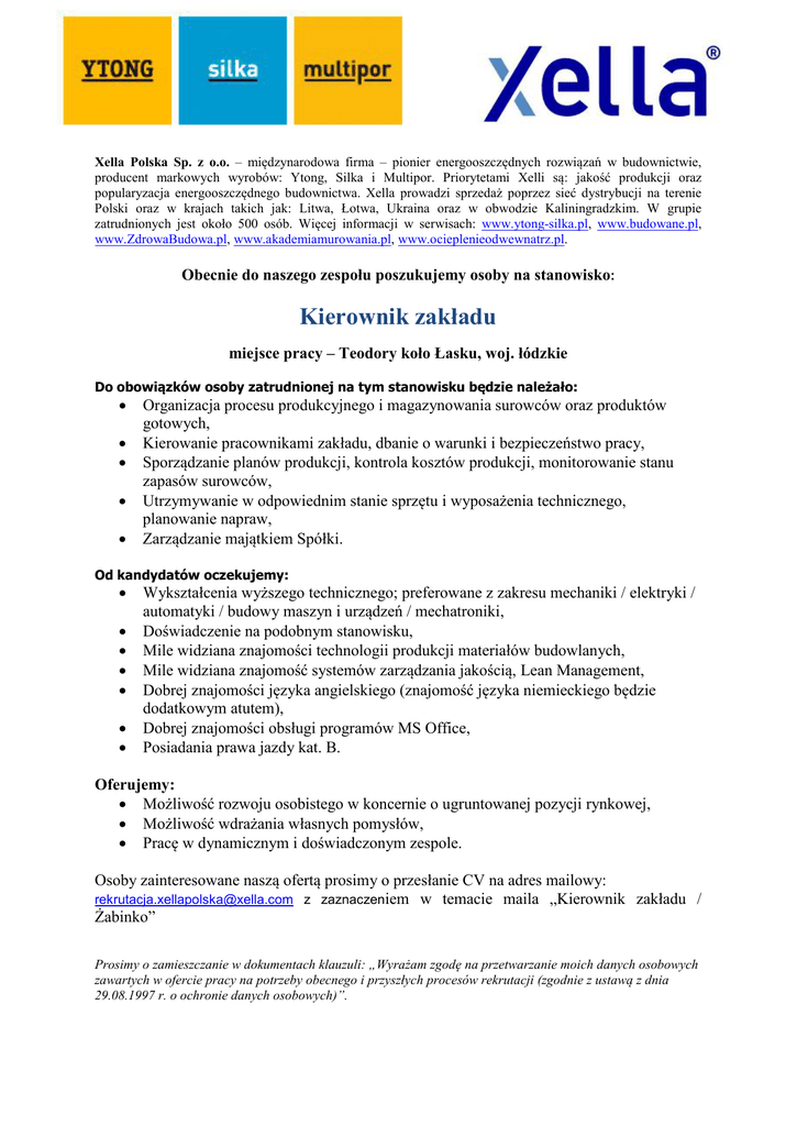 Xella Polska Sp. z o.o. – międzynarodowa firma – pionier energooszczędnych rozwiązań w budownictwie, producent markowych wyrobów: Ytong, Silka i Multipor. Priorytetami Xelli są: jakość produkcji oraz popularyzacja energooszczędnego budownictwa. Xella prowadzi sprzedaż poprzez sieć dystrybucji na terenie Polski oraz w krajach takich jak: Litwa, Łotwa, Ukraina oraz w obwodzie Kaliningradzkim. W grupie zatrudnionych jest około 500 osób. Więcej informacji w serwisach: www.ytong-silka.pl, www.budowane.pl, www.ZdrowaBudowa.pl, www.akademiamurowania.pl, www.ocieplenieodwewnatrz.pl. Obecnie do naszego zespołu poszukujemy osoby na stanowisko: Kierownik zakładu miejsce pracy – Teodory koło Łasku, woj. łódzkie Do obowiązków osoby zatrudnionej na tym stanowisku będzie należało: • • • • • Organizacja procesu produkcyjnego i magazynowania surowców oraz produktów gotowych, Kierowanie pracownikami zakładu, dbanie o warunki i bezpieczeństwo pracy, Sporządzanie planów produkcji, kontrola kosztów produkcji, monitorowanie stanu zapasów surowców, Utrzymywanie w odpowiednim stanie sprzętu i wyposażenia technicznego, planowanie napraw, Zarządzanie majątkiem Spółki. Od kandydatów oczekujemy: • • • • • • • Wykształcenia wyższego technicznego; preferowane z zakresu mechaniki / elektryki / automatyki / budowy maszyn i urządzeń / mechatroniki, Doświadczenie na podobnym stanowisku, Mile widziana znajomości technologii produkcji materiałów budowlanych, Mile widziana znajomość systemów zarządzania jakością, Lean Management, Dobrej znajomości języka angielskiego (znajomość języka niemieckiego będzie dodatkowym atutem), Dobrej znajomości obsługi programów MS Office, Posiadania prawa jazdy kat. B. Oferujemy: • Możliwość rozwoju osobistego w koncernie o ugruntowanej pozycji rynkowej, • Możliwość wdrażania własnych pomysłów, • Pracę w dynamicznym i doświadczonym zespole. Osoby zainteresowane naszą ofertą prosimy o przesłanie CV na adres mailowy: w temacie maila „Kierownik zakładu / Żabinko” [email protected] z zaznaczeniem Prosimy o zamieszczanie w dokumentach klauzuli: „Wyrażam zgodę na przetwarzanie moich danych osobowych zawartych w ofercie pracy na potrzeby obecnego i przyszłych procesów rekrutacji (zgodnie z ustawą z dnia 29.08.1997 r. o ochronie danych osobowych)”.