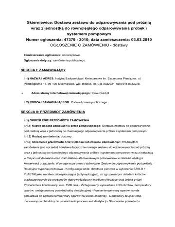 Skierniewice: Dostawa zestawu do odparowywania pod próżnią wraz z jednostką do równoległego odparowywania próbek i systemem pompowym Numer ogłoszenia: 47379 - 2010; data zamieszczenia: 03.03.2010 OGŁOSZENIE O ZAMÓWIENIU - dostawy Zamieszczanie ogłoszenia: obowiązkowe. Ogłoszenie dotyczy: zamówienia publicznego. SEKCJA I: ZAMAWIAJĄCY I. 1) NAZWA I ADRES: Instytut Sadownictwa i Kwiaciarstwa im. Szczepana Pieniążka , ul. Pomologiczna 18, 96-100 Skierniewice, woj. łódzkie, tel. 046 8332021, faks 046 8333228. Adres strony internetowej zamawiającego: www.insad.pl I. 2) RODZAJ ZAMAWIAJĄCEGO: Podmiot prawa publicznego. SEKCJA II: PRZEDMIOT ZAMÓWIENIA II.1) OKREŚLENIE PRZEDMIOTU ZAMÓWIENIA II.1.1) Nazwa nadana zamówieniu przez zamawiającego: Dostawa zestawu do odparowywania pod próżnią wraz z jednostką do równoległego odparowywania próbek i systemem pompowym. II.1.2) Rodzaj zamówienia: dostawy. II.1.3) Określenie przedmiotu oraz wielkości lub zakresu zamówienia: Przedmiotem zamówienia jest: sprzedaż i dostawa fabrycznie nowego zestawu do odparowywania pod próżnią wraz z jednostką do równoległego odparowywania próbek i systemem pompowym wraz z instalacją w miejscu użytkowania oraz instruktażem stanowiskowym pracowników w zakresie obsługi i konserwacji urządzenia. Wymagane parametry techniczne: Zestaw do odparowywania pod próżnią. Rotacyjna wyparka próżniowa - Konfiguracja szkła: chłodnica pionowa w wykonaniu SZKŁO + PLASTIK jako warstwa zabezpieczająca (antyimplozyjna), ze zgrupowanym układem króćców przyłączeniowych dla przewodów doprowadzających medium chłodzące oraz źródła próżni Powierzchnia kondensacji: min. 1500 cm2 - Zintegrowany wyświetlacz LCD obrotów i temperatury oparów, umiejscowiony powyżej kolby destylacyjnej - Pomiar temperatury oparów: sonda pomiarowa do pomiaru temperatury oparów na wlocie chłodnicy - Dodatkowy czujnik temp. mocowany na chłodnicy do prowadzenia procesu autodestylacji - Sterowanie: pokrętło do ustawiania szybkości obrotowej na słupku powyżej kolby destylacyjnej w celu ergonomicznej obsługi wyparki (brak możliwości przypadkowego zachlapania) - Prędkość obrotowa: płynna regulacja w zakresie nie mniejszym niż 20 - 280 min-1 - Porty komunikacyjne: 2x RS-485 Mocowanie kolby destylacyjnej: system Combi-clip do szybkiego mocowania i zdejmowania kolby destylacyjnej - Napęd: cichobieżny napęd obrotowy kolby destylacyjnej, sterowany elektronicznie Podnoszenie kolby: elektryczne. Automatyczne podniesienie kolby destylacyjnej w przypadku zaniku zasilania - Rozmiar kolb destylacyjnych: 50 - 4000 ml - W zestawie kolba destylacyjna oraz odbieralnik o pojemności 1 litra każda - Butelka Woulffa - Zasilanie: 230 V/50 Hz - Zużycie mocy: poniżej 1400 W z łaźnią - Masa: nie więcej niż 18 kg - IP klasa: 21 - Deklaracja zgodności CE Wymagana możliwość mechanicznego zintegrowania i współpracy wyparki z systemem do równoległego odparowania próbek. Łaźnia wodno-olejowa: - Pojemność misy: 4 litry - Maksymalny rozmiar kolby: 4 litry - Zakres temperatury: 20 - 180 st C - Odchylenie temperaturowe: ± 2 st C Wyświetlacz: zintegrowany wyświetlacz graficzny LCD umożliwiający równoczesny odczyt temperatury zadanej i aktualnej w łaźni - Wykonanie misy łaźni ze stali nierdzewnej - Łaźnia z możliwością odłączania od bazy (system bezprzewodowy) - Małe gabaryty: wysokość: 240 mm szerokość: 285 mm głębokość: 300 mm - Zasilanie: 220 - 240 V/50 Hz - Zużycie mocy: 1300 W - IP klasa: 21 - Deklaracja zgodności CE. Zestaw do jednoczesnego odparowywania próbek wraz z próżniowym systemem pompowym - Blok z funkcją grzania i mieszania do równoległego odparowania próbek pod próżnią. Minimum 6-ścio pozycyjny (karuzela), zapewniający odparowanie w tym samym czasie min. 6 próbek o maksymalnej objętości wyjściowej nie mniejszej niż 160 ml Zakres temperaturowy: temperatura programowalna cyfrowo w zakresie od temperatury otoczenia do +95 st.C z rozdzielczością co 1 st. C - Odchylenie temperatury: max. ±3 st.C - Ciśnienie programowalne cyfrowo przy użyciu kontrolera, wchodzącego w skład próżniowego systemu pompowego. Konieczność pracy z gradientem ciśnienia. - Ilość miejsc na szklane pojemniki: min. 6 - Objętość szklanych pojemników: 60, 220 ml - Możliwość stosowania innych szklanych pojemników o średnicy zewn. 16-60 mm i długości 110-150 mm - Prędkość obrotowa: regulowana pokrętłem , zakres 0-370 obr/min, ruch orbitalny - Wbudowany wyświetlacz LCD pokazujący wartość temperatury zadanej i aktualnej - System uszczelnienia: pokrywa uszczelniająca równocześnie min. 6 pojemników; rozwiązanie zapobiegające kontaminacji krzyżowej - Cały proces odparowania musi być w pełni automatycznie programowany i nadzorowany z poziomu kontrolera próżni, bez konieczności pracy z zewnętrznym komputerem - Butelka Woulffa - Min. 6-cio pozycyjny stojak na naczynia do przygotowania próbek - Kompletny zestaw szklanych naczyń okrągłodennych 60 ml i 220 ml z nakrętkami i septami - Zestaw kompletnych adapterów z uszczelkami do w/w zestawów naczyń 60 ml i 220 ml - Osłona karuzeli z próbkami wykonana z poliwęglanu - Rodzaj materiału mającego kontakt z próbką: PETP ( lub PEEK), PTFE, PFA, szkło - Chłodnica wodna, szklana w układzie pionowym wraz z odbieralnikiem (oba elementy z pokryciem antyimplozyjnym) o poj. min. 1 L + statyw z elementami mocującymi - Zasilanie: 220-240V/ 50-60 Hz - Maksymalny pobór mocy: 800W - Maksymalne wymiary: 270 x 400 x 400 mm (szer x wys x głęb) - Masa: nie więcej niż 23 kg - Klasa ochrony IP 21 - Certyfikat CE. Uwaga: Aparat musi być kompatybilny z wyparką obrotową oraz systemem próżniowym. Należy uwzględnić niezbędne elementy połączeniowe. Membranowa pompa próżniowa, chemoodporna - Próżnia końcowa nie gorsza niż 10 mbar - Wydajność nie mniejsza niż 1.8 m3/h - Możliwoś