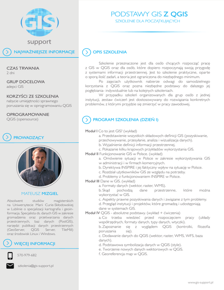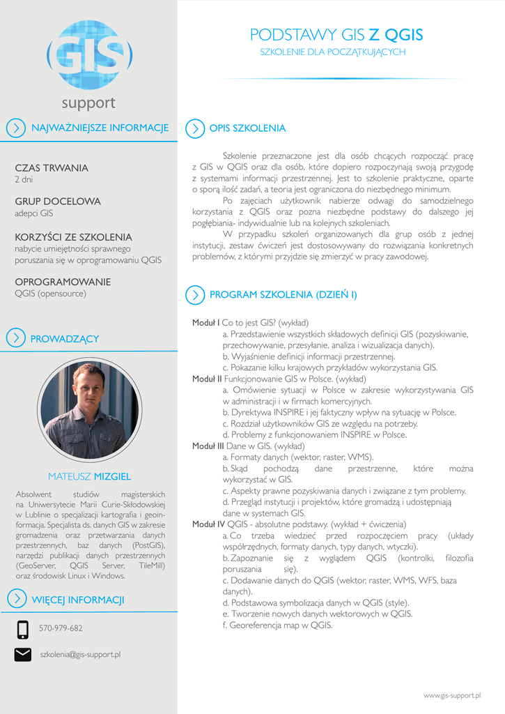 PODSTAWY GIS Z QGIS SZKOLENIE DLA POCZĄTKUJĄCYCH NAJWAŻNIEJSZE INFORMACJE CZAS TRWANIA 2 dni GRUP DOCELOWA adepci GIS KORZYŚCI ZE SZKOLENIA nabycie umiejętności sprawnego poruszania się w oprogramowaniu QGIS OPIS SZKOLENIA Szkolenie przeznaczone jest dla osób chcących rozpocząć pracę z GIS w QGIS oraz dla osób, które dopiero rozpoczynają swoją przygodę z systemami informacji przestrzennej. Jest to szkolenie praktyczne, oparte o sporą ilość zadań, a teoria jest ograniczona do niezbędnego minimum. Po zajęciach użytkownik nabierze odwagi do samodzielnego korzystania z QGIS oraz pozna niezbędne podstawy do dalszego jej pogłębiania- indywidualnie lub na kolejnych szkoleniach. W przypadku szkoleń organizowanych dla grup osób z jednej instytucji, zestaw ćwiczeń jest dostosowywany do rozwiązania konkretnych problemów, z którymi przyjdzie się zmierzyć w pracy zawodowej. OPROGRAMOWANIE QGIS (opensource) PROWADZĄCY MATEUSZ MIZGIEL Absolwent studiów magisterskich na Uniwersytecie Marii Curie-Skłodowskiej w Lublinie o specjalizacji kartografia i geoinformacja. Specjalista ds. danych GIS w zakresie gromadzenia oraz przetwarzania danych przestrzennych, baz danych (PostGIS), narzędzi publikacji danych przestrzennych (GeoServer, QGIS Server, TileMill) oraz środowisk Linux i Windows. WIĘCEJ INFORMACJI 570-979-682 PROGRAM SZKOLENIA (DZIEŃ I) Moduł I Co to jest GIS? (wykład) a. Przedstawienie wszystkich składowych definicji GIS (pozyskiwanie, przechowywanie, przesyłanie, analiza i wizualizacja danych). b. Wyjaśnienie definicji informacji przestrzennej. c. Pokazanie kilku krajowych przykładów wykorzystania GIS. Moduł II Funkcjonowanie GIS w Polsce. (wykład) a. Omówienie sytuacji w Polsce w zakresie wykorzystywania GIS w administracji i w firmach komercyjnych. b. Dyrektywa INSPIRE i jej faktyczny wpływ na sytuację w Polsce. c. Rozdział użytkowników GIS ze względu na potrzeby. d. Problemy z funkcjonowaniem INSPIRE w Polsce. Moduł III Dane w GIS. (wykład) a. Formaty danych (wektor, raster, WMS). b..Skąd pochodzą dane przestrzenne, które można wykorzystać w GIS. c. Aspekty prawne pozyskiwania danych i związane z tym problemy. d. Przegląd instytucji i projektów, które gromadzą i udostępniają dane w systemach GIS. Moduł IV QGIS - absolutne podstawy. (wykład + ćwiczenia) a..Co trzeba wiedzieć przed rozpoczęciem pracy (układy współrzędnych, formaty danych, typy danych, wtyczki). b..Zapoznanie się z wyglądem QGIS (kontrolki, filozofia poruszania się). c. Dodawanie danych do QGIS (wektor, raster, WMS, WFS, baza danych). d. Podstawowa symbolizacja danych w QGIS (style). e. Tworzenie nowych danych wektorowych w QGIS. f. Georeferencja map w QGIS. [email protected] www.gis-support.pl PODSTAWY GIS Z QGIS SZKOLENIE DLA POCZĄTKUJĄCYCH PROGRAM SZKOLENIA (DZIEŃ II) Moduł V QGIS dla średnio zaawansowanych. (wykład + ćwiczenia) a. Podstawowe problemy w pracy z QGIS. b. Praca z tabelą atrybutów (kreatory zapytań, kalkulator pól). c. Symbolizacja - poziom zaawansowany. d. Przygotowywanie kompozycji kartograficznych. Moduł VI Analizy przestrzenne w QGIS. (wykład + dużo ćwiczeń) a. Podstawowe analizy (bufor, przecięcie, agregacja). b. Analizy na tabeli atrybutów. c. Przegląd przydatnych wtyczek QGIS. www.gis-support.pl