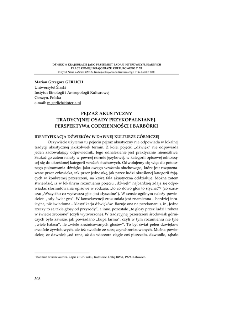 DŹWIĘK W KRAJOBRAZIE JAKO PRZEDMIOT BADAŃ INTERDYSCYPLINARNYCH PRACE KOMISJI KRAJOBRAZU KULTUROWEGO T. XI Instytut Nauk o Ziemi UMCS, Komisja Krajobrazu Kulturowego PTG, Lublin 2008 Marian Grzegorz GERLICH Uniwersytet Śląski Instytut Etnologii i Antropologii Kulturowej Cieszyn, Polska e-mail: [email protected] PEJZAŻ AKUSTYCZNY TRADYCYJNEJ OSADY PRZYKOPALNIANEJ. PERSPEKTYWA CODZIENNOŚCI I BARBÓRKI IDENTYFIKACJA DŹWIĘKÓW W DAWNEJ KULTURZE GÓRNICZEJ Oczywiście użytemu tu pojęciu pejzaż akustyczny nie odpowiada w lokalnej tradycji akustycznej jakikolwiek termin. Z kolei pojęciu „dźwięk” nie odpowiada jeden zadowalający odpowiednik. Jego odnalezienie jest praktycznie niemożliwe. Szukać go zatem należy w pewnej normie językowej, w kategorii opisowej odnoszącej się do określonej kategorii wrażeń słuchowych. Odwołujemy się więc do potocznego pojmowania dźwięku jako owego wrażenia słuchowego, które jest rozpoznawane przez człowieka, tak przez jednostkę, jak przez ludzi określonej kategorii żyjących w konkretnej przestrzeni, na którą fala akustyczna oddziałuje. Można zatem stwierdzić, iż w lokalnym rozumieniu pojęciu „dźwięk” najbardziej zdają się odpowiadać sformułowania opisowe w rodzaju: „to co dowo głos to słychać”1 (co oznacza: „Wszystko co wytwarza głos jest słyszalne”). W sensie ogólnym należy powiedzieć: „cały świat gro”. W konsekwencji zrozumiała jest znamienna – bardziej intuicyjna, niż świadoma – klasyfikacja dźwięków. Bazuje ona na przekonaniu, iż „Jedne rzeczy to są takie głosy od przyrody”, a inne, pozostałe „to głosy przez ludzi i robota w świecie zrobione” (czyli wytworzone). W tradycyjnej przestrzeni środowisk górniczych było zawsze, jak powiadano „kupa larma”, czyli w tym rozumieniu nie tyle „wiele hałasu”, ile „wiele zróżnicowanych głosów”. To był świat pełen dźwięków swoiście żywiołowych, ale też swoiście ze sobą zsynchronizowanych. Można powiedzieć, że dawniej: „od rana, aż do wieczora ciągle coś piszczało, dzwoniło, rąbało 1 Badania własne autora. Zapis z 1979 roku, Katowice. Dalej BWA, 1979, Katowice. 308 (…) tłukło (…), szum był wielki, do tego te syreny, do tego trzaskało, waliło (…), ludzie godali, inni śpiewali”1. CODZIENNOŚĆ I ŚWIĘTO Próba prezentacji interesującego nas zagadnienia dokonana będzie w dwóch odrębnych perspektywach czasowych, czyli powszedniości i górniczego święta, to jest Barbórki obchodzonej 4 grudnia. Społeczną bazą analizy są dawne, tradycyjne, wyraźnie homogeniczne pod wieloma względami osady i osiedla przykopalniane2. Pierwsza perspektywa czasowa to szeroko pojęta codzienność znamienna dla dawnej kultury górniczej. Jest analizowana w kontekście zwyczajowego sposobu jej pojmowania. W tym „ludowym” sposobie rozumienia pojęcia „zwykły dzień”3 zawiera się również jednoznaczne określanie ram czasowych banalnej powszedniości, pojmowanej od poranka do wieczora. Zarazem w pamięci zbiorowej zawarty jest szczególny jej obraz wskazujący, iż codzienność, choć przynależy do profanum jest uzależniona od sacrum. Druga perspektywa – analityczna – dotyczy odmiennej jakościowo sfery to znaczy święta św. Barbary – patronki górniczego stanu, czyli sfery jednoznacznie związanej z sacrum. W tym przypadku ujawnia się również bogata otoczka kulturowa (Gerlich, 2003), dawne obrzędy i zwyczaje zawodowe, folklor, ale też znormalizowane kulturowo zachowania ludyczne. Tradycyjna Barbórka składała się z dwóch części – z typowymi dla niej dźwiękami – to jest oficjalnej (mającej chronologicznie charakter świecki, religijny i ponownie świecki) oraz zabawowej. DŹWIĘKI I DZIEŃ POWSZEDNI GÓRNICZEJ OSADY Koniecznym jest zwrócenie uwagi, że tradycyjny dzień powszedni był przez środowiska górnicze jednoznacznie dzielony na kolejno po sobie następujące etapy. Można w efekcie mówić o swoistych – utrzymanych w konwencji myślenia typu ludowego i związanej z nim kategorii oczywistości – scenariuszach codzienności (Gerlich, 1989). W bezpośrednim związku z nimi pozostawały dźwięki. Odtwórzmy scenariusz górniczego dnia, aby w tej perspektywie „usłyszeć” dźwięki, które musiały wystąpić codziennie. Jakiekolwiek zachwiania tak pojmowanej i realizowanej behavioralnie struktury nie mogły wynikać z postaw dewiacyjnych, zagrażało to bowiem niewyobrażalnymi konsekwencjami. Tradycyjnemu scenariuszowi towarzyBWA, 1977, Ruda Śląska. Zob. Perlick A., 1939: Volkskunde des oberslesischen Industriegebietes. Sonderabdruck aus der Monatschriit, “Der Oberschlesier”, s. 9. 3 Zob. np. Gerlich M.G., 1992: The mining Culture and its Social Functions in Upper Silesia since the Midle of the 19th Century [w:] Sozialgeschichte des Bergbaus im 19. und 20.Jahrhundert (hrsg.): K.Tenfelde. München Beck, s.122-133. 1 2 309 szyły dźwięki, które także swoiście periodyzowały dzień. W sensie ogólnym scenariusz dnia górniczego to konkretne etapy. Wedle tego rozumienia to: 1. „początek dnia”, czyli poranek, a zatem wspólne przebywanie całej rodziny, a następnie – wyjście mężczyzny do pracy; 2. droga górnika z domu do kopalni, szychta i powrót do domu. W perspektywie domowej są to zachowania realizowane przez żonę i matkę w czasie pobytu męża w pracy; także zachowania pozostałych członków rodziny; 3. wspólny posiłek (obiad); 4. na ogół odrębne spędzanie czasu „łod łobiadu do wieczerzy”, odzwierciedlające odmienne role i pozycje członków górniczej familii. W tej perspektywie dźwięki – naznaczone kulturowo – są ustawicznie obecne. I tak o poranku, kiedy górnik przygotowywał się do wyjścia do pracy pojawiały się bezpośrednio w jego mieszkaniu, a po drugie pochodziły z zewnątrz, z innych mieszkań, tzw. familoka czyli kamienicy, albo bezpośrednio z kopalni. I był też