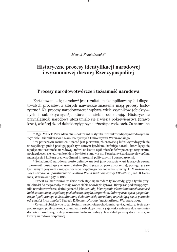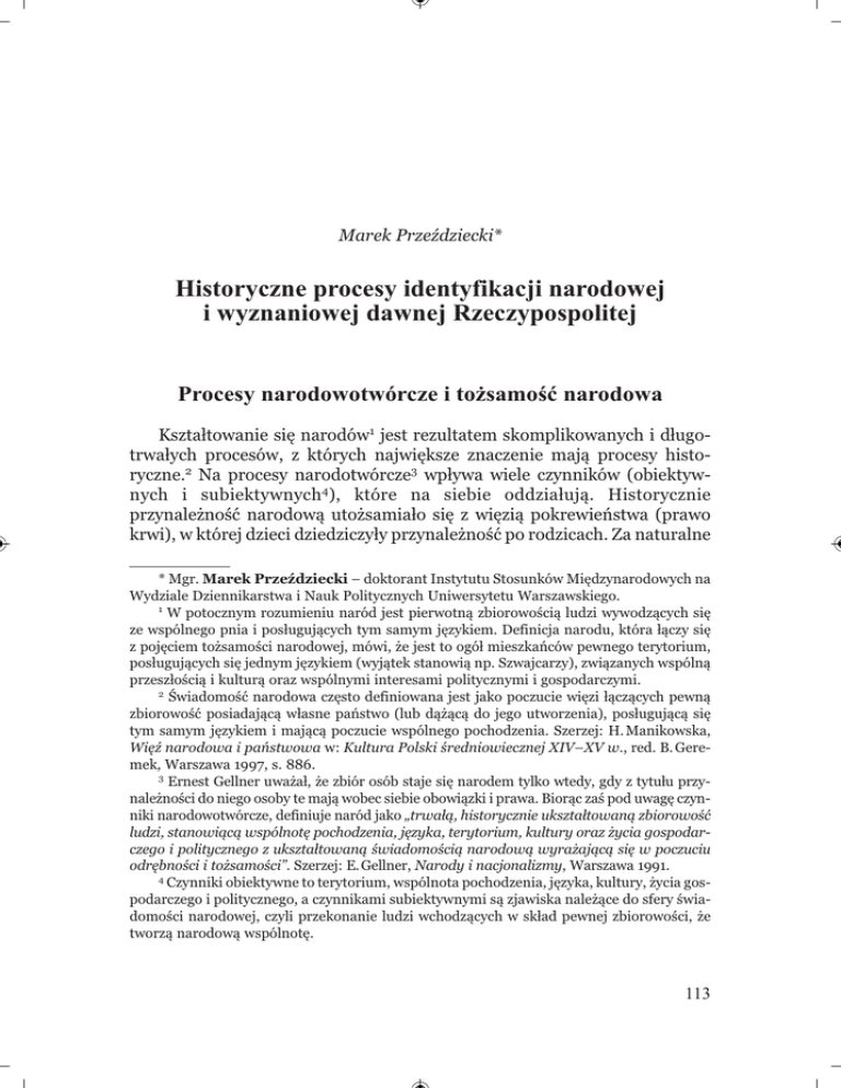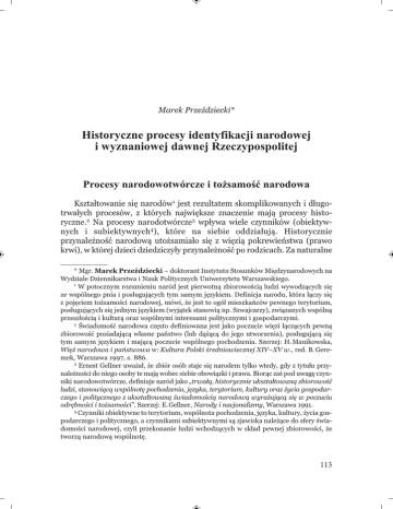 Marek Przeździecki* Historyczne procesy identyfikacji narodowej i wyznaniowej dawnej Rzeczypospolitej Procesy narodowotwórcze i tożsamość narodowa Kształtowanie się narodów1 jest rezultatem skomplikowanych i długotrwałych procesów, z których największe znaczenie mają procesy historyczne.2 Na procesy narodotwórcze3 wpływa wiele czynników (obiektywnych i subiektywnych4), które na siebie oddziałują. Historycznie przynależność narodową utożsamiało się z więzią pokrewieństwa (prawo krwi), w której dzieci dziedziczyły przynależność po rodzicach. Za naturalne * Mgr. Marek Przeździecki – doktorant Instytutu Stosunków Międzynarodowych na Wydziale Dziennikarstwa i Nauk Politycznych Uniwersytetu Warszawskiego. 1 W potocznym rozumieniu naród jest pierwotną zbiorowością ludzi wywodzących się ze wspólnego pnia i posługujących tym samym językiem. Definicja narodu, która łączy się z pojęciem tożsamości narodowej, mówi, że jest to ogół mieszkańców pewnego terytorium, posługujących się jednym językiem (wyjątek stanowią np. Szwajcarzy), związanych wspólną przeszłością i kulturą oraz wspólnymi interesami politycznymi i gospodarczymi. 2 Świadomość narodowa często definiowana jest jako poczucie więzi łączących pewną zbiorowość posiadającą własne państwo (lub dążącą do jego utworzenia), posługującą się tym samym językiem i mającą poczucie wspólnego pochodzenia. Szerzej: H. Manikowska, Więź narodowa i państwowa w: Kultura Polski średniowiecznej XIV–XV w., red. B. Geremek, Warszawa 1997, s. 886. 3 Ernest Gellner uważał, że zbiór osób staje się narodem tylko wtedy, gdy z tytułu przynależności do niego osoby te mają wobec siebie obowiązki i prawa. Biorąc zaś pod uwagę czynniki narodowotwórcze, definiuje naród jako „trwałą, historycznie ukształtowaną zbiorowość ludzi, stanowiącą wspólnotę pochodzenia, języka, terytorium, kultury oraz życia gospodarczego i politycznego z ukształtowaną świadomością narodową wyrażającą się w poczuciu odrębności i tożsamości”. Szerzej: E. Gellner, Narody i nacjonalizmy, Warszawa 1991. 4 Czynniki obiektywne to terytorium, wspólnota pochodzenia, języka, kultury, życia gospodarczego i politycznego, a czynnikami subiektywnymi są zjawiska należące do sfery świadomości narodowej, czyli przekonanie ludzi wchodzących w skład pewnej zbiorowości, że tworzą narodową wspólnotę. 113 Studia Europejskie, 2/2012 kryteria tworzenia się narodu przyjmowano kryterium pochodzenia, językowe i terytorialne. Ważnym czynnikiem narodowotwórczym jest wspólnota kultury i obyczajów, a wspólne dziedzictwo kulturowe ma istotne znaczenie dla integracji narodów na płaszczyźnie uznawanych wartości kulturowych oraz daje grupom etnicznym poczucie jedności. Etniczna definicja narodu zalicza do wspólnoty kulturowej tradycje, obyczaje, kulturę ludową i wierzenia religijne. Wspólnotę kulturową narodu tworzą ponadto reprezentacyjne elementy twórczości (sztuka, architektura, literatura, muzyka) składające się na dziedzictwo kulturowe. Możemy też wyróżnić ekonomiczne koncepcje kształtowania się narodu. Do czynników narodowotwórczych zaliczamy ponadto czynnik ideologiczny (zyskujący na znaczeniu).5 Procesy narodowotwórcze poprzedzone są na ogół kształtowaniem się tożsamości narodowej.6 Gdy Ernest Gellner mówi o potrzebie wzajemnego uznania się za rodaków,7 wiąże to z procesem przechodzenia grup etnicznych od identyfikacji z obszarem „małej ojczyzny” do identyfikacji z obszarem „wielkiej wspólnoty”. Pojęcie tożsamości ma charakter złożony i wiąże się z pojęciem procesów identyfikacyjnych. W odniesieniu do człowieka jest to świadomość siebie, swoich cech i własnej odrębności8, a w odniesieniu do społeczności – świadomość wspólnych cech i poczucie jedności. Tożsamość każdego podmiotu jest wartością zmienną, a jako kategoria mentalna ma istotne znaczenie przy badaniu roli dziedzictwa kulturowego w procesach integracyjnych. „Pierwszym aspektem tożsamości jest poczucie odrębności, niepowtarzalności, drugim zaś – poczucie kontynuacji”.9 Etymologia pojęcia tożsamości nawiązuje do procesów komunikowania się z innymi, jako drogi do wykształcenia poczucia wspólnoty, a także odrębności i odmienności. W wymiarze historycznym tożsamość wypełnia zaś „luki w pamięci indywidualnej i zbiorowej”.10 Można dostrzec prawidłowości rozwojowe w historii stosunków międzynarodowych, które ukształtowały różne formy 5 Szerzej: W. Wrzesiński, Polska, Polacy, mniejszości narodowe, Wrocław 1992, s. 8. Wyróżniamy tożsamość wewnętrzną i zewnętrzną państwa (identyfikację w stosunkach międzynarodowych). 7 Szerzej: E. Gellner, op.cit. s. 16. 8 Erik Erikson uważał, że tożsamość człowieka zawarta jest głęboko w jego podświadomości i oznacza przede wszystkim ciągłe poczucie bycia sobą. Szerzej: S. Bieleń, Tożsamość międzynarodowa Federacji Rosyjskiej, Warszawa 2006, s. 21. 9 Przekonanie podmiotu o niezmienności trwania jest „źródłem budowania kolejnych wymiarów tożsamości terytorialnej, narodowej, religijnej czy międzynarodowej”. Ibidem, s. 24–25. 10 Ibidem, s. 24. 6 114 M. Przeździecki, Historyczne procesy identyfikacji narodowej i wyznaniowej... życia międzynarodowego, w tym dążenie narodów do samostanowienia i wyrażania swojej tożsamości.11 Tożsamość narodowa jest dla każdego podmiotu tożsamością podstawową, naturalną12 i wiąże się z tożsamością państwową.13 Pojmowanie tożsamości narodowej, prowadzące do skrajnego identyfikowania czy idealistycznego utożsamiania się z wartościami narodowymi, może łatwo nabrać cech nacjonalizmu. Jako pojęcie stosowane w politologii, nacjonalizm to postawa społeczna i polityczna oraz ideologia uznająca interes własnego narodu za wartość najwyższ