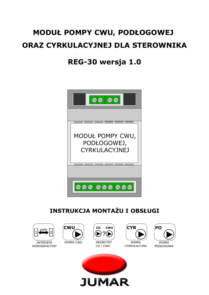JUMAR REG- 30 MODUŁ CWU MODUŁ POMPY CWU, PODŁOGOWEJ ORAZ CYRKULACYJNEJ DLA STEROWNIKA REG-30 wersja 1.0 MODUŁ POMPY CWU, PODŁOGOWEJ, CYRKULACYJNEJ INSTRUKCJA MONTAŻU I OBSŁUGI 1 com CWU 2 INTERJEFS KOMUNIKACYJNY CO CWU CYR PO ? POMPA CWU PRIORYTET CO / CWU -1- POMPA CYRKULACYJNA POMPA PODŁOGOWA JUMAR REG- 30 MODUŁ CWU -2- JUMAR REG- 30 MODUŁ CWU SPIS TREŚCI BEZPIECZEŃSTWO UŻYTKOWANIA.....................................................................4 ZALECENIA MONTAŻOWE...................................................................................5 DANE TECHNICZNE.............................................................................................5 ZASTOSOWANIE.................................................................................................7 ZASADA DZIAŁANIA...........................................................................................7 MONTAŻ MODUŁU...............................................................................................7 SCHEMAT I OPIS POŁĄCZEŃ MODUŁU................................................................8 PODŁĄCZENIE DO GŁÓWNEGO STEROWNIKA...................................................10 PORUSZANIE SIĘ PO PALENACH STERUJĄCYCH...............................................11 PANEL STERUJĄCY I EDYCJA TEMPERATURY....................................................12 STRUKTURA MENU............................................................................................13 TABELE USTAWIEŃ...........................................................................................14 GRUPA USTAWIENIA KOTLA CO........................................................................15 GRUPA USTAWIENIA ZBIORNIKA CWU...............................................................16 GRUPA USTAWIENIA CYRKULACJI.....................................................................17 NOTATKI .........................................................................................................20 -3- JUMAR REG- 30 MODUŁ CWU Dziękujemy za wybór naszego produktu. Niniejsza instrukcja ma na celu ułatwić Państwu instalację sterownika oraz zapoznać się z obsługą i bezpiecznym użytkowaniem urządzenia. Przed instalacją urządzenia prosimy o dokładne przeczytanie instrukcji i zapoznanie się z działaniem sterownika. W przypadku pytań prosimy o kontakt z firmą JUMAR. P.P.U.H JUMAR Jerzy Podhajski ul. Opawska 112 47-400 Racibórz tel./fax 032-415-80-39 tel. 032-415-54-24 e-mail: [email protected] www.ju-mar.eu -4- JUMAR REG- 30 MODUŁ CWU BEZPIECZEŃSTWO UŻYTKOWANIA Przed rozpoczęciem użytkowania należy uważnie przeczytać niniejszą instrukcję. Instalacji i podłączeń regulatora powinien dokonywać wykwalifikowany personel. Należy wziąć pod uwagę wszystkie dostępne wymogi ochrony. Przed włączeniem regulatora należy sprawdzić poprawność wszystkich połączeń. Zapewnić właściwe warunki pracy zgodnie ze specyfikacją urządzenia. ZALECENIA MONTAŻOWE Nie zasilać urządzenia z tych samych linii co urządzenia wysokiej mocy bez odpowiednich filtrów sieciowych. Unikać prowadzenia przewodów sygnałowych w bezpośrednim sąsiedztwie i równolegle do przewodów energetycznych i zasilających. Unikać bliskości urządzeń zdalnie sterowanych, obciążeń wysokiej mocy, urządzeń z grupową lub fazową regulacją mocy oraz innych urządzeń wytwarzających duże zakłócenia impulsowe. Przy podłączaniu zasilania należy pamiętać, że w instalacji budynku powinien istnieć wyłącznik lub wyłącznik automatyczny. Element ten powinien być w pobliżu urządzenia, łatwo dostępny dla operatora i oznakowany jako przyrząd rozłączający urządzenie. Za szkody spowodowane nieprzestrzeganiem niniejszej instrukcji producent nie ponosi odpowiedzialności. -5- JUMAR REG- 30 MODUŁ CWU DANE TECHNICZNE Czujniki: KTY-210 Zakres pomiarów: • Temperatura CWU: 0 – 120 °C • Temperatura cyrkulacji: 0 – 120 °C Rozdzielczość pomiarów: 0.1 °C Czas pomiarów: 1s Odczyt danych: Na module głównym Wyjścia sterujące: • Pompa CWU ~230V 2A (0.8A) przekaźnik • Pompa podłogowa ~230V 2A (0.8A) przekaźnik • Pompa cyrkulacyjna ~230V 2A (0.8A) triak Zabezpieczenie: • Bezpiecznik 4A Elektryczne Wejścia: • KTY-210 Czujniki temperatury: Sygnalizacja: • Sygnalizacja tanów wyjść Diody LED Zasilanie: 5V 0.5A Temperatura pracy: 5°C - 50°C Stopień ochrony obudowy: IP20 Wymiary (dł. x szer. x wys.): 90x70x65 -6- JUMAR REG- 30 MODUŁ CWU ZASTOSOWANIE Moduł rozszerzający do sterownika REG-30 służy do sterowania dodatkowymi pompami w istalacji centalnego ogrzewania tj.: pompa CWU (ciepłej wody użytkowej), pompa ogrzewania podłogowego, pompa cyrkulacyjna. ZASADA DZIAŁANIA Moduł ten pozwala na obsłużenie pompy zasobnika ciepłej wody użytkowej. Pompa CWU zaczyna pracować, gdy regulator wykryje temperaturę zasobnika poniżej nastawionej. Możliwe jest również określenie trybu działanie pompy CWU - z priorytetem lub bez. Przy włączonym priorytecie w pierwszej kolejności nagrzewany jest zbiornik CWU, a następnie instalacja CO. Dodatkowo urządzenie posiada możliwość sterowania pompą cyrkulacyjną. Jej zadaniem jest zapewnienie ciągłego obiegu wody użytkowej (cyrkulacji) od urządzenia grzewczego do odbiornika. Pompa taka zapewnia utrzymanie stałej temperatury wody użytkowej. Możliwe jest również ustawienie przedziałów czasowych w których ta pompa pracuje. Moduł pozwala również na podłączenie pompy dla systemu ogrzewania podłogowego. Dla pompy podłogowej ustalana jest temperatura progowa załączenia pompy. MONTAŻ MODUŁU Moduł dodatkowy przeznaczony jest do montażu na ścianie lub na kotle. Należy zapewnić odpowiednią izolację termiczną a urządzeniem. -7- pomiędzy gorącymi ściankami kotła, JUMAR REG- 30 MODUŁ CWU Wyjście komunikacyjne Czujnik CWU Czujnik wody cyrkulacyjnej Wejście komunikacyjne SCHEMAT I OPIS POŁ
