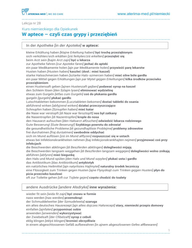 www.aterima-med.pl/niemiecki Lekcja nr 28 Kurs niemieckiego dla Opiekunek W aptece – czyli czas grypy i przeziębień In der Apotheke [in der Apoteke] w aptece: kleine Erkältung haben [klajne Erkeltung haben] być trochę przeziębionym sich verkühlen/sich erkälten [ziś ferkylen/ziś erkelten] przeziębić się beim Arzt sein [bajm Arct zajn] być u lekarza zur Apotheke fahren [cur Apoteke faren] jechać do apteki ein paar Medikamente holen [ajn par Medikamente holen] przywieźć parę lekarstw Husten haben [Husten haben] kaszleć (dosł.: mieć kaszel) starke Halsschmerzen haben [sztarke Hals-szmercen haben] mieć silne bóle gardła ein paar Mittel gegen Erkältungen [ajn par Mytel gejgen Erkeltungen] kilka środków przeciwko przeziębieniom einen Hustensaft geben [ajnen Hustenzaft gejben] podawać syrop na kaszel den Schleim lösen [den Szlajm lysen] eliminować wydzielinę etwas zum Gurgeln [etfas cum Gurgeln] coś do płukania gardła gurgeln [gurgeln] płukać gardło Lutschtabletten bekommen [Lucztableten bekomen] dostać tabletki do ssania abführend wirken [abfyjrend wirken] działać przeczyszczająco Schnupfen haben [Sznupfen haben] mieć katar die Nase war verstopft [di Naze war fersztopft] nos był zatkany die Nasentropfen [di Nazentropfen] krople do nosa den Hausarzt aufsuchen [den Hałsarct ałfzuchen] odwiedzić lekarza rodzinnego Gute Besserung! [Gute Beserung!] Szybkiego powrotu do zdrowia! die gesundheitliche Probleme [di gezundhajtlisie Problejme] problemy zdrowotne frei durchatmen [fraj durśatmen] swobodnie oddychać sich im Mund auflösen [ziś im Mund ałflyzen] rozpuszczać się w ustach etwas bei Infektionskrankheiten nehmen [baj Infekcjonskrankhajten nejmen] przyjmować coś przy infekcjach die Beschwerden abklingen [di Beszferden abklingen] dolegliwości mijają die Beschwerden langsam weggehen [di Beszferden langzam weggejen] dolegliwości wolno znikają abführen [abfyren] mieć biegunkę den Hals und Mund spülen [den Hals und Mund szpylen] płukać usta i gardło das Antibiotikum [das Antibiotikum] antybiotyk ein natürliches Heilmittel [ajn natyrlisies Hajlmytel] naturalny środek leczniczy eine Flüssigkeit zum Trinken gegen Husten [ajne Flysyśkajt cum Trinken gejgen Husten] płyn do picia przeciwko kaszlowi oft zur Toilette gehen [oft cur Tojlete gejen] często chodzić do toalety andere Ausdrücke [andere Ałsdryke] inne wyrażenia: wieder fit sein [wida fit zajn] być znowu w formie nass werden [nas werden] przemoknąć der Schmuddelwetter [der Szmudelweta] szaruga ein altes deutsches Hausrezept [ajn altes dojczes Hałsrecept] stary, niemiecki przepis domowy einfallen [ajnfalen] przypominać sobie anwenden [anwenden] wykorzystywać der Zwiebelsaft [der Cfibelzaft] syrop z cebuli eklig klingen [eklyś klingen] brzmieć obrzydliwie in einem abgeschlossenen Gefäß aufbewahren [in ajnem abgeszlosenen Gefes ałfbewaren] 1 www.aterima-med.pl/niemiecki przechowywać w zamkniętym naczyniu wie ein natürliches Antibiotikum funktionieren [wi ajn natyrlisies Antibiotikum funkcjoniren] działać jak naturalny antybiotyk Materiał stanowi własność firmy ATERIMA Sp. z o.o. Sp. K. ul. Puszkarska 7f, 30-644 Kraków. Reprodukcja, rozpowszechnianie lub inne wykorzystywanie całości lub części materiału w jakiejkolwiek formie dla celów innych, niż cele niekomercyjne i osobiste jest zakazane. 2 Powered by TCPDF (www.tcpdf.org)