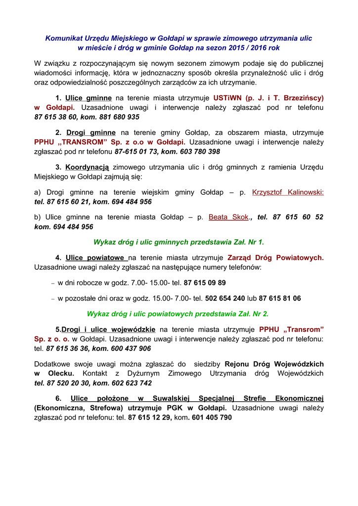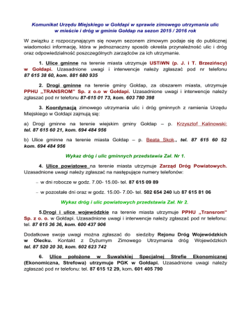 Komunikat Urzędu Miejskiego w Gołdapi w sprawie zimowego utrzymania ulic w mieście i dróg w gminie Gołdap na sezon 2015 / 2016 rok W związku z rozpoczynającym się nowym sezonem zimowym podaje się do publicznej wiadomości informację, która w jednoznaczny sposób określa przynależność ulic i dróg oraz odpowiedzialność poszczególnych zarządców za ich utrzymanie. 1. Ulice gminne na terenie miasta utrzymuje USTiWN (p. J. i T. Brzezińscy) w Gołdapi. Uzasadnione uwagi i interwencje należy zgłaszać pod nr telefonu 87 615 38 60, kom. 881 680 935 2. Drogi gminne na terenie gminy Gołdap, za obszarem miasta, utrzymuje PPHU ,,TRANSROM” Sp. z o.o w Gołdapi. Uzasadnione uwagi i interwencje należy zgłaszać pod nr telefonu 87-615 01 73, kom. 603 780 398 3. Koordynacją zimowego utrzymania ulic i dróg gminnych z ramienia Urzędu Miejskiego w Gołdapi zajmują się: a) Drogi gminne na terenie wiejskim gminy Gołdap – p. Krzysztof Kalinowski: tel. 87 615 60 21, kom. 694 484 956 b) Ulice gminne na terenie miasta Gołdap – p. Beata Skok., tel. 87 615 60 52 kom. 694 484 956 Wykaz dróg i ulic gminnych przedstawia Zał. Nr 1. 4. Ulice powiatowe na terenie miasta utrzymuje Zarząd Dróg Powiatowych. Uzasadnione uwagi należy zgłaszać na następujące numery telefonów: w dni robocze w godz. 7.00- 15.00- tel. 87 615 09 89 w pozostałe dni oraz w godz. 15.00- 7.00- tel. 502 654 240 lub 87 615 81 06 Wykaz dróg i ulic powiatowych przedstawia Zał. Nr 2. 5.Drogi i ulice wojewódzkie na terenie miasta utrzymuje PPHU „Transrom” Sp. z o. o. w Gołdapi. Uzasadnione uwagi i interwencje należy zgłaszać pod nr telefonu: tel. 87 615 36 36, kom. 600 437 906 Dodatkowe swoje uwagi można zgłaszać do siedziby Rejonu Dróg Wojewódzkich w Olecku. Kontakt z Dyżurnym Zimowego Utrzymania dróg Wojewódzkich tel. 87 520 20 30, kom. 602 623 742 6. Ulice położone w Suwalskiej Specjalnej Strefie Ekonomicznej (Ekonomiczna, Strefowa) utrzymuje PGK w Gołdapi. Uzasadnione uwagi należy zgłaszać pod nr telefonu: tel. 87 615 12 29, kom. 601 405 790 UWAGA ! CAŁODOBOWO SWOJE UWAGI I PROŚBY MOŻNA ZGŁASZAĆ DO PUNKTU MONITORINGU WIZYJNEGO URZĘDU MIEJSKIEGO w GOŁDAPI TEL. 87 615 60 57 Apel do właścicieli i zarządców nieruchomości Gdy za oknami robi się chłodno i pojawia się pierwszy śnieg, właściciel lub zarządca budynku powinien być gotowy do wykonywania dodatkowych prac. Powszechnie wiadomo, że jest on zobowiązany do odśnieżania chodników i ciągów komunikacyjnych znajdujących się na podległym mu terenie. Ale trzeba wiedzieć, że zimowe obowiązki zarządcy to nie tylko odśnieżanie. Właściciel nieruchomości lub działający w jego imieniu zarządca musi wykonywać podczas zimy także szereg innych prac w trosce o bezpieczeństwo mieszkańców i użytkowników obiektów. Bezpieczny chodnik to podstawa Usuwanie lodu i śniegu z chodników otaczających nieruchomość lub stanowiących integralną część osiedla ma nie tylko względy praktyczne. Nie chodzi jedynie o umożliwienie swobodnego przemieszczania się mieszkańców, jest to także wymóg regulowany ustawowo. Jeśli zarządca nieruchomości nie zadba o oczyszczenie chodnika, dróg i innych pieszo-jezdnych ciągów komunikacyjnych i w wyniku tego dojdzie do wypadku musi być świadomy, że będzie musiał wypłacić odszkodowanie osobom poszkodowanym. Jest to szczególnie ważne w przypadku nieruchomości, w których występuje duży przepływ ludności. W takich miejscach bardzo łatwo o pośliźnięcie się przechodnia na nieodśnieżonej albo śliskiej powierzchni chodnika. Bardzo ważne jest nie tylko odpowiednie usunięcie śniegu i lodu z chodnika czy schodów znajdujących się na zewnątrz zarządzanego obiektu. Dodatkowym zabezpieczeniem dla mieszkańców mogą być na przykład specjalne maty antypoślizgowe, które można położyć na schodach oraz w ich pobliżu. Odśnieżanie nie kończy się na ogrodzeniu Właściciel posesji, a tym samym także zarządca znajdującej się na niej nieruchomości muszą również dbać o bezpośrednie sąsiedztwo działki. Taki wymóg stawia przed nimi ustawa o utrzymaniu czystości i porządku w gminach (Dz. U. z 2013r., poz. 1399). Zarządca, właściciel ma obowiązek sprzątania chodnika, który znajduje się „bezpośrednio przy granicy nieruchomości”. Trzeba jednak pamiętać, że za chodnik uznaje się także nieutwardzoną część drogi przeznaczoną dla ruchu pieszych. Nie tylko odśnieżanie chodnika Bardzo często nawet właściciel nieruchomości nie ma pojęcia o tym, że ciąży na nim obowiązek usuwania sopli, nawisów lodowych czy śniegu z dachu budynku. Tę kwestię od dawna szczegółowo reguluje prawo budowlane w ustępie drugim artykułu 61 (Dz. U. 1994 Nr 89 poz. 414). Zgodnie z nim zimowe obowiązki zarządcy obejmują także zapewnienie bezpiecznego użytkowania budynku między innymi podczas występowania intensywnych opadów atmosferycznych oraz ich następstw. W związku z tym zarządca musi dbać także o usuwanie nadmiaru śniegu z dachu czy likwidację sopli i nawisów lodowych, które mogą zagrażać życiu i zdrowiu mieszkańców oraz przechodniów. Ponadto obowiązkiem zarządcy jest odpowiednie zabezpieczenie budynku i terenu wokół niego poprzez utworzenie strefy ochronnej na czas trwania prac na wysokości. Obowiązek, o którym często się zapomina Intensywne opady śniegu lub inne zjawiska meteorologiczne czy sejsmiczne powodują, że na zarządcy ciąży również obowiązek okresowej i doraźnej kontroli stanu technicznego nieruchomości. Terminy kontroli okresowych są uzależnione od rodzaju i przeznaczenia nieruchomości i są regulowane ustawowo. Jednak w razie wystąpienia ekstremalnych zjawisk pogodowych czy intensywnych opadów śniegu każdorazowo zarządca jest zobowiązany do doraźnej kontroli budynku, a w szczególności dachu. Ma to na celu sprawdzenie między innymi czy nie grozi nam katast