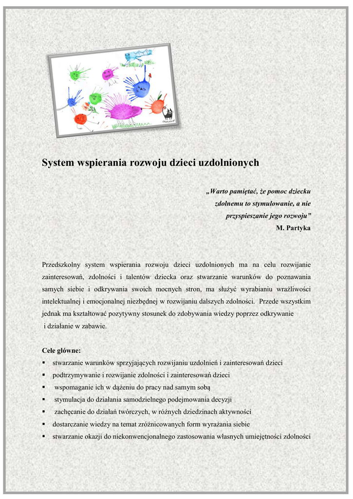 System wspierania rozwoju dzieci uzdolnionych „Warto pamiętać, że pomoc dziecku zdolnemu to stymulowanie, a nie przyspieszanie jego rozwoju” M. Partyka Przedszkolny system wspierania rozwoju dzieci uzdolnionych ma na celu rozwijanie zainteresowań, zdolności i talentów dziecka oraz stwarzanie warunków do poznawania samych siebie i odkrywania swoich mocnych stron, ma służyć wyrabianiu wrażliwości intelektualnej i emocjonalnej niezbędnej w rozwijaniu dalszych zdolności. Przede wszystkim jednak ma kształtować pozytywny stosunek do zdobywania wiedzy poprzez odkrywanie i działanie w zabawie. Cele główne: stwarzanie warunków sprzyjających rozwijaniu uzdolnień i zainteresowań dzieci podtrzymywanie i rozwijanie zdolności i zainteresowań dzieci wspomaganie ich w dążeniu do pracy nad samym sobą stymulacja do działania samodzielnego podejmowania decyzji zachęcanie do działań twórczych, w różnych dziedzinach aktywności dostarczanie wiedzy na temat zróżnicowanych form wyrażania siebie stwarzanie okazji do niekonwencjonalnego zastosowania własnych umiejętności zdolności POSTĘPOWANIE WSPOMAGAJĄCE 1. Zdolności plastyczne : □ swobodny dostęp do materiałów i przyborów wyeksponowanych w kąciku plastycznym □ eksperymentowanie tworzywem plastycznym □ większy stopień trudności w wykonywanych pracach □ wprowadzanie nowych technik, swobodny wybór technik □ pozostawienie dziecku swobody zgodnej z jego wyobraźnią □ udział dzieci w przeglądach, prezentacjach, wystawach prac □ udział dzieci w konkursach plastycznych lokalnych i ogólnopolskich □ udział warsztatach plastycznych w MOK- u, Bibliotece, Szkole Podstawowej 2. Zdolności taneczne i muzyczne. □ swobodny dostęp do instrumentów perkusyjnych □ umożliwienie wyrażania swobodnej ekspresji ruchowej przy muzyce poprzez zastosowanie metody B. Strauss, Pedagogiki zabawy, dramy □ umożliwianie dzieciom zabaw tanecznych i zabaw ze śpiewem w czasie wolnym □ uczestnictwo w dodatkowych zajęciach rytmiczno-muzycznych organizowanych przez przedszkole □ samodzielne wykonywanie instrumentów perkusyjnych z różnorodnych materiałów □ gra na instrumentach traktowana jako zabawa □ tworzenie improwizacji słowno-muzycznych □ prezentowanie umiejętności dzieci na uroczystościach przedszkolnych, □ kierowanie dzieci na konkury, przeglądy piosenki i festiwale dziecięce □ wyjścia na koncerty muzyczne do szkoły muzycznej 3. Zdolności w nauce czytania i pisania. □ zabawy z literami i wyrazami z wykorzystaniem Odimiennej Metody Nauki Czytania I.Majchrzak. □ wprowadzenie do pracy Metody Dobrego Startu M. Bogdanowicz □ ćwiczenia graficzne metodą stopniowania □ próby czytania prostych wyrazów i zdań. □ stopniowanie trudności podczas zajęć, umożliwienie dzieciom prezentacji swoich uzdolnień na tle grupy . □ samodzielne czytanie przez dziecko dla kolegów 4. Zdolności recytatorskie. □ pokazanie zdolności dzieci podczas uroczystości przedszkolnych, zajęć, zabaw zorganizowanych □ przydzielanie dłuższych i bardziej skomplikowanych tekstów do opanowania □ zachęcanie do ruchowych improwizacji recytowanego tekstu □ zgłaszanie dziecka do konkursów organizowanych przez środowisko lokalne 5. Zdolności matematyczne. □ promowanie umiejętności dziecka na tle grupy □ indywidualne karty pracy dla dziecka □ przygotowywanie bardziej skomplikowanych zadań matematycznych □ tworzenie gier z ustaleniem reguł □ stosowanie wyliczanek □ udział w konkursach organizowanych w innych placówkach 6. Zdolności intelektualne. □ rozwiązywanie i samodzielne układanie krzyżówek, rebusów, układanie historyjek wyrazowych i obrazkowych □ aktywizowanie do dyskusji, sądów i przemyśleń na temat wysłuchanych utworów literackich, muzycznych, spektakli teatralnych, filmów □ tworzenie kącików zainteresowań, bogatych w eksponaty, narzędzia i przybory □ tworzenie możliwości do poszukiwań wiedzy w encyklopedii i atlasach □ organizowanie spotkań z ciekawymi ludźmi □ organizowanie wycieczek do miejsc, będących bodźcem rozwoju intelektualnego ( muzeum, wystawy, teatr, miejsca pracy…) □ wspomaganie nauczyciela przez dziecko zdolne jako ,, asystent’’ □ organizowanie pomocy koleżeńskiej dla dzieci zainteresowanych 7. Zdolności przyrodnicze. □ utrwalanie naturalnej wrażliwości dziecka poprzez opowiadanie o życiu zwierząt, ich zwyczajach, odczuciach □ poszerzanie wiedzy dziecka poprzez udostępnienie tematycznych czasopism i książek, gier ukazujących sposoby obserwowania przyrody □ wspólne wyprawy do zoo, do lasu, parku, ogrodu, spędzanie czasu w plenerze □ wspólne eksperymentowanie i obserwowanie, zakładanie hodowli roślin, □ organizowanie zabaw badawczych z przyrządami: lornetką, lupą □ rozpoznawanie i nazywanie wybranych minerałów: sól, węgiel, bursztyn □ wykorzystanie Encyklopedii Przyrodniczej, atlasów, globusa □ praktyczne doświadczanie za pomocą zmysłów, doświadczeń i eksperymentów □ udział w akcjach i działaniach ekologicznych 8. Zdolności aktorskie. □ przygotowanie kącików do inscenizacji wyposażonych w rekwizyty, stroje, biżuterię □ zabawy w teatr, odgrywanie scenek z bajek i życia □ przygotowanie występów aktorskich dla rodziców i kolegów □ wspólne występy z nauczycielami lub rodzicami □ słuchanie opowieści dziecka z zainteresowaniem, zadawanie pytań □ opowiadanie dziecku bajek, zachęcanie do układania nowych wersji □ samodzielne układanie rymowanek, wierszyków, zagadek, opowiadań □ zabawy ze słowami (wyszukiwanie wyrazów na daną głoskę, odnajdywanie wyrazów podobnych i przeciwstawnych) □ wyjścia do teatru na spektakle, spotkania z aktorami 9. Zdolności sportowe. □ kształtowanie ogólnej sprawności fizycznej poprzez zastosowanie różnych form ruchu ( rzutu, chwytu, skoku), doskonalenie zmysłu równowagi □ zach