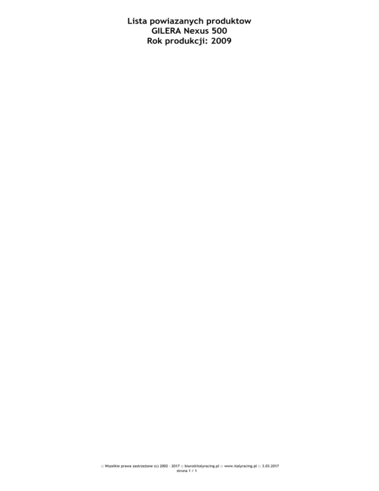 Lista powiazanych produktow GILERA Nexus 500 Rok produkcji: 2009 :: Wszelkie prawa zastrzeżone (c) 2002 - 2017 :: [email protected] :: www.italyracing.pl :: 3.03.2017 strona 1 / 1