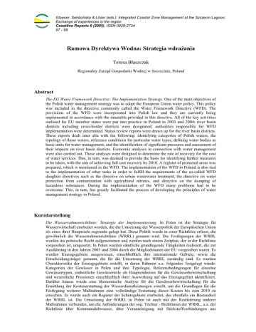 Glaeser, Sekścińska & Löser (eds.): Integrated Coastal Zone Management at the Szczecin Lagoon: Exchange of experiences in the region Coastline Reports 6 (2005), ISSN 0928-2734 87 - 99 Ramowa Dyrektywa Wodna: Strategia wdrażania Teresa Błaszczak Regionalny Zarząd Gospodarki Wodnej w Szczecinie, Poland Abstract The EG Water Framework Directive: The Implementation Strategy. One of the main objectives of the Polish water management strategy was to adopt the European Union water policy. This policy was included in the directive commonly called the Water Framework Directive (WFD). The provisions of the WFD were incorporated into Polish law and they are currently being implemented in accordance with the timetable provided in this directive. All of the key activities outlined for EU member states were put into practice in Poland in 2003 and 2004; river basin districts including cross-border districts were designated; authorities responsible for WFD implementation were determined. Status review reports were drawn up for the river basin districts. These reports dealt inter alia with the following: identifying categories of Polish waters, the typology of those waters, reference conditions for particular water types, defining water bodies as basic units for water management, and the identification of significant pressures and assessment of their impacts on river basin districts. Economic analyses in connection with water management were also carried out. These analyses were designed to determine the rate of recovery for the cost of water services. This, in turn, was deemed to provide the basis for identifying further measures to be taken, with the aim of achieving full cost recovery by 2010. A register of protected areas was prepared, which is mentioned in the WFD. The implementation of the WFD in Poland is also tied to the implementation of other tasks in order to fulfill the requirements of the so-called WFD daughter directives such as the directive on urban wastewater treatment, the directive on water protection from contamination with agricultural nitrates, and directive on the dumping of hazardous substances. During the implementation of the WFD many problems had to be overcome. This, in turn, has greatly facilitated the process of developing the principles of water management strategy in Poland. Kurzdarstellung Die Wasserrahmenrichtlinie: Strategie der Implementierung. In Polen ist die Strategie für Wasserwirtschaft erarbeitet worden, die die Umsetzung der Wasserpolitik der Europäischen Union als eines ihrer Hauptziele zugrunde gelegt hat. Diese Politik wurde in einer Richtlinie erfasst, die gewöhnlich die Wasserrahmenrichtlinie (WRRL) genannt wird. Die Festlegungen der WRRL wurden ins polnische Recht aufgenommen und werden nach einem Zeitplan, der in der Richtlinie vorgesehen ist, umgesetzt. In Polen wurden sämtliche grundlegende Tätigkeiten realisiert, die zur Ausführung in den Jahren 2003 und 2004 durch die Mitgliedstaaten der EU vorgesehen waren. Es wurden Einzugsgebiete ausgewiesen, einschließlich ihre internationale Gebiete, sowie die Entscheidungsträger genannt, die für die Umsetzung der WRRL zuständig sind. Es wurden Charakteristika der Einzugsgebiete erstellt, in deren Rahmen u.a. folgendes festgelegt wurde: Kategorien der Gewässer in Polen und ihre Typologie, Referenzbedingungen für einzelne Gewässertypen, einheitliche Gewässerteile als Haupteinheiten für die Gewässerbewirtschaftung und wesentliche Pressionen einschließlich ihrer Auswirkung auf das Einzugsgebiet identifiziert. Darüber hinaus wurde eine ökonomische Analyse für die Gewässerbewirtschaftung für die Ermittlung der Kostenerstattung der Wasserdienstleistungen erstellt, um die Grundlagen für die Festlegung weiterer Maßnahmen eine vollständige Erstattung dieser Kosten bis zum 2010 zu erreichen. Es wurde auch ein Register der Schutzgebiete erarbeitet, das ebenfalls ein Bestandteil der WRRL ist. Die Umsetzung der WRRL in Polen ist auch mit der Realisierung anderer Maßnahmen verbunden, um die Anforderungen der sog. Töchter - Richtlinien der WRRL, u.a. der Richtlinie über Kommunalabwasser, über Verunreinigung mit Stickstoffverbindungen aus 88 Błaszczak: Ramowa Dyrektywa Wodna: Strategia wdrażania landwirtschaftlichen Quellen und der Richtlinie über gefährliche Stoffe zu erfüllen. Bei der Umsetzung der WRRL mussten zahlreiche Probleme überwunden werden, was zum Aufbau von Prämissen und einer Strategie für Wasserwirtschaft in Polen wesentlich beigetragen hat. 1 Wstęp Strategia wdrażania Ramowej Dyrektywy Wodnej w Polsce nie ma granic administracyjnych co oznacza, że nie można mówić o takiej strategii w obrębie województwa ani żadnej innej struktury administracyjnej. Jest ona jednym z głównych celów strategicznych innej większej strategii – strategii gospodarki wodnej w Polsce. Głównymi celami tej strategii są: wdrożenie polityki wodnej Unii Europejskiej zwiększenie bezpieczeństwa powodziowego kraju oraz zapobieganie skutkom suszy usprawnienie gospodarowania majątkiem Skarbu Państwa związanym z zasobami wodnymi uspołecznienie procesu decyzyjnego w zakresie gospodarki wodnej, co wymaga przebudowy i udoskonalenia systemów instytucjonalnych, prawnych i finansowych. Wdrożenie polityki wodnej Unii Europejskiej rozpoczęto w Polsce już w trakcie przygotowań do członkostwa. W wyniku negocjacji z Unią Europejską podjęto szereg zobowiązań i rozpoczęto ich realizację zgodnie z harmonogramem zawartym w Narodowym Programie Przygotowań do Członkostwa (NPPC). Strategia wdrażania Ramowej Dyrektywy Wodnej wchodzi w zakres wdrożenia w Polsce polityki wodnej Unii Europejskiej. Wdrożenie tej polityki to przede wszystkim transpozycja dyrektywy z dnia 23 października 2000 r. nr 2000/60/EC ustanawiającej ramy wspólnotowego działania w dziedzinie polityki wodnej (tzw. Ramowej Dyrektywy Wodnej) do polskiego systemu prawnego. Ustalenia tej dyrektywy zostały w Polsce pr