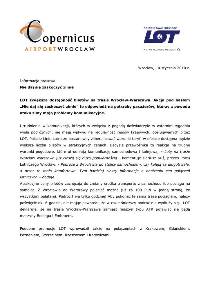 Wrocław, 14 stycznia 2010 r. Informacja prasowa Nie daj się zaskoczyć zimie LOT zwiększa dostępność biletów na trasie Wrocław-Warszawa. Akcja pod hasłem „Nie daj się zaskoczyć zimie” to odpowiedź na potrzeby pasaŜerów, którzy z powodu ataku zimy mają problemy komunikacyjne. Utrudnienia w komunikacji, których w związku z pogodą doświadczyło w ostatnim tygodniu wielu podróŜnych, nie mają wpływu na regularność rejsów krajowych, obsługiwanych przez LOT. Polskie Linie Lotnicze postanowiły zliberalizować warunki taryf, w efekcie dostępna będzie większa liczba biletów w atrakcyjnych cenach. Decyzja przewoźnika to reakcja na trudne warunki pogodowe, które utrudniają komunikację samochodową i kolejową. – Loty na trasie Wrocław-Warszawa juŜ cieszą się duŜą popularnością - komentuje Dariusz Kuś, prezes Portu Lotniczego Wrocław. - PodróŜe z Wrocławia do stolicy samochodem, czy koleją są długotrwałe, a przez to mało komfortowe. Tym bardziej cieszy informacja o obniŜeniu cen połączeń lotniczych – dodaje. Atrakcyjne ceny biletów zachęcają do zmiany środka transportu z samochodu lub pociągu na samolot. Z Wrocławia do Warszawy polecieć moŜna juŜ za 100 PLN w jedną stronę, ze wszystkimi opłatami. PodróŜ trwa tylko godzinę! Aby pokonać tę samą trasę pociągiem, naleŜy poświęcić ok. 6 godzin, nie mając pewności, Ŝe w razie śnieŜycy podróŜ nie wydłuŜy się. LOT deklaruje, Ŝe na trasie Wrocław-Warszawa zamiast maszyn typu ATR pojawiać się będą maszyny Boeinga i Embraera. Podobne promocje LOT wprowadził takŜe na Poznaniem, Szczecinem, Rzeszowem i Katowicami. połączeniach z Krakowem, Gdańskiem, Polskie Linie Lotnicze LOT to jedna z najstarszych linii lotniczych na świecie. Od 1929 roku PLL LOT łączą Polskę ze światem. Obecnie samoloty LOT latają do ponad 50 miast w Europie i Ameryce Północnej. W 2008 samoloty LOT przewiozły prawie 4 miliony pasaŜerów. W 2010 roku LOT stanie się pierwszą europejską linią lotniczą, która w swojej flocie będzie miała samoloty Boeing 787 Dreamliner. Wśród pilotów LOT-u są mistrzowie Europy i świata we wszystkich dyscyplinach sportów lotniczych. Od 2003 LOT naleŜy do sojuszu Star Alliance, którego członkowie oferują 19.700 rejsów dziennie do 1.077 portów lotniczych w 175 krajach. Port Lotniczy im. Mikołaja Kopernika we Wrocławiu połoŜony jest w południowo-zachodniej części Wrocławia, w odległości ok. 10 km od centrum miasta. Oferuje połączenia z 30 portami europejskimi, m.in. z Rzymem Ciampino, ParyŜem Beauvais i Oslo Torp. W marcu tego roku dzięki liniom Ryanair Wrocław zyska regularne loty do Bolonii i Oslo-Rygge, a w czerwcu – do Malagi. Drugi nisko-kosztowy przewoźnik, Wizz Air wiosną 2010 r. otworzy bazę operacyjną w Porcie Lotniczym Wrocław i zacznie latać do Mediolanu-Bergamo, Bolonii-Forli, Eindhoven, Cork i Doncaster Sheffield. W roku 2011 Port Lotniczy Wrocław wzbogaci się o nowy terminal. Jego początkowa przepustowość wyniesie ponad 2 mln pasaŜerów, docelowo będzie moŜna tam obsłuŜyć 7 mln osób. Więcej informacji Sylwia Chmielarz Profit Communications [email protected] +48 512 036 303