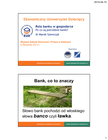2014-04-15 Ekonomiczny Uniwersytet Dziecięcy Rola banku w gospodarce Po co są potrzebne banki? dr Marek Szewczyk Wyższa Szkoła Ekonomii i Prawa w Kielcach 6 listopada 2013 r. EKONOMICZNY UNIWERSYTET DZIECIĘCY WWW.UNIWERSYTET-DZIECIECY.PL Bank, co to znaczy Słowo bank pochodzi od włoskiego słowa banco czyli ławka. EKONOMICZNY UNIWERSYTET DZIECIĘCY WWW.UNIWERSYTET-DZIECIECY.PL 1 2014-04-15 Czym zajmują się banki? • Głównie pieniędzmi. $$ $$ EKONOMICZNY UNIWERSYTET DZIECIĘCY WWW.UNIWERSYTET-DZIECIECY.PL Skąd się biorą pieniądze? • Praca daje pieniądze – wynagrodzenia. • Prezenty… • Spadki … • Można sprzedać majątek … • Ludzie sobie pożyczają pieniądze … EKONOMICZNY UNIWERSYTET DZIECIĘCY WWW.UNIWERSYTET-DZIECIECY.PL 2 2014-04-15 Oszczędności EKONOMICZNY UNIWERSYTET DZIECIĘCY WWW.UNIWERSYTET-DZIECIECY.PL Zakupy - konsumpcja Płacimy rachunki –zobowiązania EKONOMICZNY UNIWERSYTET DZIECIĘCY WWW.UNIWERSYTET-DZIECIECY.PL 3 2014-04-15 Jak działają banki 1. Przyjmują pieniądze 2. Przechowują pieniądze (depozyty) 3. Przekazują pieniądze 4. Pożyczają pieniądze EKONOMICZNY UNIWERSYTET DZIECIĘCY WWW.UNIWERSYTET-DZIECIECY.PL Rola banku w gospodarce EKONOMICZNY UNIWERSYTET DZIECIĘCY WWW.UNIWERSYTET-DZIECIECY.PL 4 2014-04-15 Transformacja czyli zamiana • Bank może zamienić oszczędności w inwestycje. • Bank może błyskawicznie zamienić miejsce położenia pieniędzy. • Bank może kojarzyć pożyczkodawcę z pożyczkobiorcą. • Bank umie zamienić małe depozyty (lokaty) w duża pożyczkę. EKONOMICZNY UNIWERSYTET DZIECIĘCY WWW.UNIWERSYTET-DZIECIECY.PL Produkty bankowe •Depozyty •Kredyty EKONOMICZNY UNIWERSYTET DZIECIĘCY WWW.UNIWERSYTET-DZIECIECY.PL 5 2014-04-15 Depozyt • To wolne środki pieniężne, które w danym momencie nie są potrzebne właścicielowi. Depozyt tradycyjny EKONOMICZNY UNIWERSYTET DZIECIĘCY WWW.UNIWERSYTET-DZIECIECY.PL Czy warto oszczędzać? • Bezpieczeństwo – gwarancja • Oprocentowanie • Przewidywalność (można obliczyć sobie odsetki) • Swoboda dostępu • Nie szukamy inwestora • Przyczyniamy się do wzrostu inwestycji w gospodarce EKONOMICZNY UNIWERSYTET DZIECIĘCY WWW.UNIWERSYTET-DZIECIECY.PL 6 2014-04-15 Kredyt – co to jest? • Pieniądze, które banki pożyczają przedsiębiorstwom, gospodarstwom domowym. • Kredytobiorca – to ten kto bierze kredyt. • Odsetki od kredytu – to opłata którą biorą banki za udzielenie kredytu. EKONOMICZNY UNIWERSYTET DZIECIĘCY WWW.UNIWERSYTET-DZIECIECY.PL INNE PRODUKTY I USŁUGI BANKOWE EKONOMICZNY UNIWERSYTET DZIECIĘCY WWW.UNIWERSYTET-DZIECIECY.PL 7 2014-04-15 Konta osobiste EKONOMICZNY UNIWERSYTET DZIECIĘCY WWW.UNIWERSYTET-DZIECIECY.PL Karty płatnicze EKONOMICZNY UNIWERSYTET DZIECIĘCY WWW.UNIWERSYTET-DZIECIECY.PL 8 2014-04-15 Usługi maklerskie EKONOMICZNY UNIWERSYTET DZIECIĘCY WWW.UNIWERSYTET-DZIECIECY.PL Inne produkty bankowe • • • • • • Polecenia zapłaty Zlecenia stałe Plecenie pobrania Ubezpieczenia Doradztwo ….. EKONOMICZNY UNIWERSYTET DZIECIĘCY WWW.UNIWERSYTET-DZIECIECY.PL 9 2014-04-15 Bank = zaufanie • Klienci będą trzymali swoje pieniądze w banku jeżeli będą mieli do niego zaufanie, że je otrzymają z powrotem wtedy, gdy będą im potrzebne. • Klienci oczekują od banku gwarancji. EKONOMICZNY UNIWERSYTET DZIECIĘCY WWW.UNIWERSYTET-DZIECIECY.PL Bankowy Fundusz Gwarancyjny BFG • Pomaga bankom, którym zagraża niewypłacalność. • BFG odpowiada za ochronę depozytów do wysokości 100 000 EURO. • Wzmacnia zaufanie do systemu bankowego. EKONOMICZNY UNIWERSYTET DZIECIĘCY WWW.UNIWERSYTET-DZIECIECY.PL 10 2014-04-15 Komisja Nadzoru Finansowego • KNF Sprawuje nadzór nad rynkami finansowymi w Polsce, w tym nad: – rynkiem kapitałowym, – runkiem ubezpieczeniowym (w tym ubezpieczeń emerytalnych), oraz – nad sektorem bankowym. EKONOMICZNY UNIWERSYTET DZIECIĘCY WWW.UNIWERSYTET-DZIECIECY.PL Zadanie Jak sobie wyobrażasz idealny bank? EKONOMICZNY UNIWERSYTET DZIECIĘCY WWW.UNIWERSYTET-DZIECIECY.PL 11 2014-04-15 DZIĘKUJĘ ZA UWAGĘ EKONOMICZNY UNIWERSYTET DZIECIĘCY WWW.UNIWERSYTET-DZIECIECY.PL 12