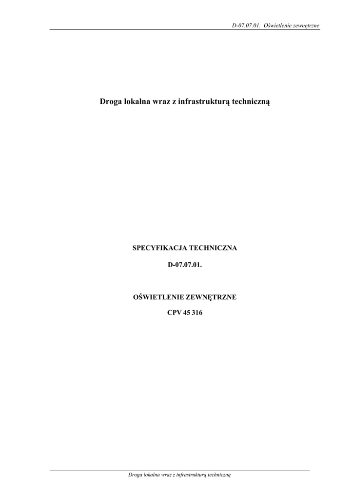 D-07.07.01. Oświetlenie zewnętrzne Droga lokalna wraz z infrastrukturą techniczną SPECYFIKACJA TECHNICZNA D-07.07.01. OŚWIETLENIE ZEWNĘTRZNE CPV 45 316 Droga lokalna wraz z infrastrukturą techniczną D-07.07.01. Oświetlenie zewnętrzne D-07.07.01 OŚWIETLENIE ZEWNĘTRZNE 1. Wstęp 1.1. Przedmiot Specyfikacji Przedmiotem niniejszej Specyfikacji Technicznej (ST) są wymagania dotyczące wykonania i odbioru robót związanych z oświetleniem zewnętrznym w zakresie przedsięwzięcia inwestycyjnego „Droga lokalna wraz z infrastrukturą techniczną” w miejscowości Gniew przy ulicy Witosa. 1.2. Zakres stosowania Specyfikacji Specyfikacja jest stosowana jako dokument przetargowy i kontraktowy przy zlecaniu i realizacji robót wymienionych w punkcie 1.1. 1.3. Zakres robót objętych Specyfikacją Ustalenia zawarte w Specyfikacji dotyczą zasad prowadzenia robót i obejmują: − budowę oświetlenia ulicznego ul. Witosa 1.4. Określenia podstawowe Określenia podane w Specyfikacji są zgodne z odpowiednimi normami i określeniami podanymi w Specyfikacji ST: D-00.00.00 „Wymagania Ogólne”. Słup oświetleniowy - konstrukcja wsporcza osadzona bezpośrednio w gruncie lub na fundamencie, służąca do zamocowania oprawy oświetleniowej na wysokości nie większej niż 14m. Wysięgnik - element rurowy łączący słup lub maszt oświetleniowy z oprawą. Oprawa oświetleniowa - urządzenie służące do rozdziału, filtracji i przekształcania strumienia świetlnego wysyłanego przez źródło światła zawierające wszystkie niezbędne detale do przymocowania i połączenia z instalacją elektryczną. Kabel - przewód wielożyłowy izolowany, przystosowany do przewodzenia prądu elektrycznego, mogący pracować pod i nad ziemią. Ustój - rodzaj fundamentu dla słupów oświetleniowych. Fundament - konstrukcja żelbetowa zagłębiona w ziemi, służąca do utrzymania słupa, masztu lub szafy oświetleniowej w pozycji pracy. Szafa oświetleniowa - urządzenie rozdzielczo-sterownicze bezpośrednio zasilające instalacje oświetleniowe. Dodatkowa ochrona przeciwporażeniowa - ochrona części przewodzących dostępnych w wypadku pojawienia się na nich napięcia w warunkach zakłóceniowych. Linia kablowa - kabel wielożyłowy lub wiązka kabli jednożyłowych w układzie wielofazowym albo kilka kabli jedno lub wielożyłowych połączonych równolegle. Łącznie z osprzętem, ułożone na wspólnej trasie i łączące zaciski tych samych dwóch urządzeń elektrycznych jedno lub wielofazowych. Trasa kablowa - pas terenu w którym ułożone są jedna lub więcej linii kablowych. Napięcie znamionowe linii - napięcie międzyprzewodowe na które linia kablowa została zbudowana. Osprzęt linii kablowej - zbiór elementów przeznaczonych do łączenia, rozgałęzienia lub zakończenia kabli. Droga lokalna wraz z infrastrukturą techniczną D-07.07.01. Oświetlenie zewnętrzne Osłona kabla - konstrukcja przeznaczona do ochrony kabla przed uszkodzeniami mechanicznymi, chemicznymi i działaniem łuku elektrycznego. Przykrycie - osłona ułożona nad kablem w celu ochrony przed mechanicznym uszkodzeniem od góry. Skrzyżowanie - takie miejsce na trasie linii kablowej, w którym jakakolwiek część rzutu poziomego linii kablowej, przecina lub pokrywa jakąkolwiek część rzutu poziomego innej linii kablowej lub innego urządzenia podziemnego. Zbliżenie - takie miejsce na trasie linii kablowej, w którym odległość między linią kablową, urządzeniem podziemnym lub drogą komunikacyjną itp. jest mniejsza niż odległość dopuszczalna dla danych warunków układania bez stosowania przegród lub osłon zabezpieczających i w którym nie występuje skrzyżowanie. Przepust kablowy - konstrukcja o przekroju najczęściej okrągłym przeznaczona do ochrony kabla przed uszkodzeniami mechanicznymi, chemicznymi i działaniem łuku elektrycznego. Pozostałe określenia podstawowe są zgodne z odpowiednimi, obowiązującymi polskimi normami oraz definicjami podanymi w ST: D-M–0.00.00. „Wymagania ogólne” 1.5. Ogólne wymagania dotyczące robót Ogólne wymagania dotyczące robót podano w Specyfikacji ST: D-00.00.00 “Wymagania Ogólne” pkt. 1.5. 2. Materiały 2.1. Ogólne wymagania Ogólne wymagania dotyczące materiałów podano w Specyfikacji ST: D-00.00.00 “Wymagania Ogólne” pkt. 2. 2.2. Materiały budowlane 2.2.1. Piasek Piasek do wykonywania robót powinien być co najmniej gatunku „3” i spełniać wymagania PN-B-11113. 2.2.3. Fundamenty prefabrykowane Pod słupy i szafy oświetleniowe zaleca się stosowanie fundamentów prefabrykowanych. Prefabrykaty powinny być wykonane wg Rysunków uwzględniających parametry wytrzymałościowe i warunki w jakich będą pracowały. Ogólne wymagania dotyczące fundamentów określone są w PN-EN 14991:2010. 2.2.4. Rury na przepusty kablowe Przepusty kablowe powinny być wykonane z materiałów trudnopalnych, wytrzymałych mechanicznie, chemicznie i odpornych na działanie łuku elektrycznego. Rury używane na przepusty powinny być dostatecznie wytrzymałe na działanie sił ściskających, z jakimi należy liczyć się w miejscu ich ułożenia. Wnętrza ścianek powinny być gładkie lub powleczone warstwą wygładzającą ich powierzchnię, dla ułatwienia przesuwania się kabli. Na przepusty kablowe dla kabli o napięciu do 1kV należy stosować rury z tworzyw sztucznych typu HDPE o średnicy wewnętrznej nie mniejszej niż 100mm. Rury z tworzyw sztucznych powinny odpowiadać wymaganiom normy PN-EN 50086. Droga lokalna wraz z infrastrukturą techniczną D-07.07.01. Oświetlenie zewnętrzne 2.3. Materiały elektryczne 2.3.1. Kable elektroenergetyczne Należy stosować kable o napięciu znamionowym 0,6/1kV o żyłach aluminiowych w izolacji polwinitowej. Przekrój żył powinien być dobrany w zależności od dopuszczalnego spadku napięcia oraz skuteczności ochrony przeciwporażeniowej. Zaleca się stosowanie kabli typu YAKY speł