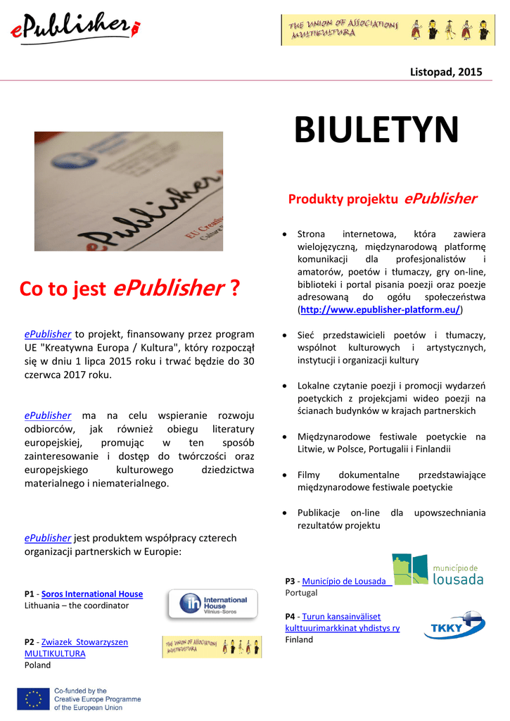 Listopad, 2015 BIULETYN Produkty projektu ePublisher Strona internetowa, która zawiera wielojęzyczną, międzynarodową platformę komunikacji dla profesjonalistów i amatorów, poetów i tłumaczy, gry on-line, biblioteki i portal pisania poezji oraz poezje adresowaną do ogółu społeczeństwa (http://www.epublisher-platform.eu/) Sieć przedstawicieli poetów i tłumaczy, wspólnot kulturowych i artystycznych, instytucji i organizacji kultury Lokalne czytanie poezji i promocji wydarzeń poetyckich z projekcjami wideo poezji na ścianach budynków w krajach partnerskich Międzynarodowe festiwale poetyckie na Litwie, w Polsce, Portugalii i Finlandii Filmy dokumentalne przedstawiające międzynarodowe festiwale poetyckie Publikacje on-line rezultatów projektu Co to jest ePublisher ? ePublisher to projekt, finansowany przez program UE "Kreatywna Europa / Kultura", który rozpoczął się w dniu 1 lipca 2015 roku i trwać będzie do 30 czerwca 2017 roku. ePublisher ma na celu wspieranie rozwoju odbiorców, jak również obiegu literatury europejskiej, promując w ten sposób zainteresowanie i dostęp do twórczości oraz europejskiego kulturowego dziedzictwa materialnego i niematerialnego. dla ePublisher jest produktem współpracy czterech organizacji partnerskich w Europie: P1 - Soros International House Lithuania – the coordinator P2 - Zwiazek Stowarzyszen MULTIKULTURA Poland P3 - Município de Lousada Portugal P4 - Turun kansainväliset kulttuurimarkkinat yhdistys ry Finland upowszechniania Listopad, 2015 Biuletyn Osiągnięcia projektu ePublisher na poziomie Międzynarodowym Spotkanie Konsorcjum Projektu na Litwie Pierwsze spotkanie konsorcjum projektu odbyło się w Wilnie na Litwie, w dniach 27-28 października 2015 roku. Na początku słowa powitalne wygłosiła Pani E. Deltuvaitė, szef biura Kreatywna Europa na Litwie. Podczas spotkania, poruszane były różne kwestie związane z realizacją projektu, takie jak zarządzanie projektem i główne obowiązki i zadania każdego z partnerów, problemy finansowe i sprawozdawcze. Zostały omówione aspekty oceny i komunikacji wewnętrznej, strategii upowszechniania projektu i materiałów, zajęcia pierwszego roku, oraz plan pracy, itd.. Podczas wizyty na Litwie, partnerzy mieli również okazję, odwiedzenia Uzupis Art Inkubator, który jest jednym z partnerów projektu. Odwiedzili także Galerie sztuki inkubatora "Galera" i "kalnas" gdzie przedstawiciel Republiki Zarzecza, przedstawił unikalność tego zjawiska, gdzie w jednym miejscu skoncentrowany jest potężny potencjał przemysłów kreatywnych i kulturalnych jak również kreowany jest ekskluzywny wizerunek miasta. W spotkaniu wzięli także udział przedstawiciele firmy Webas.lt, odpowiedzialni za stworzenie strony internetowej projektu oraz tworzenie platformy pisania poezji i tłumaczenia. Przestrzeń publiczna strony internetowej została oficjalnie otwarta w dniu 8 listopada, podczas gdy platforma zostanie otwarta do końca lutego 2016 r. Poeci z całego świata zostaną zaproszeni do publikowania i rozpowszechniania swoich wierszy, a także tłumacze do przekładania poezji na język angielski. Następne spotkanie partnerów posłuży omówieniu narzędzi on-line na stronie internetowej, a także nadchodzących imprez promujących poezje. Odbędzie się ono w marcu 2016 roku w Krakowie, Poland. Osiągnięcia projektu ePublisher na szczeblu lokalnym The Project Team Meets in Lithuania Nawiązano kontakty z partnerami towarzyszącymi projektu w Polsce W ciągu pierwszych miesięcy projektu, Związek Stowarzyszeń MULTIKULTURA nawiązał kontakty z lokalnymi przedstawicielami partnerów projektu - instytucjami i organizacjami kultury i sztuki, poetami, tłumaczami i społecznościami poetyckimi w Polsce. Lokalnymi partnerami w Polsce jest 6 organizacji: Stowarzyszenie Pisarzy Polskich Fundacja Poemat Stowarzyszenie Trzeci Tor Stowarzyszenie Edukacji MIĘDZYPOKOLENIOWEJ KORBOTURBINA Stowarzyszenie MUZYKA Centrum Stowarzyszenie Zgniatacz Dźwięków Contact e-mail: [email protected]