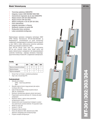 Moduł Telemetryczny • • • • • • • • • • • MT-30x Transmisja pakietowa GSM/GPRS Integralny modem GSM 850/900/1800/1900 Autonomiczne logowanie się do sieci GSM/GPRS Wejścia binarne (MT-301/302/303/304) Wyjścia binarne (MT-301/303) Wejścia analogowe 4-20 mA (MT-301/304) Praca zdarzeniowa Integralny akumulator Li-Polymer Możliwość montażu na szynie DIN Rozłączalne listwy zaciskowe Łatwa samodzielna konfiguracja Wykorzystujące najnowsze rozwiązania technologii GSM/ GPRS Moduły Telemetryczne MT-301/302/303/304 są dedykowanymi, zorientowanymi na rynek monitoringu urządzeniami udostępniającymi możliwość transmisji danych w sieci GSM w trybie jednoczesnej transmisji pakietowej GPRS oraz przesyłania wiadomości SMS. Seria MT-3xx oferuje wiele zalet serii profesjonalnej MT-1xx przy znacznie niższej cenie, dzięki czemu jest bardzo ekonomicznym rozwiązaniem dla bezprzewodowych systemów monitoringu i zdalnego sterowania niewymagających komunikacji modułu MT z urządzeniami zewnętrznymi. MT- 301 302 303 304 Wejścia binarne/licznikowe Wyjścia binarne Wejścia analogowe 4 2 2 8 - 6 2 - 7 1 • • Pamięć Flash na firmware z możliwością aktualizacji Zegar czasu rzeczywistego RTC Funkcjonalność • • • • • • • • • • • • Sposoby komunikacji -- GPRS - transmisja pakietowa -- SMS Wszystkie wejścia binarne mogą pracować jako wejścia licznikowe (5Hz max) Łatwa konfiguracja zdarzeniowego wysyłania danych, SMS-ów i wydzwaniania Możliwość samodzielnego zgłaszania zdarzeń alarmowych Programowalne poziomy alarmowe (4) i histereza dla wejść analogowych Możliwość lokalnej i zdalnej zmiany parametrów konfiguracyjnych modułu Zabezpieczenie przed nieuprawnionym dostępem w postaci listy uprawnionych numerów telefonów i IP, opcjonalnie hasło Montaż na szynie DIN Zasilanie 9...30V DC Rozłączalne listwy zaciskowe Diody LED (aktywność GSM, status/tryb pracy GSM, aktywność szeregowego portu konfiguracyjnego) Przyjazne narzędzia konfiguracyjne MT-301/302/303/304 Zasoby Dane Techniczne MT-30x Ogólne Oprogramowanie konfiguracyjne Wymiary (dł. x szer. x wys.) 124x63x30 mm Waga 100 g Sposób mocowania DIN Rail 35mm 01) ... +55°C Temperatura pracy Klasa ochrony IP40 1) Temperatury pracy poniżej 0°C nie są rekomendowane ze względu na wymagania dla baterii LI-Polymer Modem GSM/GPRS WAVECOM WIRELESS CPU Typ modemu GSM Czterozakresowy (850/900/1800/1900) Rysunki i wymiary (wszystkie wymiary w milimetrach) Zakresy częstotliwości: GSM 850 Nadajnik: 824MHz – 849 MHz Odbiornik: 869 – 894 MHz EGSM 900 Nadajnik: 880MHz – 915 MHz Odbiornik: 925 – 960 MHz DCS 1800 Nadajnik: 1710MHz – 1785 MHz Odbiornik: 1805 – 1880 MHz PCS 1900 Nadajnik: 1850 – 1910 MHz Odbiornik: 1930 – 1990 MHz Moc szczytowa nadajnika GSM850/EGSM900 33 dBm (2W) stacja klasy 4 Moc szczytowa nadajnika DCS1800/PCS1900 30 dBm (1W) stacja klasy 1 Modulacja 0,3 GMSK Odstęp międzykanałowy 200 kHz 50Ω Antena Zasilanie Napięcie stałe (DC) Prąd wejściowy (A) (dla 12 V DC) 9 ... 30 V Idle 0,02 MT-301/302/303/304 Wewnętrzna bateria Li-Polymer Max 0,50 900 mAh Wejścia I1...I4 Zakres napięcia wejściowego Rezystancja wejściowa 0 ... 30V 5,4 kΩ Wejściowe napięcie ON (1) > 9V Wejściowe napięcie OFF (0) 0 ... 3V Podłączenie podstawowe Wyjścia Q1...Q2 Zalecany średni prąd dla pojedynczego wyjścia Prąd dla pojedynczego wyjścia Spadek napięcia dla 350mA 50mA 350mA max. <0,5V Wejścia analogowe A1, A2 (4...20 mA) Zakres pomiarowy 4...20mA Rezystancja wejściowa 100Ω typ. Spadek napięcia dla 20mA <2V max. Przetwornik A/D 10 bitów +/−3% max. Dokładność Dodatkowe informacje: INVENTIA Sp. z o.o. ul. Kulczyńskiego 14, 02-777 Warszawa tel.: +48 22 545-32-00, 545-32-01 fax: +48 22 643-14-21 [email protected], www.inventia.pl [email protected], www.telemetria.pl INVENTIA stosuje certyfikowany System Zarządzania Jakością ISO 9001:2000. Projekt jest współfinansowany przez Unię Europejską ze środków Europejskiego Funduszu Rozwoju Regionalnego.