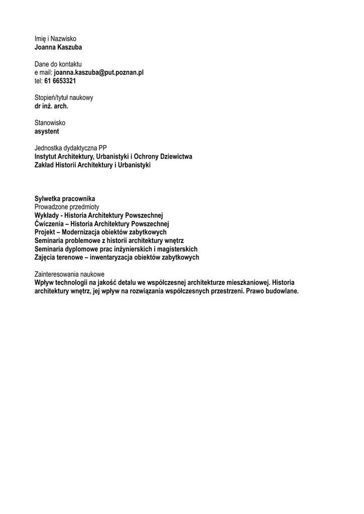 Imię i Nazwisko Joanna Kaszuba Dane do kontaktu e mail: [email protected] tel: 61 6653321 Stopień/tytuł naukowy dr inż. arch. Stanowisko asystent Jednostka dydaktyczna PP Instytut Architektury, Urbanistyki i Ochrony Dziewictwa Zakład Historii Architektury i Urbanistyki Sylwetka pracownika Prowadzone przedmioty Wykłady - Historia Architektury Powszechnej Ćwiczenia – Historia Architektury Powszechnej Projekt – Modernizacja obiektów zabytkowych Seminaria problemowe z historii architektury wnętrz Seminaria dyplomowe prac inżynierskich i magisterskich Zajęcia terenowe – inwentaryzacja obiektów zabytkowych Zainteresowania naukowe Wpływ technologii na jakość detalu we współczesnej architekturze mieszkaniowej. Historia architektury wnętrz, jej wpływ na rozwiązania współczesnych przestrzeni. Prawo budowlane.