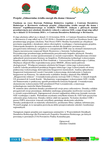 Projekt „Odnawialne źródła energii dla domu i biznesu” Fundacja na rzecz Rozwoju Polskiego Rolnictwa wspólnie z Centrum Doradztwa Rolniczego w Brwinowie realizacje projekt „Odnawialne źródła energii dla domu i biznesu” współfinansowanego ze środków NFOŚiGW. Jednym z głównych działań przedsięwzięcia jest szkolenie doradców rolnych z zakresu OZE, a jego drugi etap odbył się w dniach 12-16 kwietnia 2010 r. w Centrum Doradztwa Rolniczego w Brwinowie. II etap szkolenia odbył się w dniach 12-16 kwietnia 2010t. w Centrum Doradztwa Rolniczego w Brwinowie (I etap odbył się 8-12.03.2010r.). Doradców powitał Z-ca Dyrektora Jacek Lupa przedstawiając program szkolenia. Pani Prezes FDPA Monika Szymańska po oficjalnym powitaniu uzgodniła z doradcami zakres obowiązków wynikający z harmonogramu projektu. Zobowiązała doradców do zorganizowania szkoleń dla doradców powiatowych i przygotowania informacji o projekcie w czasopismach ODR oraz na stronach internetowych. Zajęcia merytoryczne rozpoczął Marek Hryniewicz z Instytutu TechnologicznoPrzyrodniczego przedstawiając problematykę pozyskiwania biopaliw płynnych. Doradcy dzielili się szeroko swoimi spostrzeŜeniami ze swoich województw. Skonsultowano równieŜ opłacalność przetwarzania biomasy na biopaliwa. Problematykę technologii wykorzystania biopaliw stałych kontynuował dr Piotr Gradziuk z Uniwersytetu Przyrodniczego z Lublina. Słuchacze obejrzeli film wyprodukowany przez IBMER „Słoma tanim paliwem ekologicznym”. Wiodącym tematem szkolenia był biogaz i róŜne jego wykorzystanie. Ludwik Latocha przedstawił produkcję biogazu rolniczego i jego wykorzystanie od strony praktycznej wykorzystując doświadczenia biogazowni niemieckich. Analizę opłacalności biogazowni kontynuował Leszek Ciurzyński wykorzystując doświadczenia w budowie biogazowni na Pomorzu. Na zakończenie wykładów doradcy obejrzeli film IBMER „Biogazownie rolnicze”. Uwarunkowania prawne rozwoju OZE w Polsce i w innych krajach UE przestawił dr Leszek Karski. Mechanizmy wspomagające wykorzystanie OZE i źródła ich finansowania w praktyczny sposób przedstawiła GraŜyna Kasprzak. Uwarunkowania ekonomiczne wykorzystania OZE przedstawił Piotr Lewandowski, a innowacje technologiczne omówiła Marta Domańska. W ostatnim dniu szkolenia doradcy przedstawiali swoje prace zaliczeniowe. Doradcy solidnie przygotowali swoje prezentacje, dokładnie analizując potencjalne moŜliwości rozwoju OZE w swoich województwach. Zaproponowali równieŜ najbardziej efektywne kierunki rozwoju OZE wynikające z analiz. Warunkiem uzyskania certyfikatu trenera ds. OZE było pozytywne zaliczenie pracy końcowej. Doradcy dobrze zdali ten egzamin. Na koniec dyrektor CDR i prezes FDPA uroczyście wręczali certyfikaty gratulując ukończenie szkolenia. Doradcy podziękowali za materiały szkoleniowe, przekazane filmy i plakaty informacyjne. Wyrazili pogląd, Ŝe te narzędzia pozwolą na dobre przeprowadzenie szkoleń i konferencji regionalnych. Następnym etapem projektu jest organizacja seminariów w Wojewódzkich Ośrodkach Doradztwa Rolniczego dla Powiatowych Zespołów Doradztwa Rolniczego, po których powstaną w powiatach (314) Powiatowe Punkty Konsultacyjne. Opracował: Zdzisław Ginalski