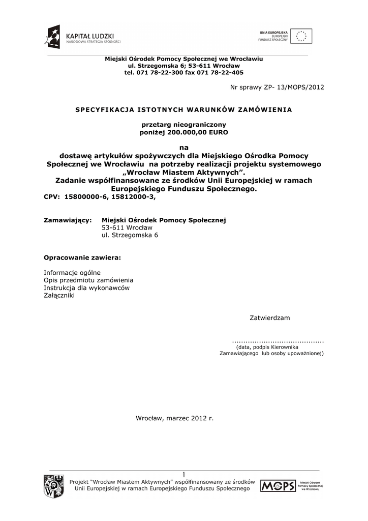 Miejski Ośrodek Pomocy Społecznej we Wrocławiu ul. Strzegomska 6; 53-611 Wrocław tel. 071 78-22-300 fax 071 78-22-405 Nr sprawy ZP- 13/MOPS/2012 SPE C YF I K AC J A IST O T N Y CH W AR U N K Ó W Z A M Ó W IE N I A przetarg nieograniczony poniŜej 200.000,00 EURO na dostawę artykułów spoŜywczych dla Miejskiego Ośrodka Pomocy Społecznej we Wrocławiu na potrzeby realizacji projektu systemowego „Wrocław Miastem Aktywnych”. Zadanie współfinansowane ze środków Unii Europejskiej w ramach Europejskiego Funduszu Społecznego. CPV: 15800000-6, 15812000-3, Zamawiający: Miejski Ośrodek Pomocy Społecznej 53-611 Wrocław ul. Strzegomska 6 Opracowanie zawiera: Informacje ogólne Opis przedmiotu zamówienia Instrukcja dla wykonawców Załączniki Zatwierdzam ......................................... (data, podpis Kierownika Zamawiającego lub osoby upowaŜnionej) Wrocław, marzec 2012 r. 1 SPIS TREŚCI SPECYFIKACJA ISTOTNYCH WARUNKÓW ZAMÓWIENIA na dostawę artykułów spoŜywczych dla Miejskiego Ośrodka Pomocy Społecznej we Wrocławiu na potrzeby realizacji projektu systemowego „Wrocław Miastem Aktywnych”. Zadanie współfinansowane ze środków Unii Europejskiej w ramach Europejskiego Funduszu Społecznego. CPV: 15800000-6, 15812000-3, I. Postanowienia ogólne II. Opis przedmiotu zamówienia III. Instrukcja dla wykonawcy 1. Opis przygotowania oferty. 2. Warunki udziału w postępowaniu oraz opis sposobu dokonywania oceny spełniania tych warunków. 3. Wy m ag an e d oku m en t y. 4. Kryteria oceny ofert i zasady ich oceny. 5. Opis sposobu obliczenia ceny. 6. Ocena oferty. 7. Wymagany termin realizacji zadania. 8. Udzielanie wyjaśnień dotyczących SIWZ. 9. Sposób, miejsce i termin składania oferty. 10. Miejsce i termin otwarcia ofert. 11. Termin związania ofertą. 12. Informacje o zasadach otwarcia i ocenie ofert. 13. Osoby uprawnione do kontaktowania się z wykonawcami. 14. Istotne postanowienia do umowy oraz formalności jakie musi spełnić wykonawca przed podpisaniem umowy. 15. MoŜliwe zmiany w zawartej umowie oraz warunki takiej zmiany. 16. Środki ochrony prawnej przysługujące wykonawcy. IV. Załączniki Załącznik Załącznik Załącznik Załącznik Załącznik Załącznik nr nr nr nr nr nr 1– 2– 2a – 3– 4– 5– Formularz oferty Oświadczenie wykonawcy Oświadczenie wykonawcy Zestawienie kosztów zadania Doświadczenie zawodowe Projekt umowy 2 SPECYFIKACJA ISTOTNYCH WARUNKÓW ZAMÓWIENIA I. Postanowienia ogólne Miejski Ośrodek Pomocy Społecznej, z siedzibą we Wrocławiu przy ul. Strzegomskiej 6, tel. 071-78-22-300; fax. 071-78-22-405 zwany dalej Zamawiającym, zaprasza do udziału w przetargu nieograniczonym na dostawę artykułów spoŜywczych dla Miejskiego Ośrodka Pomocy Społecznej we Wrocławiu na potrzeby realizacji projektu systemowego „Wrocław Miastem Aktywnych”. Zadanie współfinansowane ze środków Unii Europejskiej w ramach Europejskiego Funduszu Społecznego. 1. Postępowanie prowadzone jest zgodnie z ustawą z dnia 29 stycznia 2004 r. - Prawo zamówień publicznych (tekst jednolity Dz. U. z 2010 r. Nr 113, poz. 759 ze zm.), zwaną w dalszej części „ustawą” lub „PZP”. 2. Do czynności podejmowanych przez Zamawiającego i Wykonawcę stosować się będzie przepisy ustawy z dnia 23 kwietnia 1964 r. – Kodeks cywilny (Dz. U. Nr 16, poz. 93 ze zm.), jeŜeli przepisy PZP nie stanowią inaczej. 3. Ogłoszenie o zamówieniu zamieszczono na portalu UZP w Biuletynie Zamówień Publicznych, na tablicy ogłoszeń w siedzibie Zamawiającego oraz na stronie internetowej Zamawiającego www.mops.wroclaw.pl. 4. Zgodnie z art. 27 PZP, wszelkie oświadczenia, wnioski, zawiadomienia, pytania i informacje Zamawiający i Wykonawcy muszą przekazywać pisemnie. Dopuszcza się formę faksu, pod warunkiem niezwłocznego potwierdzenia oryginałem. Zamawiający dopuszcza porozumiewanie się za pomocą poczty elektronicznej tylko w przypadku braku faksu u Wykonawcy, lub braku moŜliwości przesłania drogą faksową dokumentacji (faks uszkodzony), pod warunkiem niezwłocznego potwierdzenia oryginałem. 5. SIWZ dostępna jest na stronie internetowej Zamawiającego www.mops.wroclaw.pl. Na stronie tej znajdować się będą pytania zadawane przez Wykonawców i odpowiedzi, zmiany SIWZ dokonywane przez Zamawiającego oraz ewentualne informacje o środkach ochrony prawnej. 6. Rozliczenia między Zamawiającym a Wykonawcą prowadzone będą w PLN. 7. Wymaga się, aby Wykonawca zdobył wszystkie informacje, które są niezbędne do przygotowania oferty oraz podpisania umowy. 8. Wybrany Wykonawca jest zobowiązany do zawarcia umowy w terminie i miejscu wyznaczonym przez Zamawiającego. 9. Oferta musi obejmować całość zamówienia, nie dopuszcza się składania ofert częściowych i wariantowych. 10. Zamawiający nie przewiduje aukcji elektronicznej, dynamicznego systemu zakupów i umów ramowych. 11. Zamawiający nie przewiduje udzielenie zamówień uzupełniających o których mowa w art. 67 ust. 1 pkt. 7 PZP, 12. Zamawiający nie przewiduje zebrania wykonawców. 13. Wykonawca winien zaakceptować warunki zawarte w niniejszej Specyfikacji Istotnych Warunków Zamówienia (SIWZ) zwanej takŜe „specyfikacją”. 14. Wykonawca powinien zapoznać w niniejszej specyfikacji. się ze wszystkimi wymaganiami określonymi 15. Wykonawca ponosi wszelkie koszty związane z przygotowaniem i złoŜeniem oferty. 3 16. Zgodnie z art. 42 ust. 2 Zamawiający przekazuje SIWZ Wykonawcy w terminie 5 dni od otrzymania wniosku. II. Opis przedmiotu zamówienia Przedmiotem zamówienia jest dostawa artykułów spoŜywczych dla Miejskiego Ośrodka Pomocy Społecznej we Wrocławiu na potrzeby realizacji projektu systemowego „Wrocław Miastem Aktywnych”. Zadnie współfinansowane jest ze środków Unii Europejskiej w ramach Europejskiego Funduszu Społecznego. CPV: 15800000-6, 15812000-3, 1. Zamawiający podzielił zamówienie na 7 pakietów ze względu na miejsce 